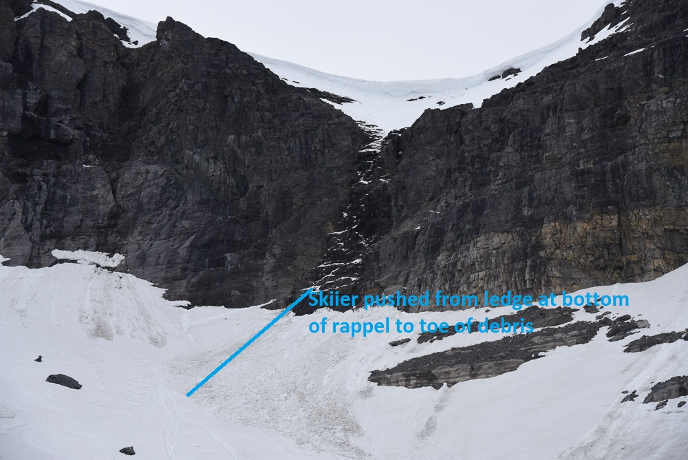 The skier had finished rappelling down the final rock band on the established rappel route when he was struck by debris from a cornice that released overhead. He travelled approximately 40 meters in the debris, landing on the surface and sustaining a back injury. The skiers were descending the rock band one at a time and no other individuals were hit by debris. The group had knowledge and experience travelling in avalanche terrain and had done thorough route planning before commencing their trip. They were on the rappels around 10 am on an overcast day, but there had been no freeze the night before.