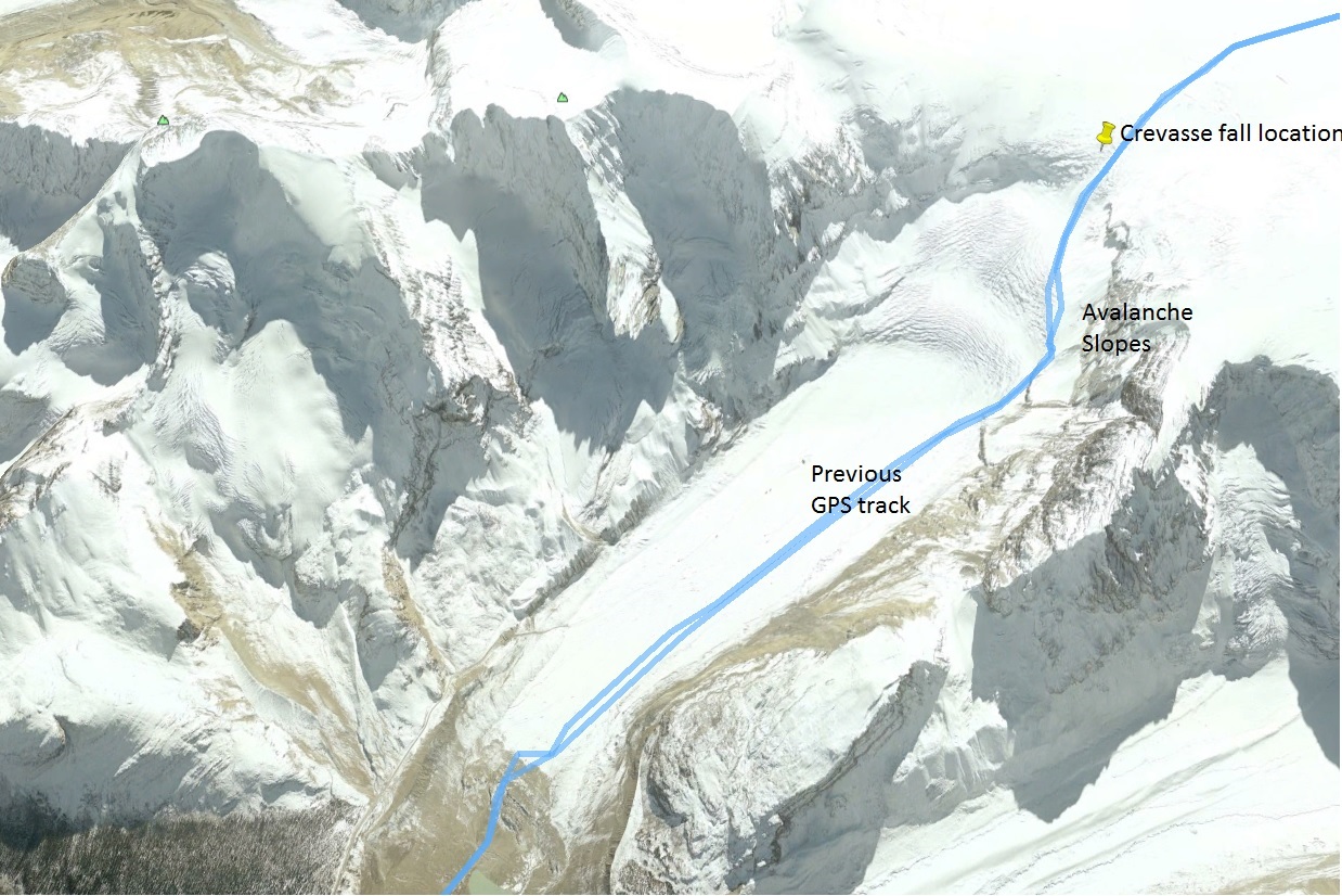 They made good progress to the end of the snowcoach road, and decided to proceed further when the weather was not as bad as they had expected. Following a GPS track they had downloaded from a travel website (from April 2015), they proceeded up the North side of the Athabasca Glacier. They made it to the top of the third step, when one of the party fell in to a crevasse.