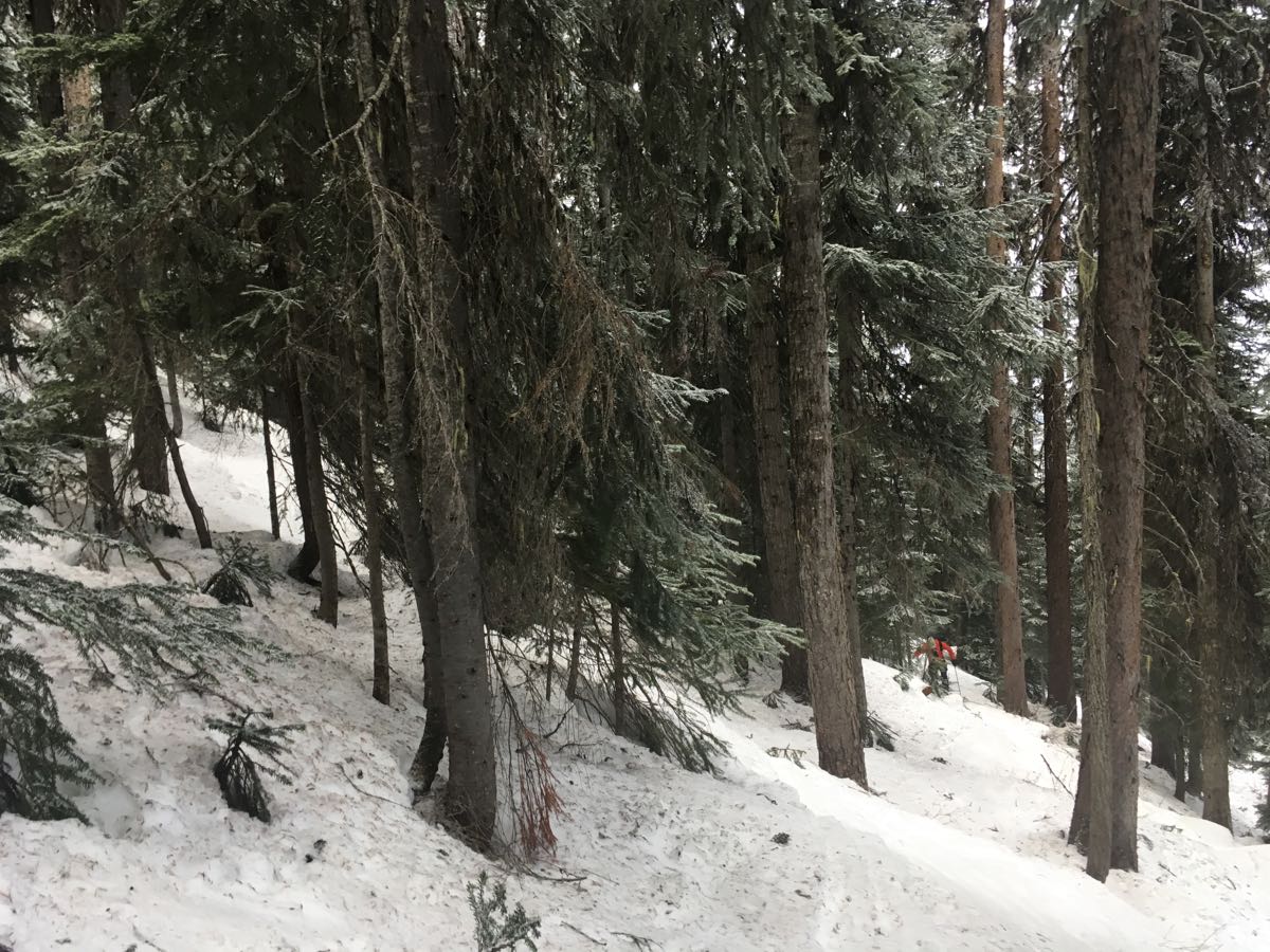 Polar aspects are skiing great on open slopes down to at least 1600m with 20cm ski penetration. The new snow was sluffing dry and easily on the crust in steep terrain on solar aspects in reaction to skier input. Anything under a tree canopy is variably unpleasant as the the picture can attest to.