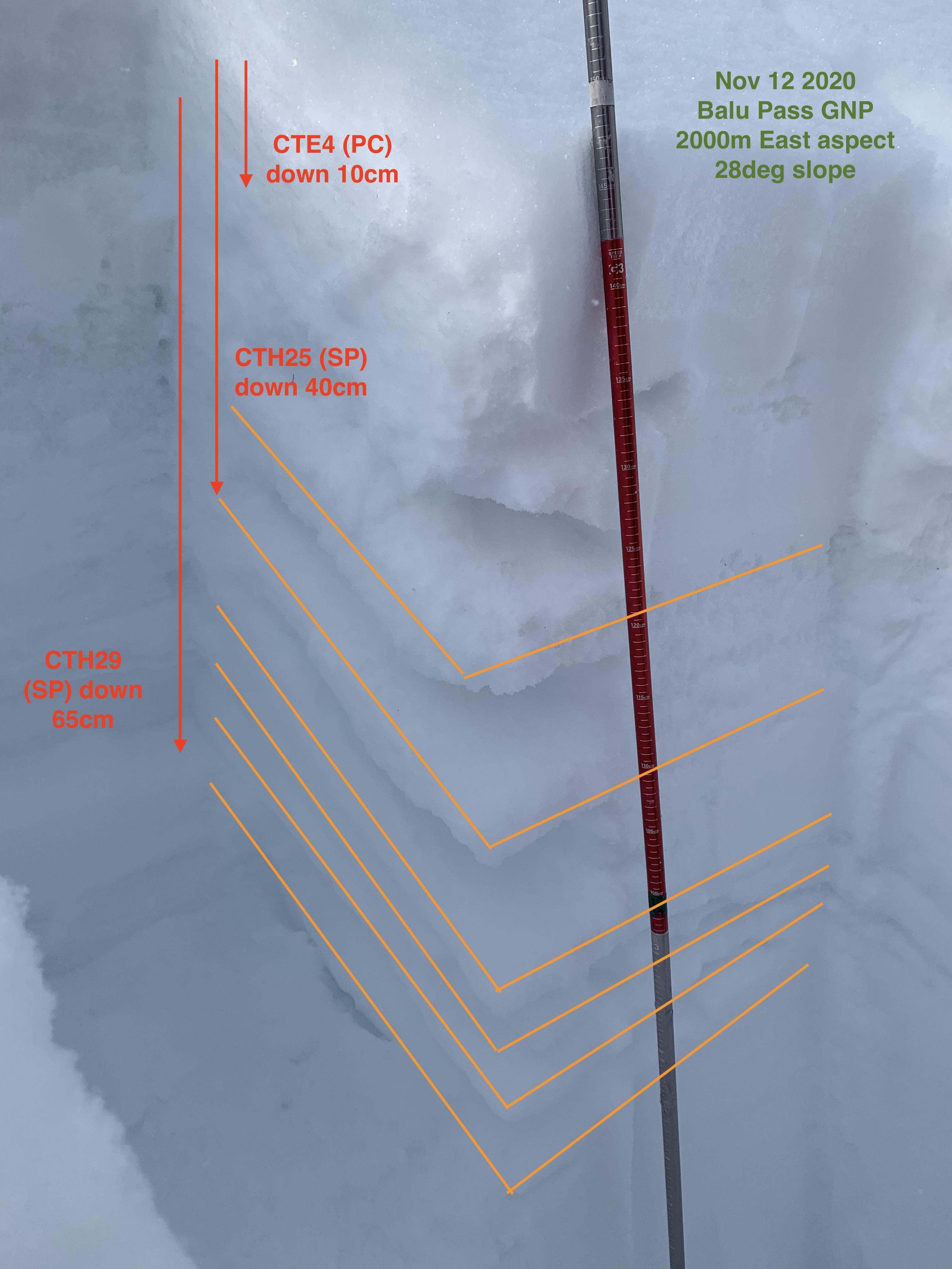 Did a bit of digging in the snow at Balu Pass today. At 2000m there is 10-20cm of new snow over the uppermost crust (the Nov 5 rain crust). Also there are 6 distinct crusts in the top meter of the snowpack. Each was Knife (K) harness, with soft (4F) facets underneath. The attached photo highlights the crusts. We got hard sudden planar results down 40 and 65cm with the weak layers being the weak facets on either side of the crust. Keep these layers in mind when heading to Rogers Pass early this season, they are likely going to be with us as a stability concern for a while. The 10-20cm new snow over the Nov 5 crust didn't have any evidence of wind effect all the way up to 2450m at Balu Pass, but was very easily sluffing off the crust if disturbed. Up higher off 8812 Peak we saw a natural size 1.5 avalanche that ran into the 8812 ski line, which we suspect was a result of wind loading. The new snow also makes it look much more filled in that a week ago, but there are plenty of early season hazards lurking just underneath the surface of the fluff.