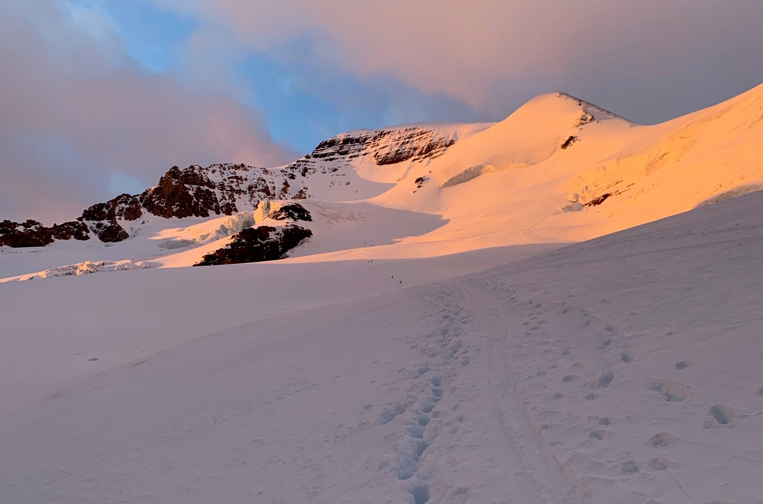 Climbed the N. Face Bypass on Thursday, June 11th. The Columbia Icefields area is still holding considerable snow with 150 - 200cms probed on the approach. Cooler temps made for great travel on the glacier with no more than boot top penetration and minimal avalanche concerns. I would expect this to change without a decent freeze, and given all the snow, it could quickly turn into wallowing.