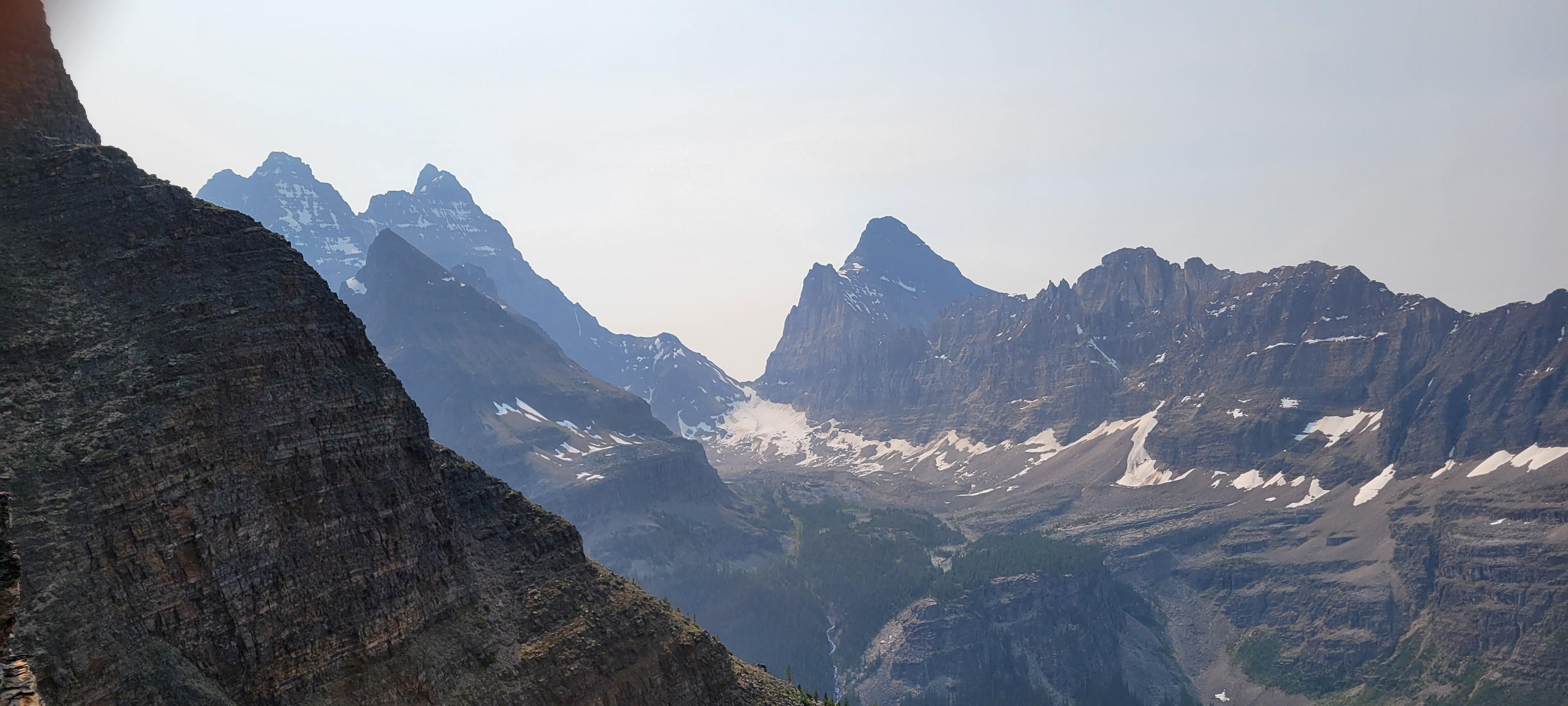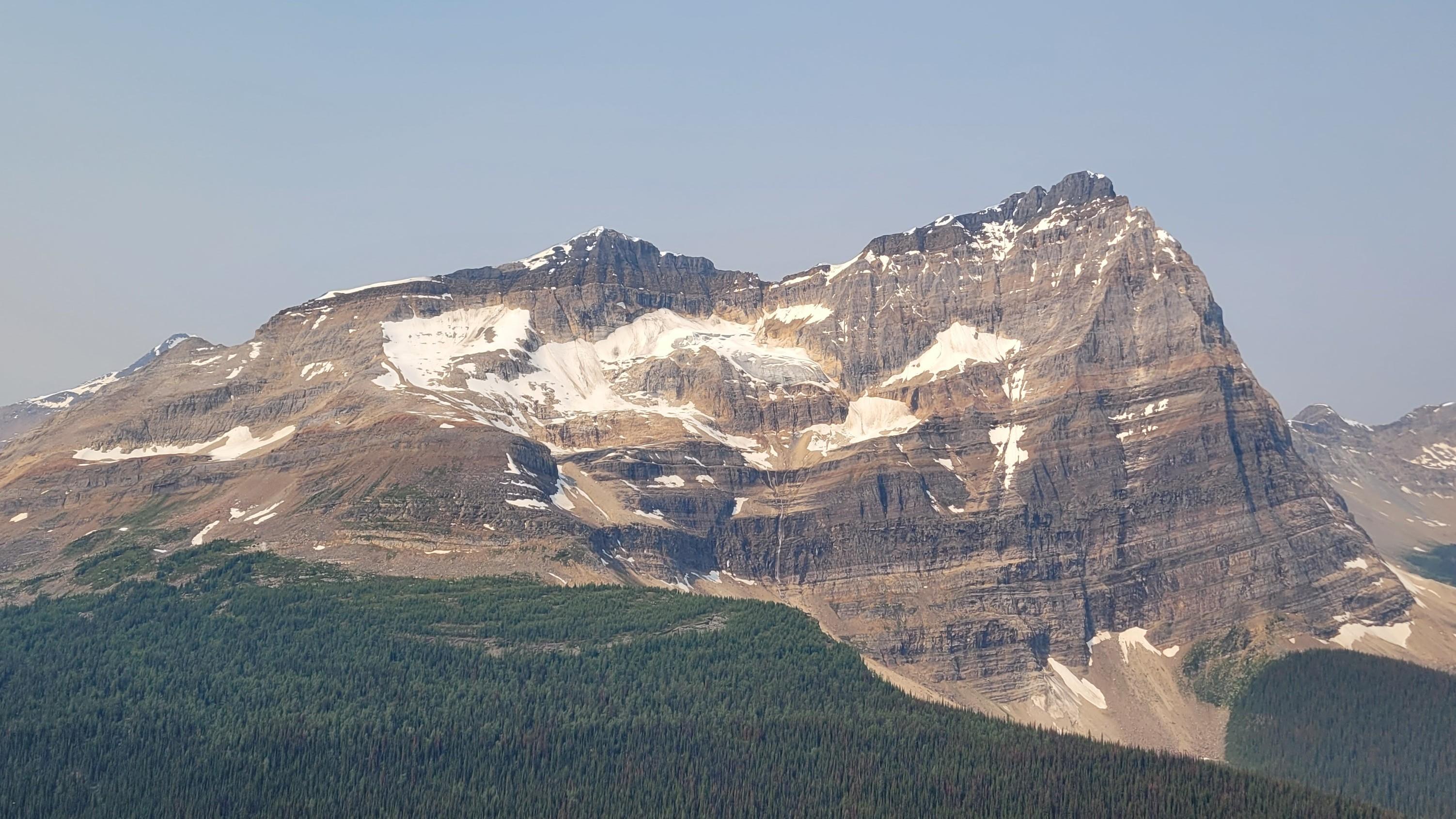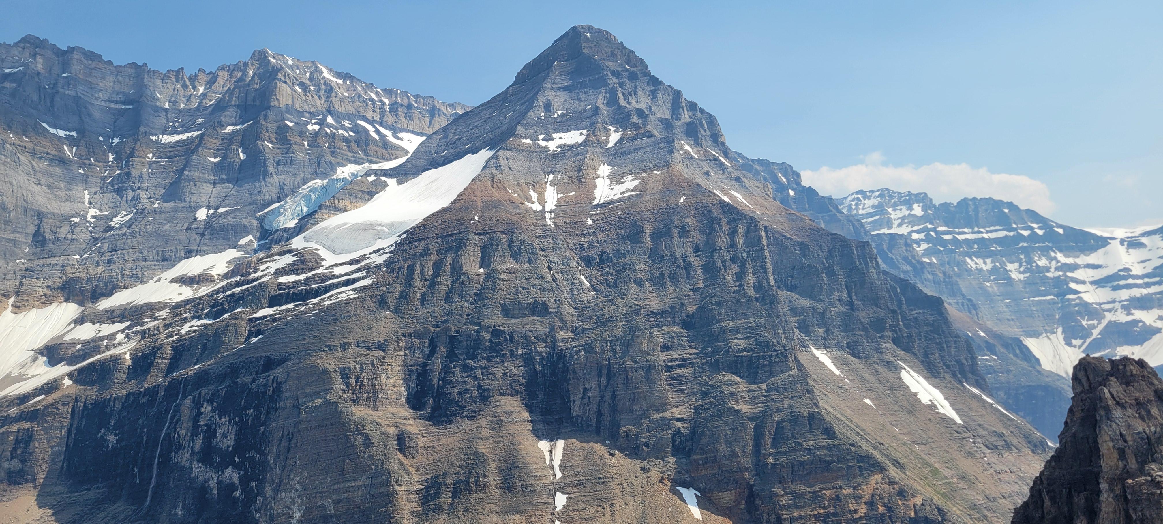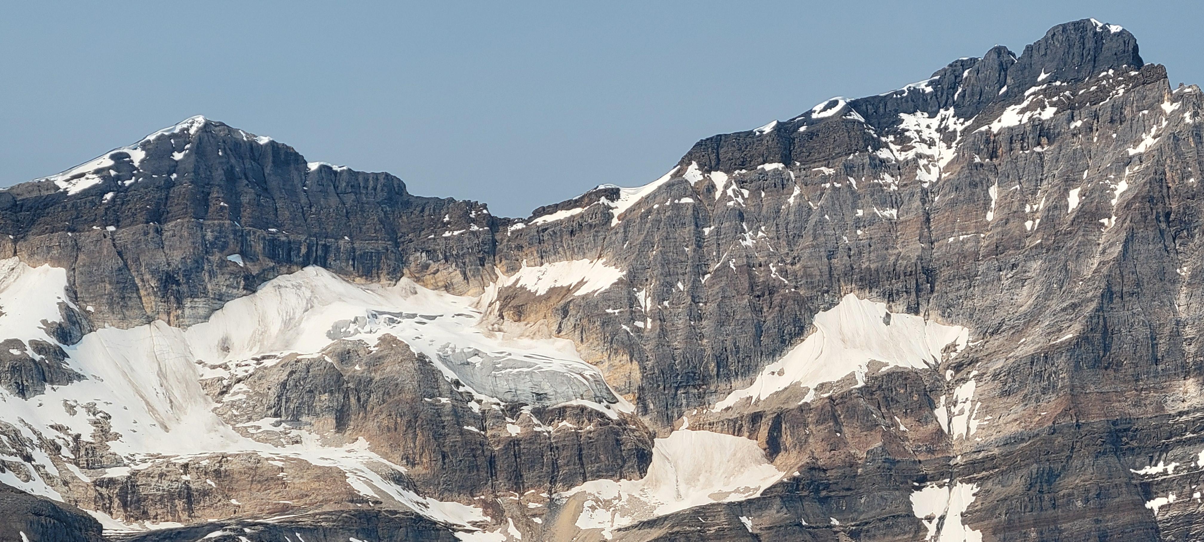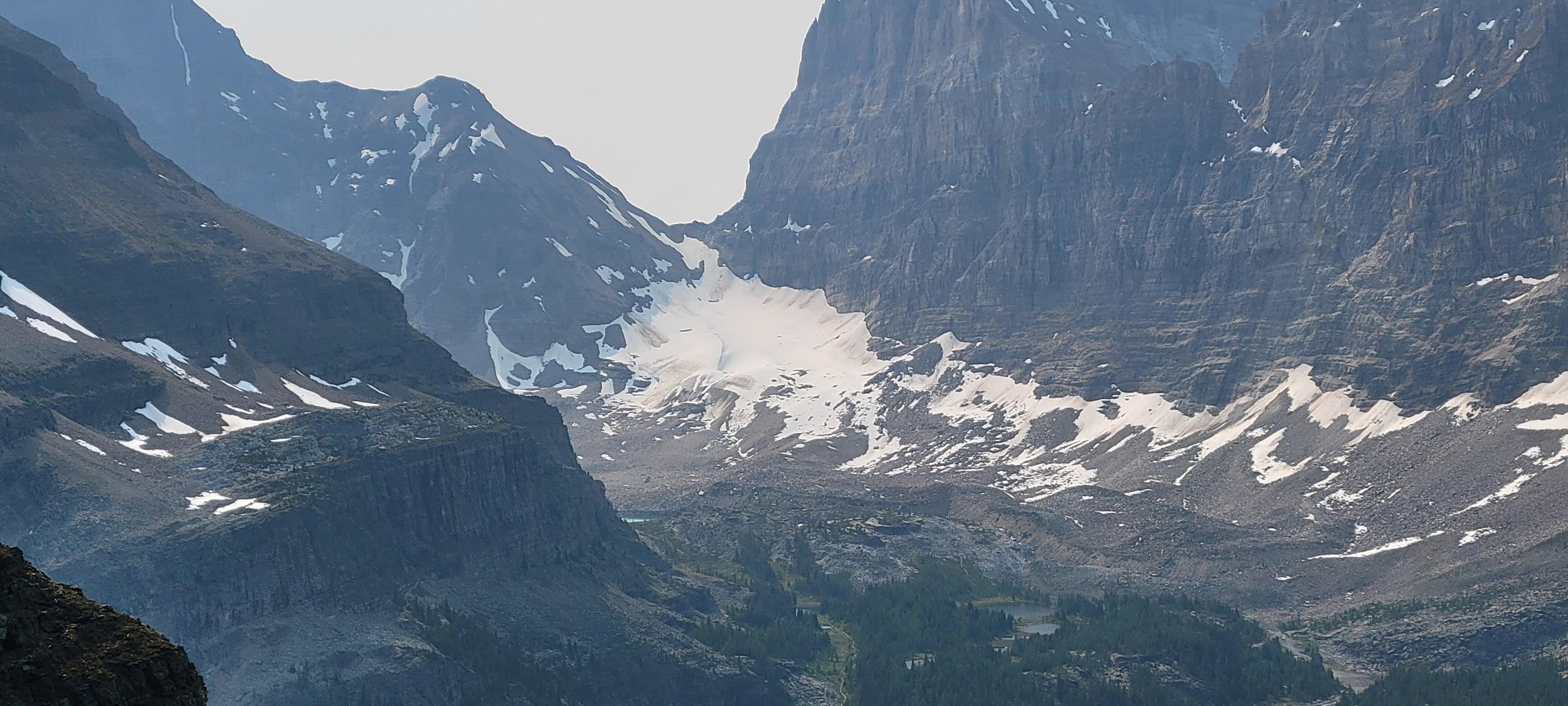 The Odaray Glacier is mostly snow-covered, as is the approach to the Huber-Victoria Col. The Hungabee West Ridge is mostly snow-free, though some lingering patches may still produce rockfall, and the Opabin Glacier remains snow-covered.