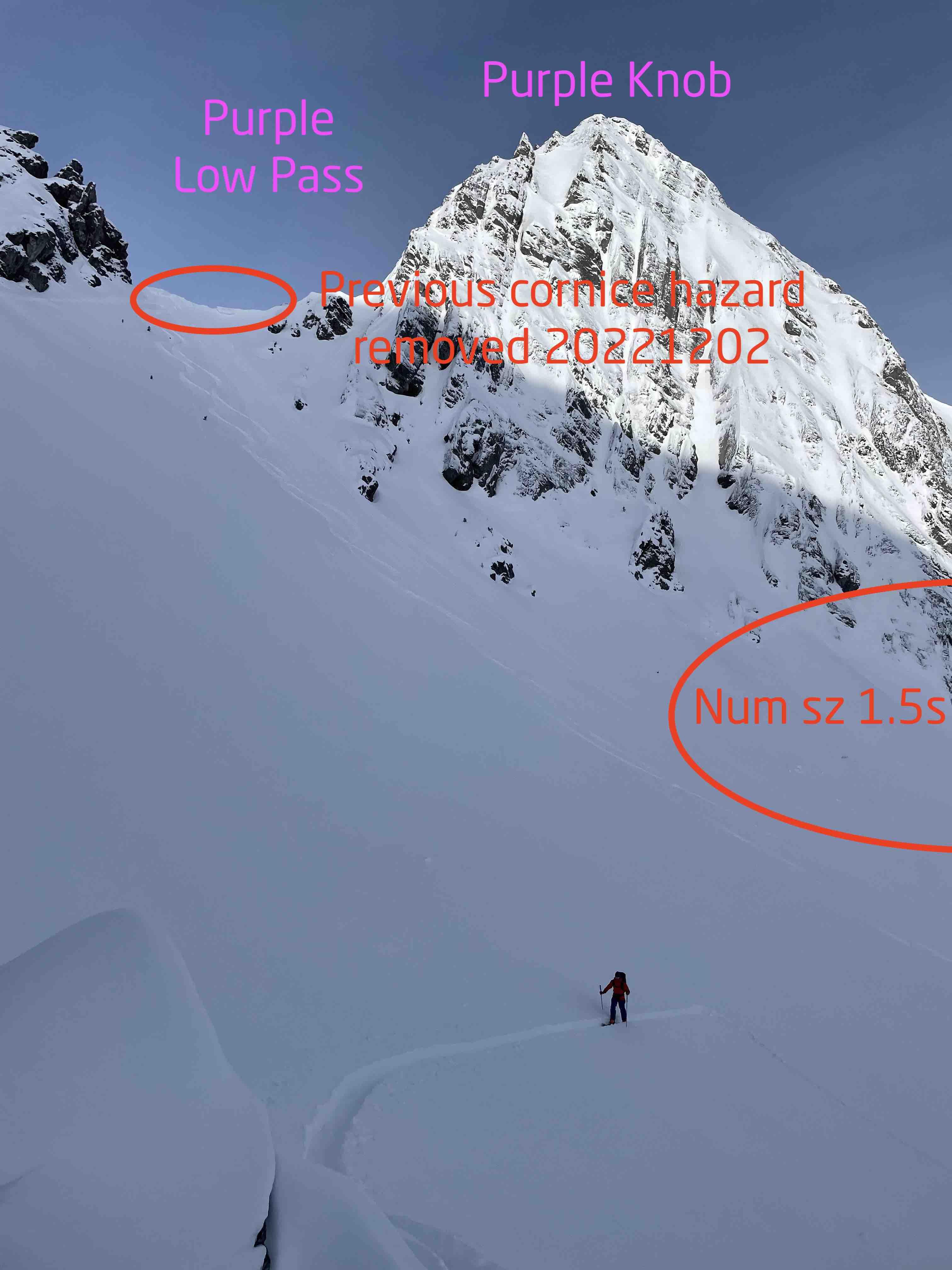 With these observations, I ventured around Blacksmith Ridge Friday into the south bowl below Purple Low Pass. Two small cornices had formed in the past week in the col. There was evidence of a wide spread hard slab cycle off the south face of Purple knob (5-6 sz 1.5s) stopping on a narrow bench mid track. There were no avalanches in the bowl itself. All previous tracks and avalanches were covered by the Nov 24 and Dec 1 cycles. Of note, there were several micro loose dry avalanches stopping in track, which I suspect occurred due to faceting of the Dec 1 cycle and running on the interface with the Nov 24. None of these micro avalanches stepped down into the Nov 24 storm snow. This was my fourth day in the zone in the past two weeks. I chose to set an up track on the right side of the boulder field. This zone is generally 25 degree terrain and similar aspect to the zone where I had a large whumpf on Monday albeit well below ridge top. There was no whumpfing of the buried wind slab in the boulders, which gave me the confidence to set an uptrack to Purple Low Pass. At this time the 50cm of storm snow has settled and is unreactive to rider traffic and to cornice control (I skied and shovelled off the two small cornices) on the buried wind slab. We skied blissful cold powder in the bowl.