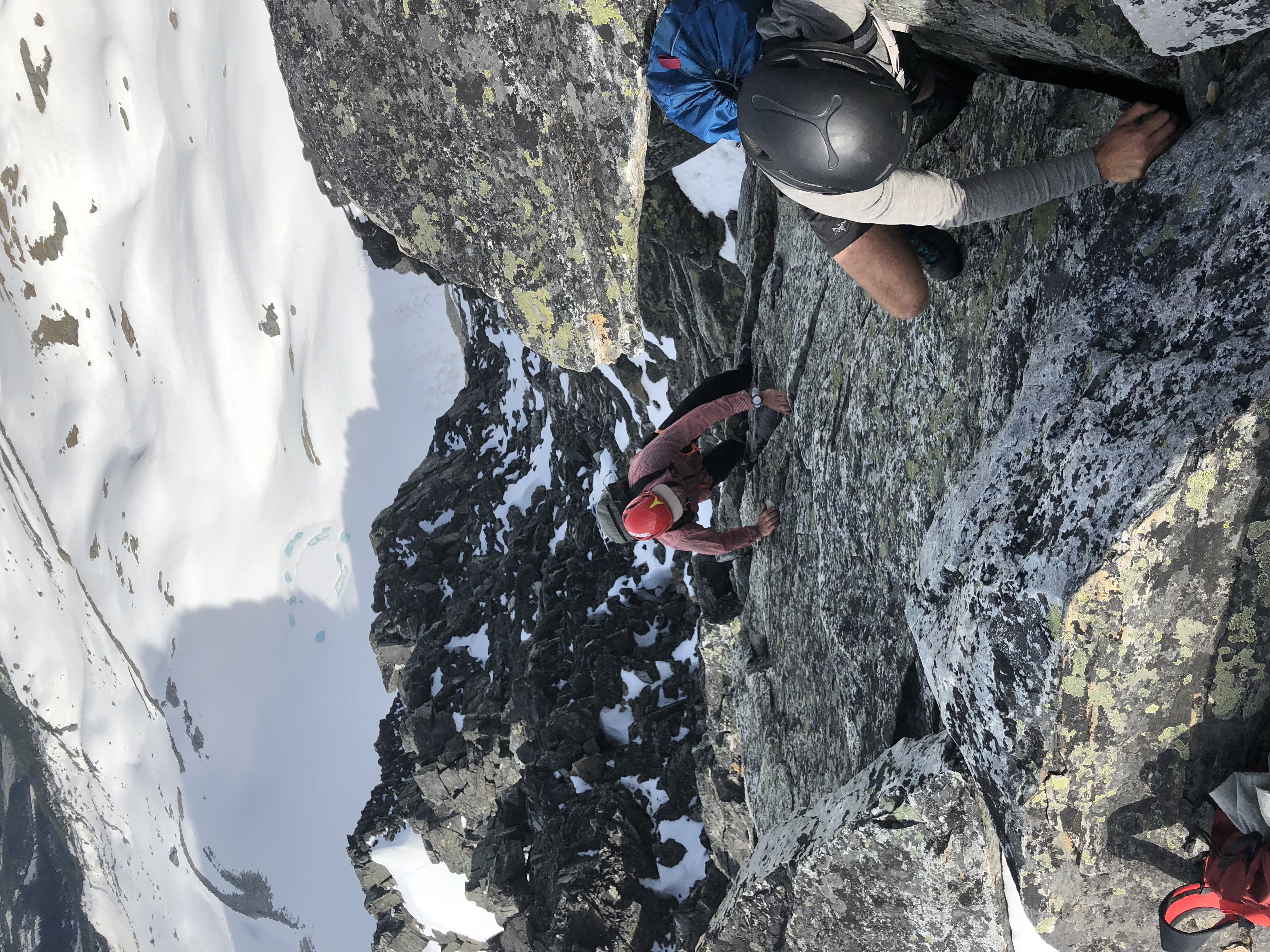 The trail in has several trees across at the practice slopes, river crossings are easy. Snow is encountered around 1500m, it froze over night and travel was great. No crampons needed. We followed the Moraine up high and crossed under Sir Donald. The climbing was clean, with snow found on ledges. Boot skiing/butt sliding down the couloir was great and travel across the flats to the campground was easy, we were descending by 11 am and found some isothermal moments. Overall pretty great travel and climbing conditions