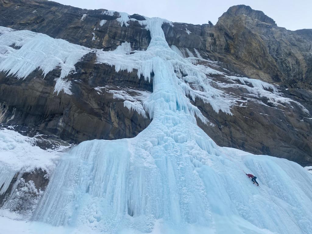 Climbed Curtain Call with Mountain Guide Matt Reynolds and Jasper Parks Public Safety Specialist Jesse Milner. As previously reported on social media, the easier left side of the first pitch is pouring water. The right side sports a well protected roof pull at half height that had Jesse joking about sport climbing at the gym. The second pitch starts steep but quickly backs off. Good screws and ice throughout, and a very thick pillar, make for enjoyable climbing with no worries about the stability of the formation.