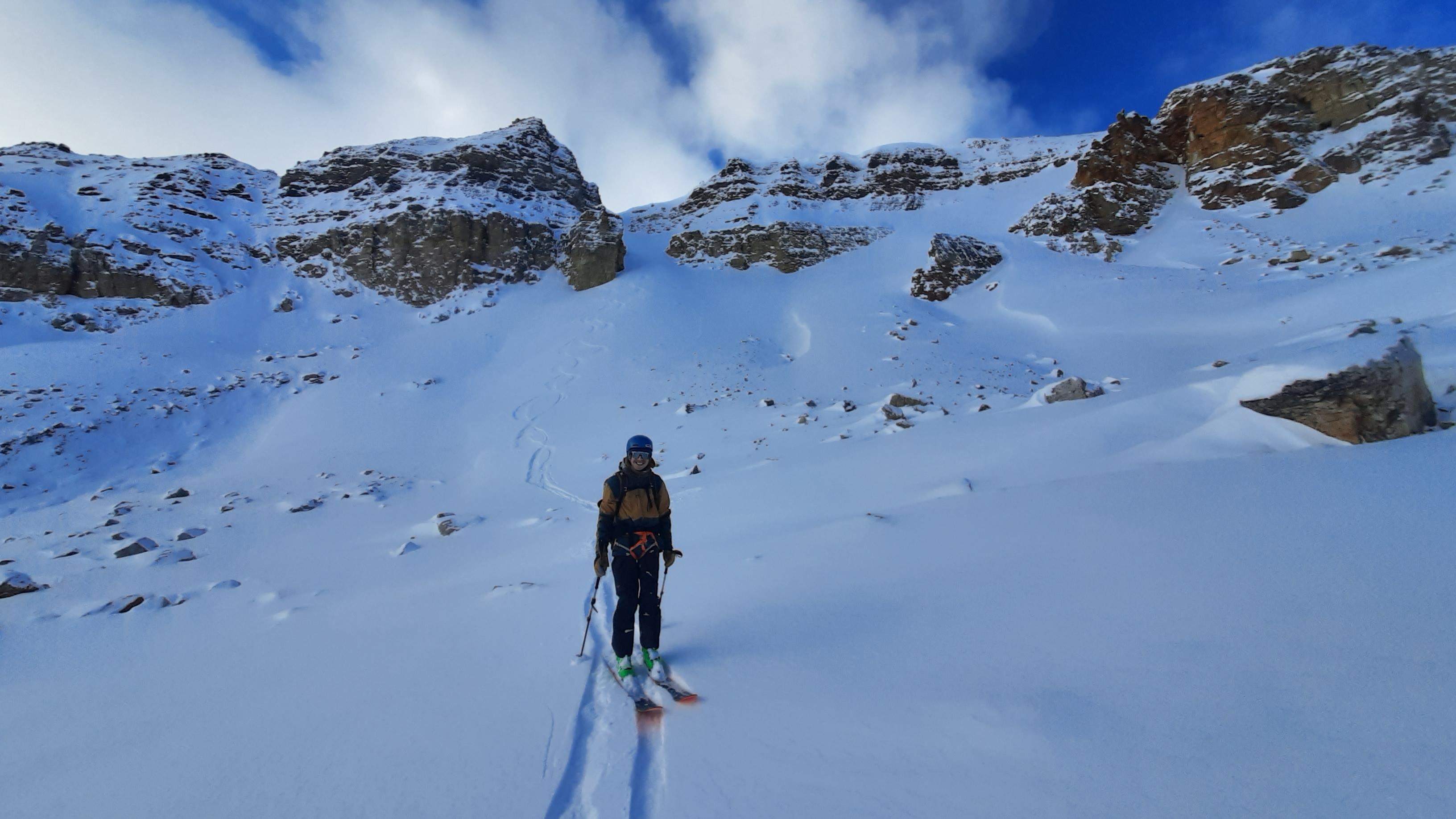 Found pleasant skiing between the rocks on the shady side of Crystal Ridge and from the Col between Cirque forepeak/cirque peak where 10-15cm of low density snow is sitting on generally supportive surfaces. Despite this we experienced no sluffing on moderately steep slopes. I expect this would be a different story in extreme terrain. Localized wind prone areas had seen reverse loading, and there is plenty of snow available for transport as winds increase over the next few days. Probing on all aspects found the foundational facets of the Rockies snowpack coming along nicely, and we experienced a settlement on a south aspect immediately below ridgetop.