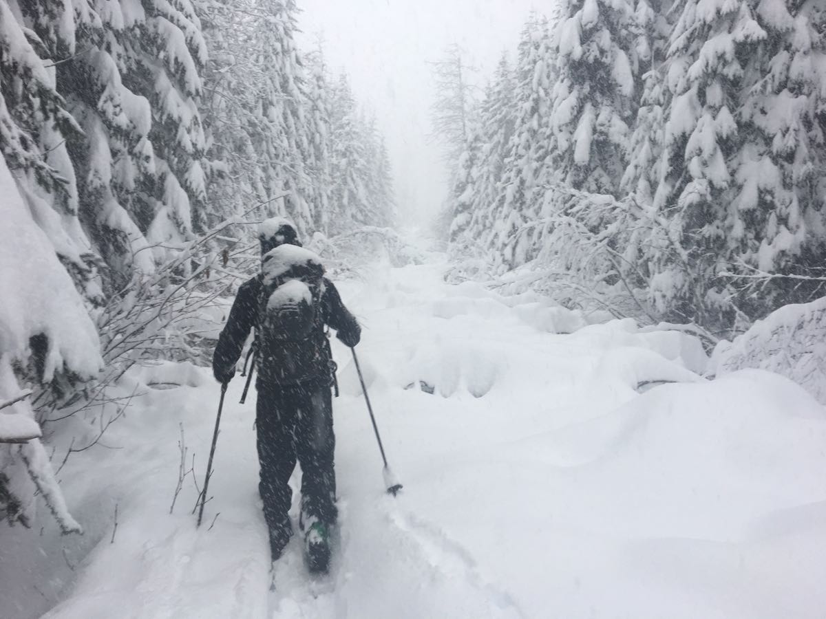 Went for a ski on the Duffey Nov 15. -2 degrees, moderate SW ridgetop winds, snowing 3-4cm/hr with obscured skies in the morning becoming broken late morning. Ski penetration was 50-60cm and trailbreaking was slow and difficult, although once the trail was in it set up really well. Snowpack depth was 60-80cm and early season hazards were rampant. Due to the difficult travel, our high point was 1700m. We had a couple settlements in hollow areas and observed some snowballing on solar aspects in alpine start zones.