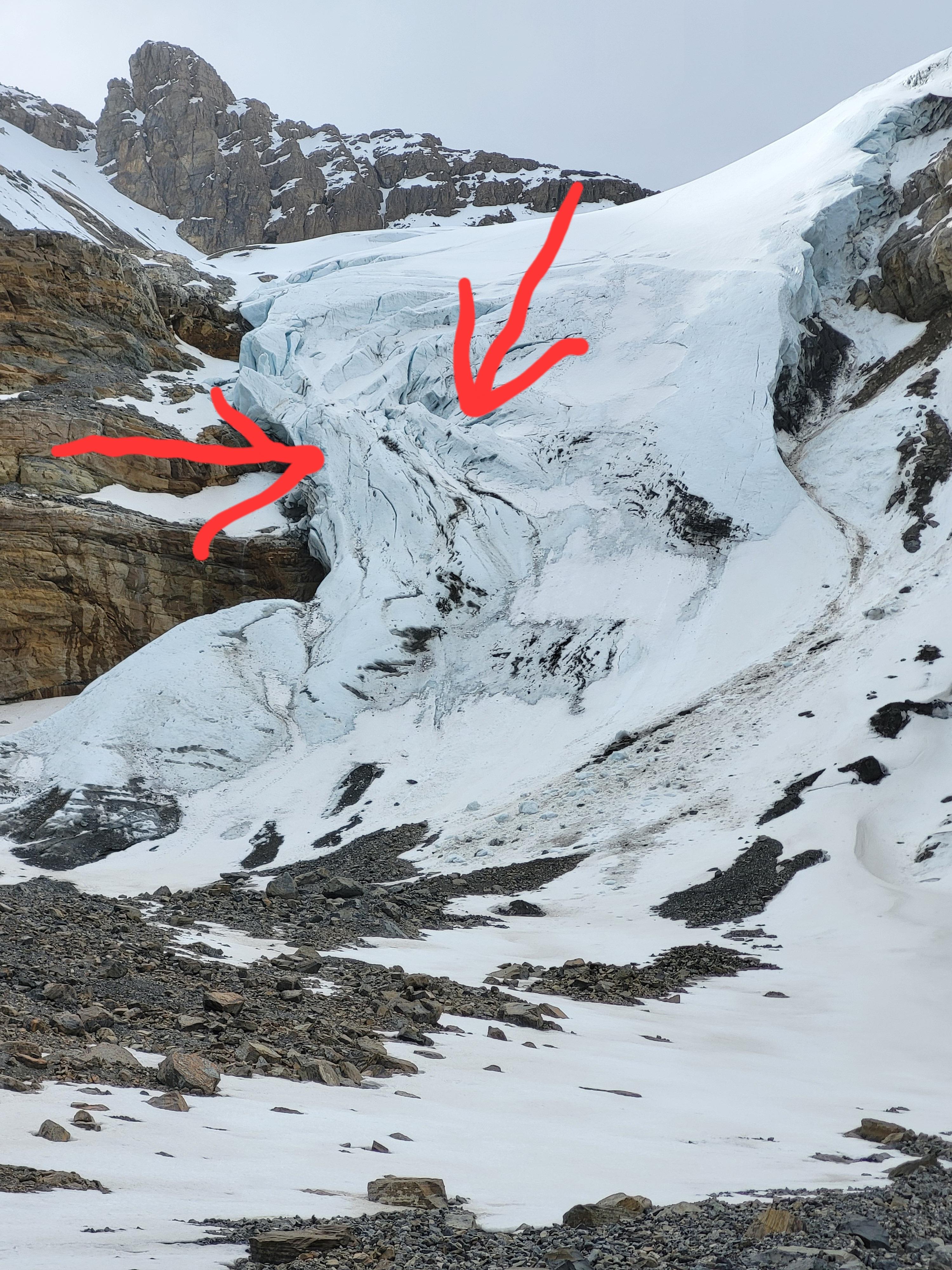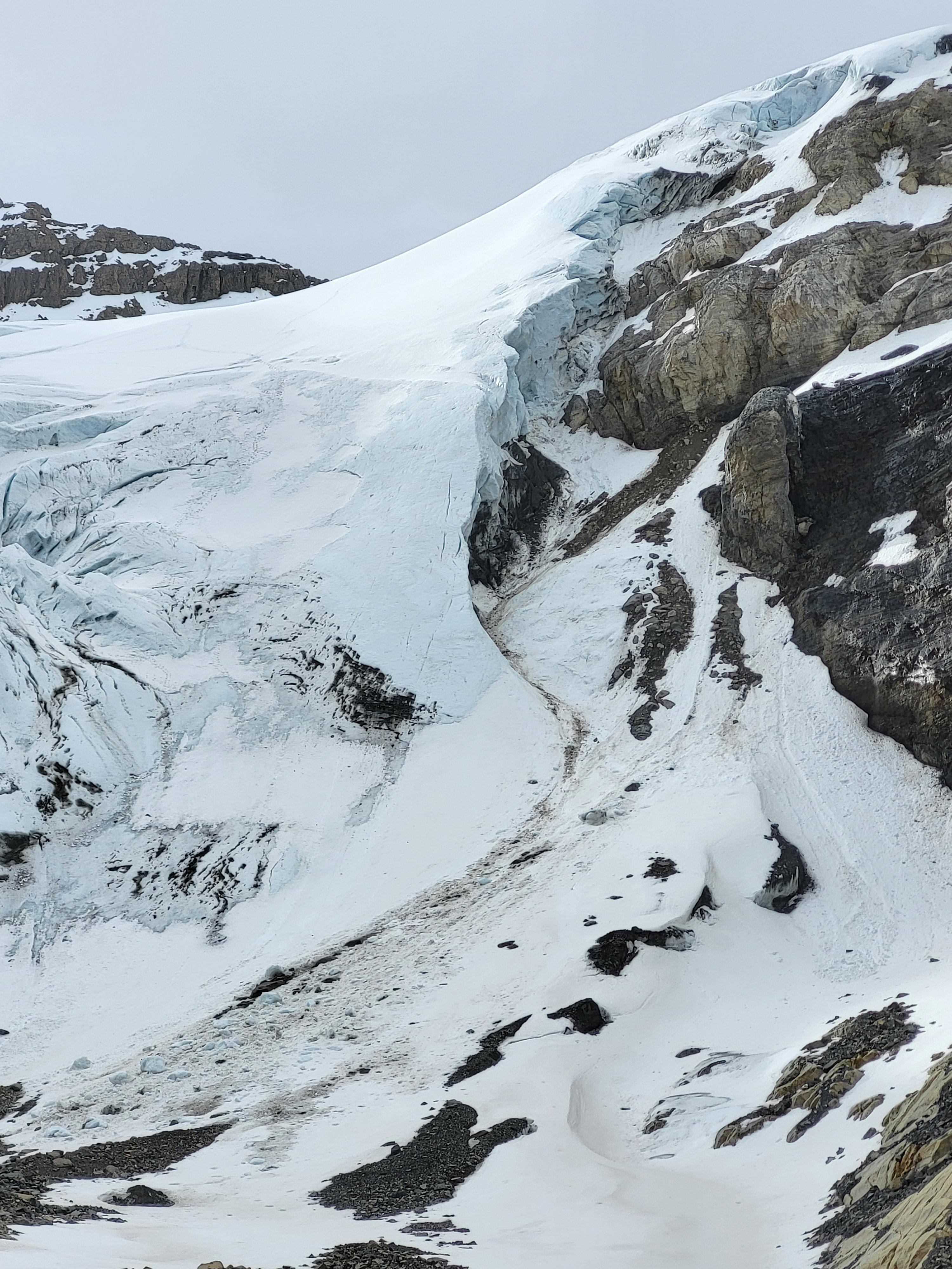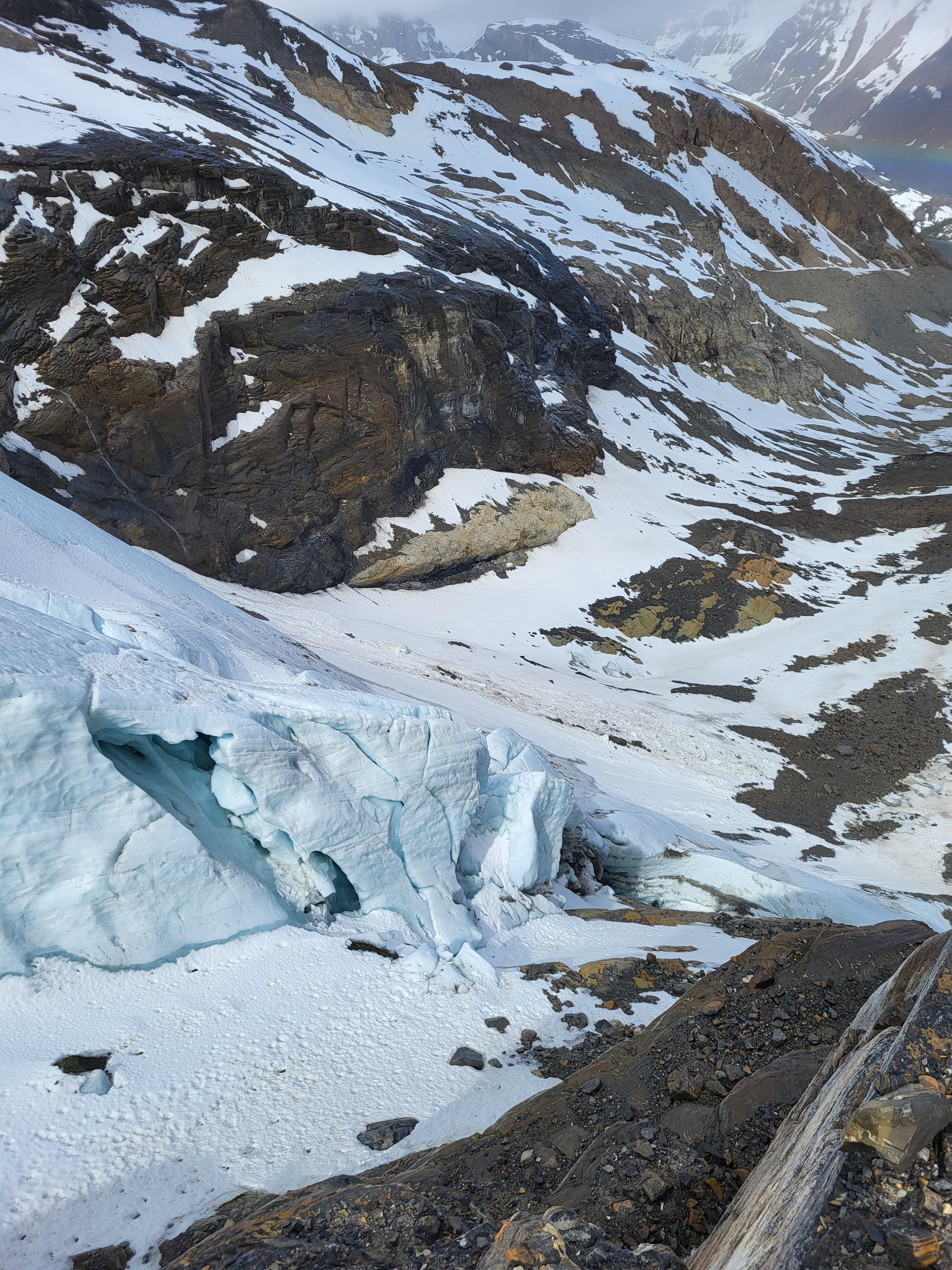 Last but not least, a new crevasse that wasn't there last year splits across the top of the whole ice tongue, from side to side. Maybe a schrund is being born.