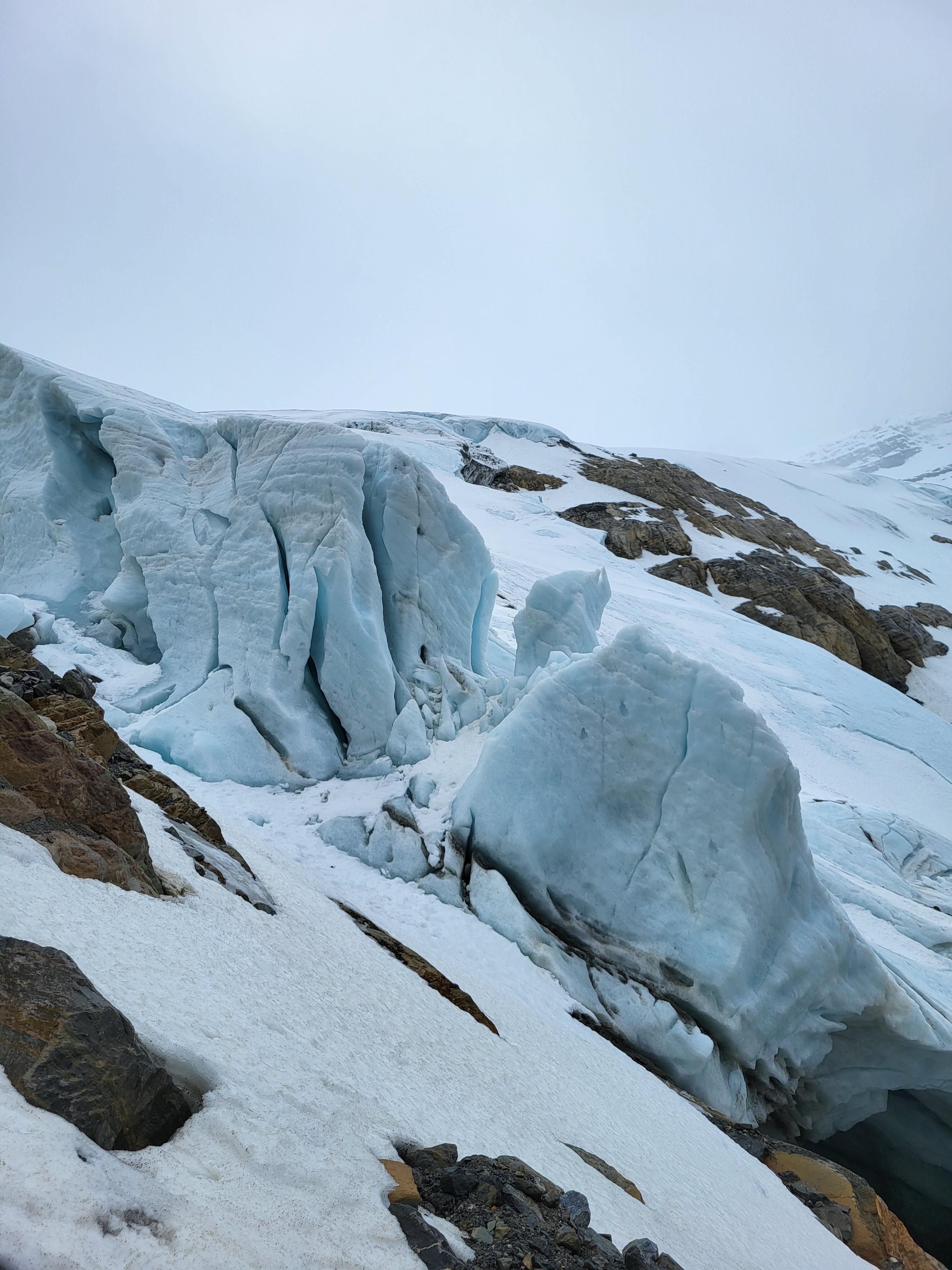 We went to take a look at the ice skills teaching venue on the North Glacier. The ice tongue has narrowed quite a bit since last year, with looming seracs present on both sides. The right side has had a serac fall event this spring with blocks spraying the lower right part.