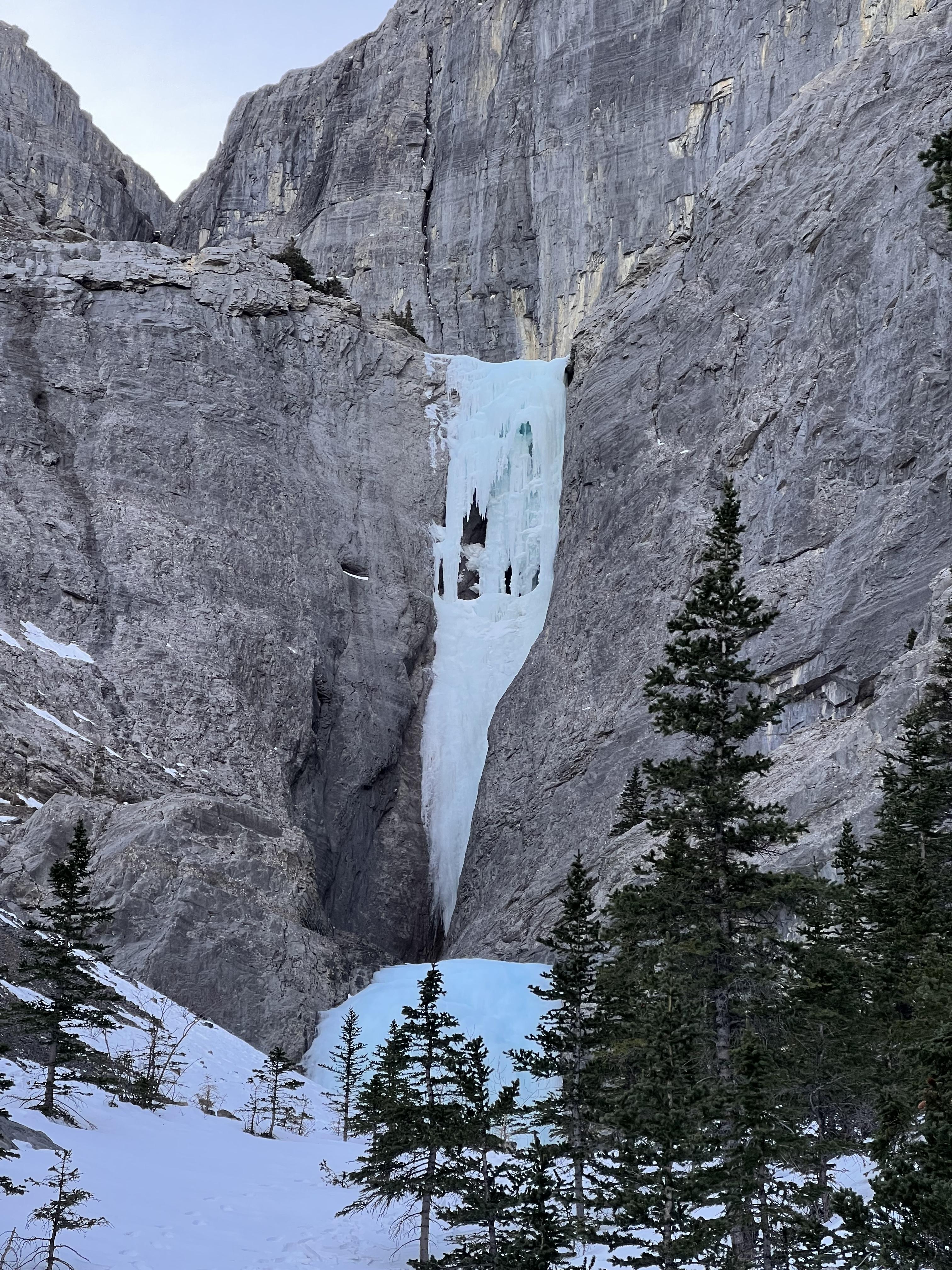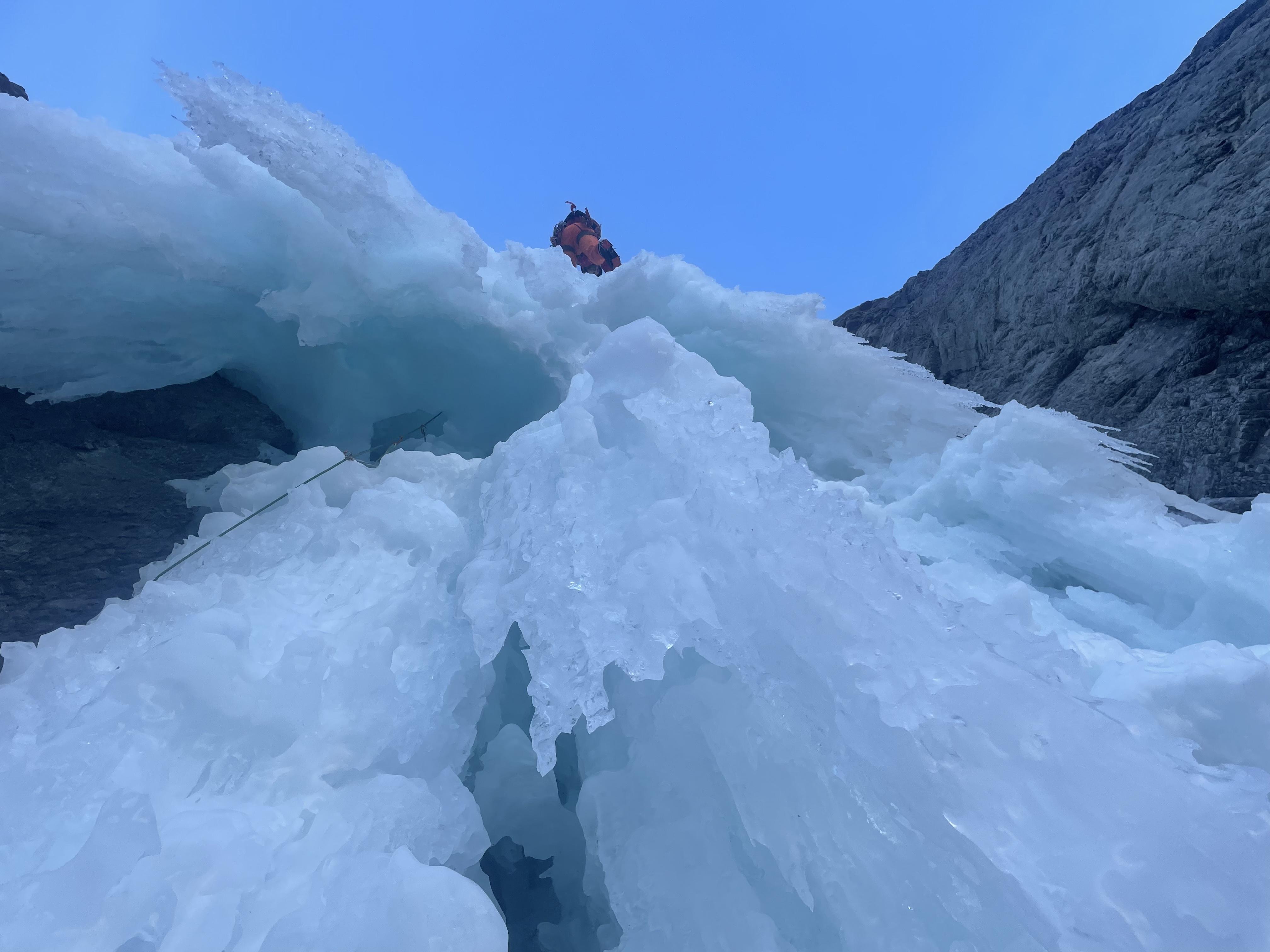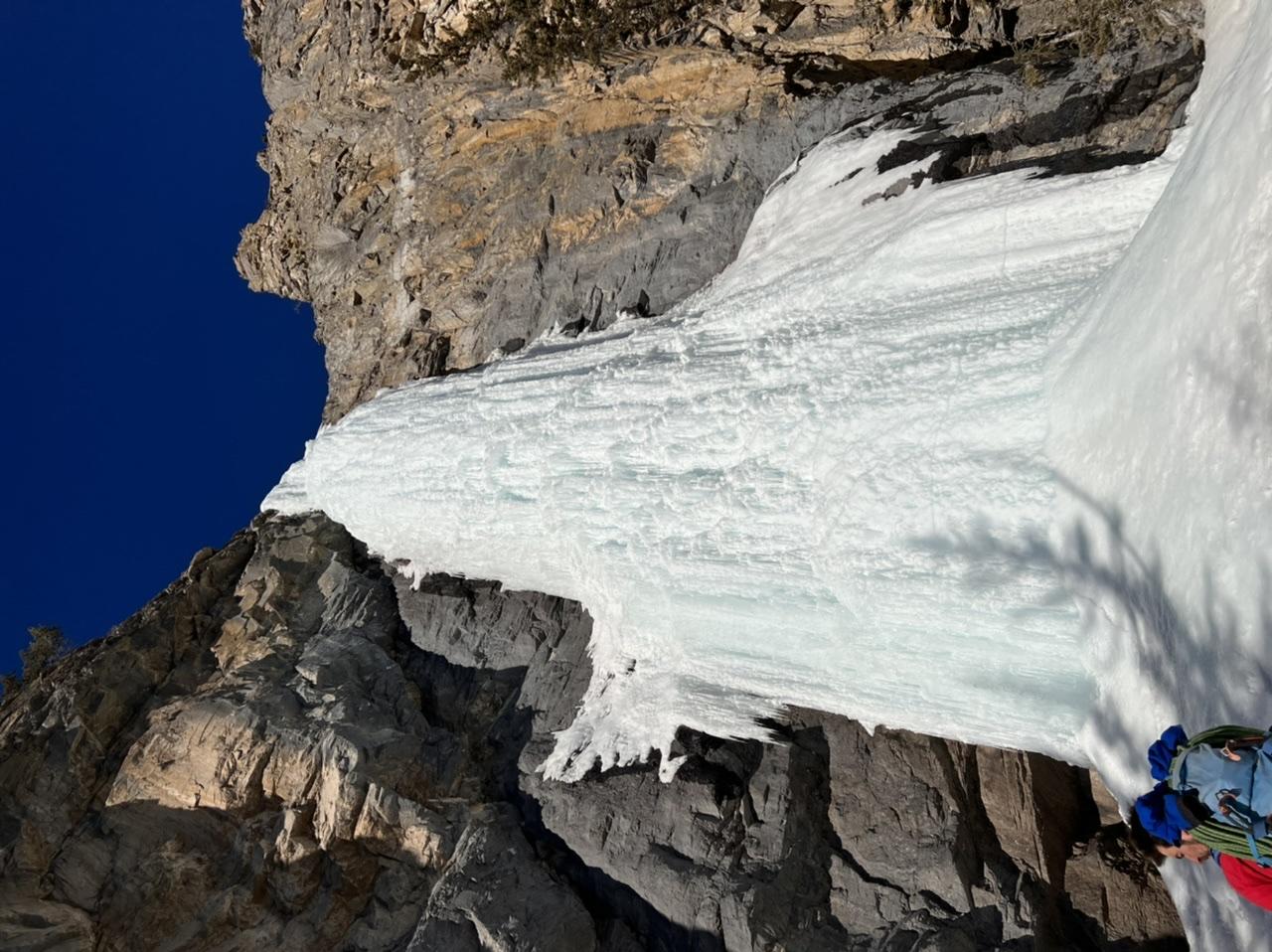Wanda is refreezing well, with brittle and calf-pumping smooth ice on the first pitch. The second pitch has some wild features, with an easier line heading up through some exposed tunnel features in the upper chandeliers.