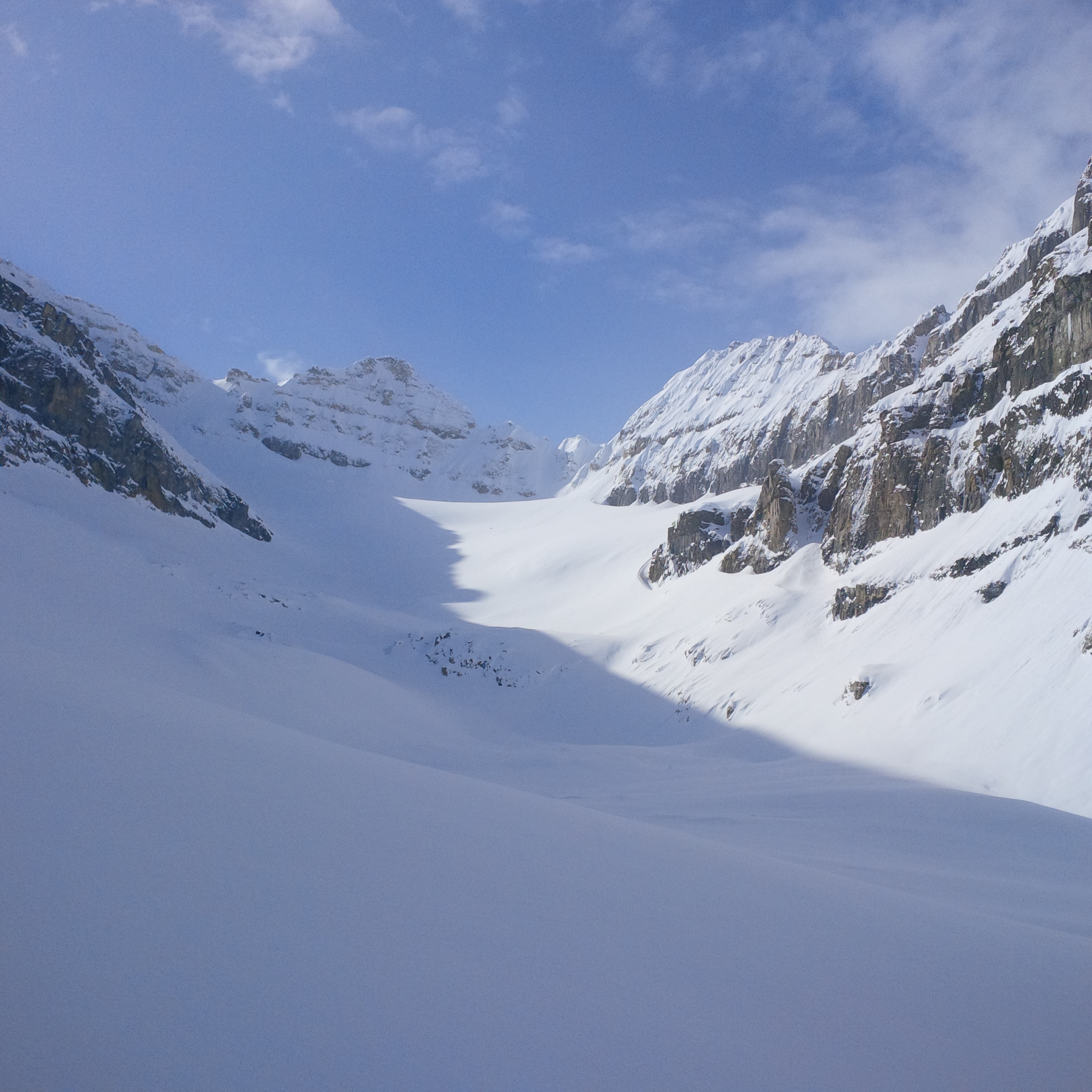 Our primary concerns were limiting our exposure to overhead hazards, especially if a cornice trigger was possible. The clouds rolled in late in the morning, limiting solar warming.