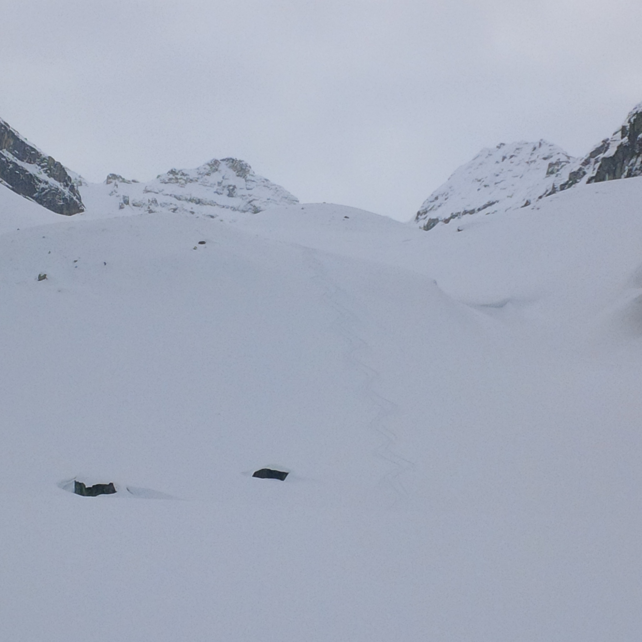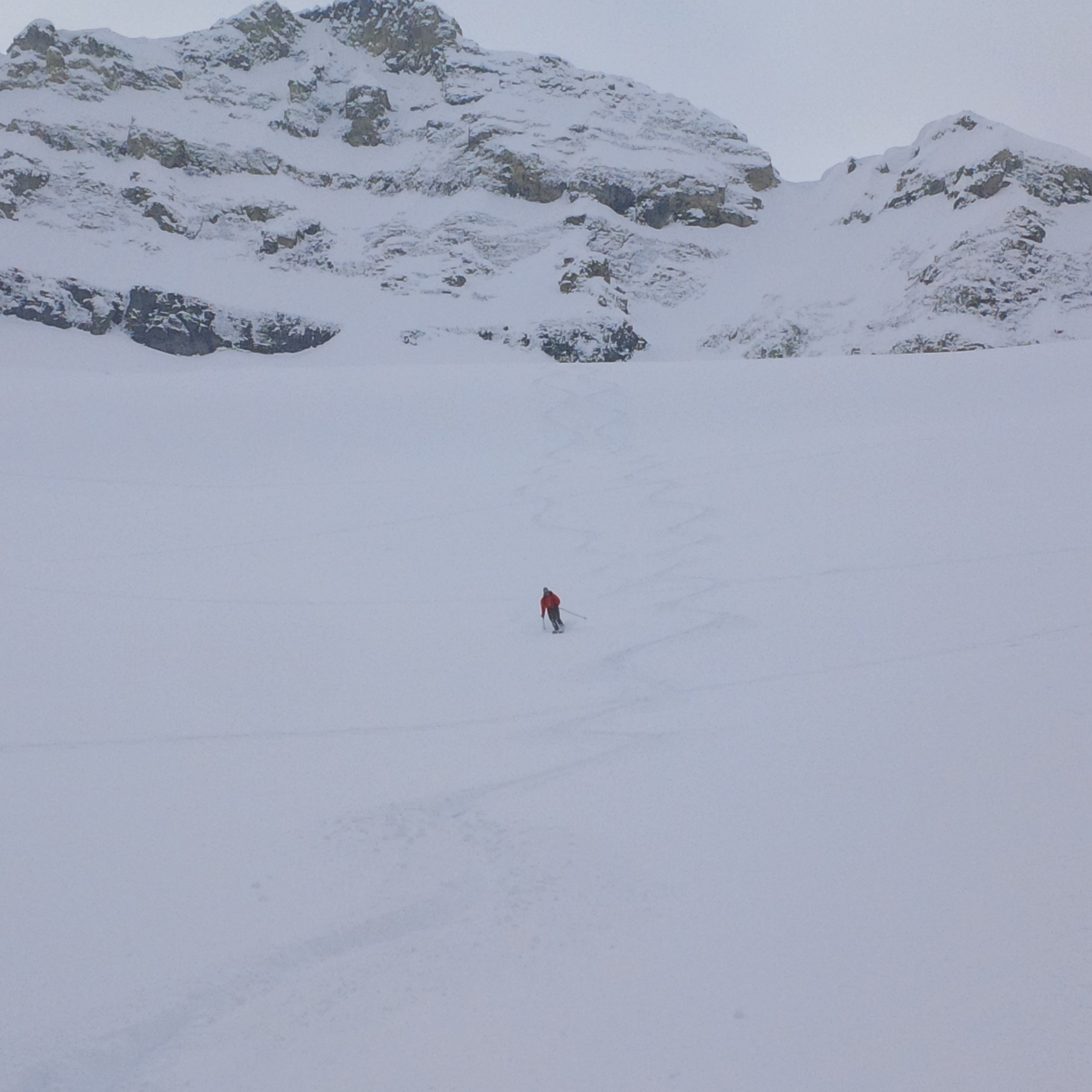 Coverage was better than either of us had seen in that valley, with no bare ice on the glacier and many normally rocky areas covered. That being said, we probed variable snow depths on the glacier from 120 to 300+, possibly due to the large avalanches in March having scrubbed out the snowpack in the thin areas.