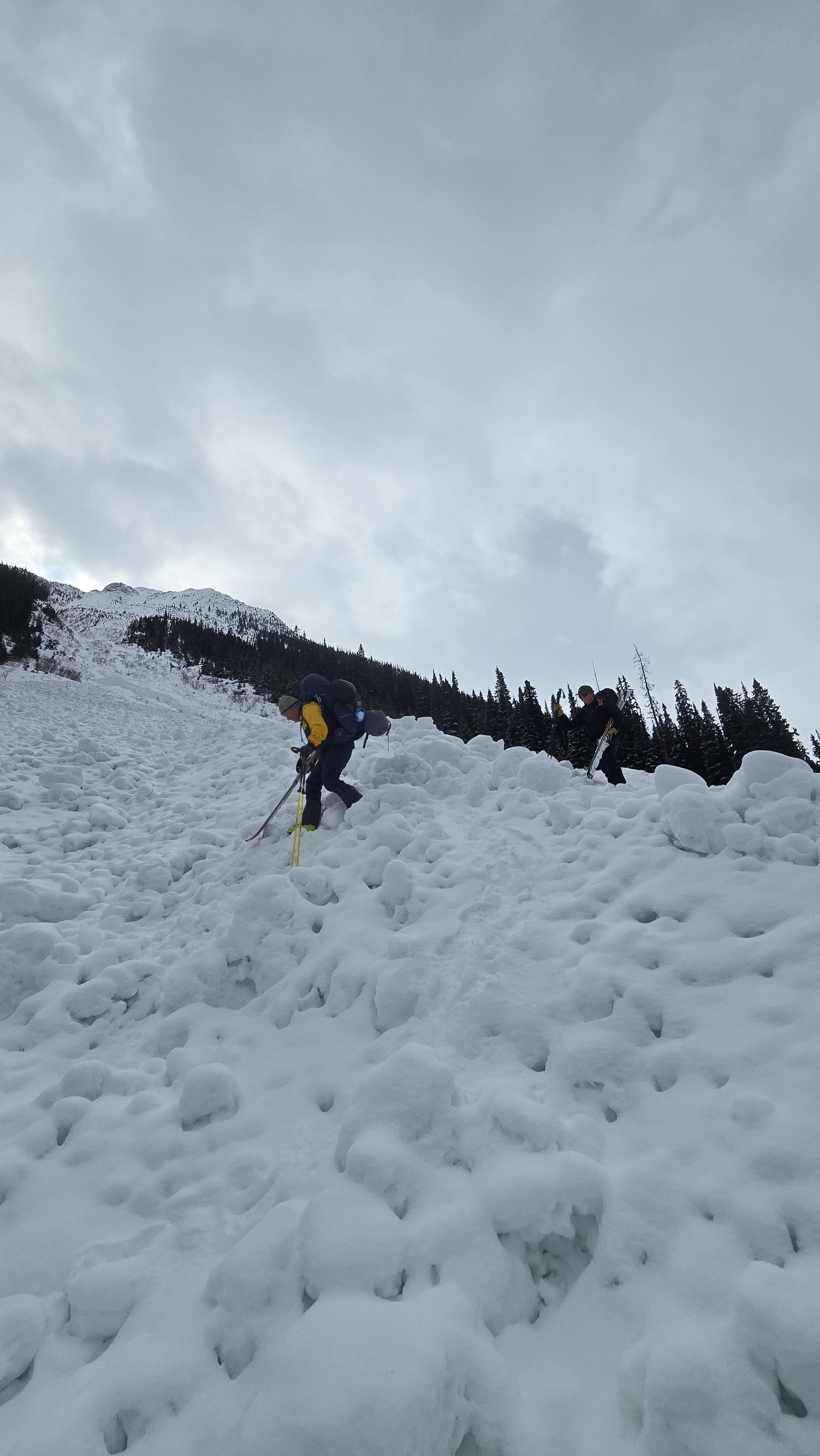 While at Ozalenka, an atmospheric river event came through, delivering significant amounts of precipitation throughout the week. This came in the form of rain up to 2,000m and temperatures up to 5C at 1750m. On Monday morning, 30cm of snow fell, which then turned to rain in the AFT, causing a widespread avalanche cycle up to sz 4 in the Dore River Valley (and terrible uphill travel to the cabin!). Most of the sz 3-4 avalanches observed ran in the S. Dore River valley (Middle Dore unobserved) with the Ozalenka Valley only reaching avalanches to sz 2.5. Snow quality was poor Mon/Tues, but began to improve by Thursday as temperatures slowly came down. By Friday afternoon, temperatures plummeted and that evening, reached -10C, creating a temperature crust found on all aspects up to 2,200m with just 5cms of snow on top. The exit trail on Friday afternoon showed major deterioration from the unseasonably warm temperatures all week. Many of the snow bridges we had crossed on Monday were no longer safe to cross making travel slow and arduous.