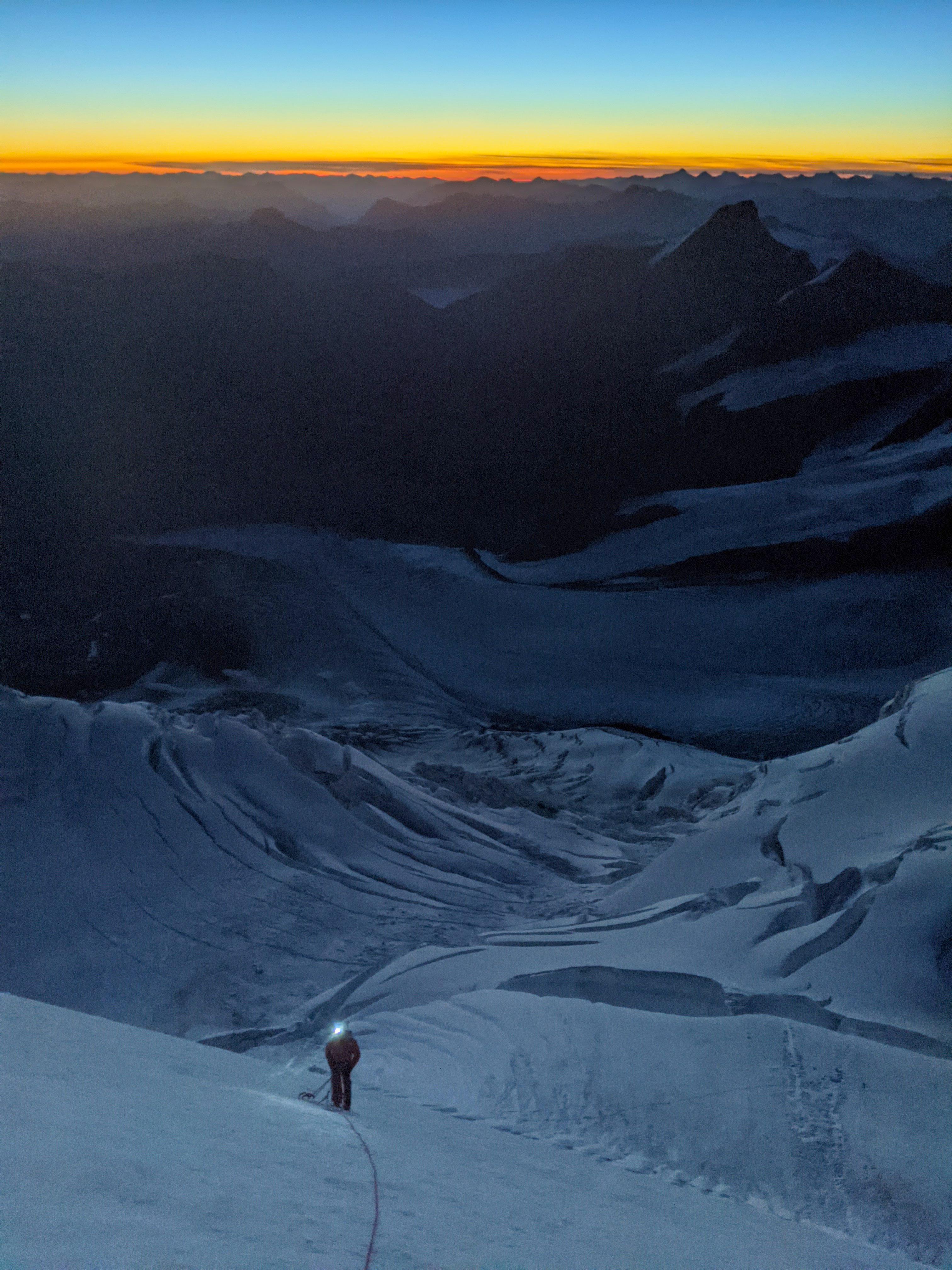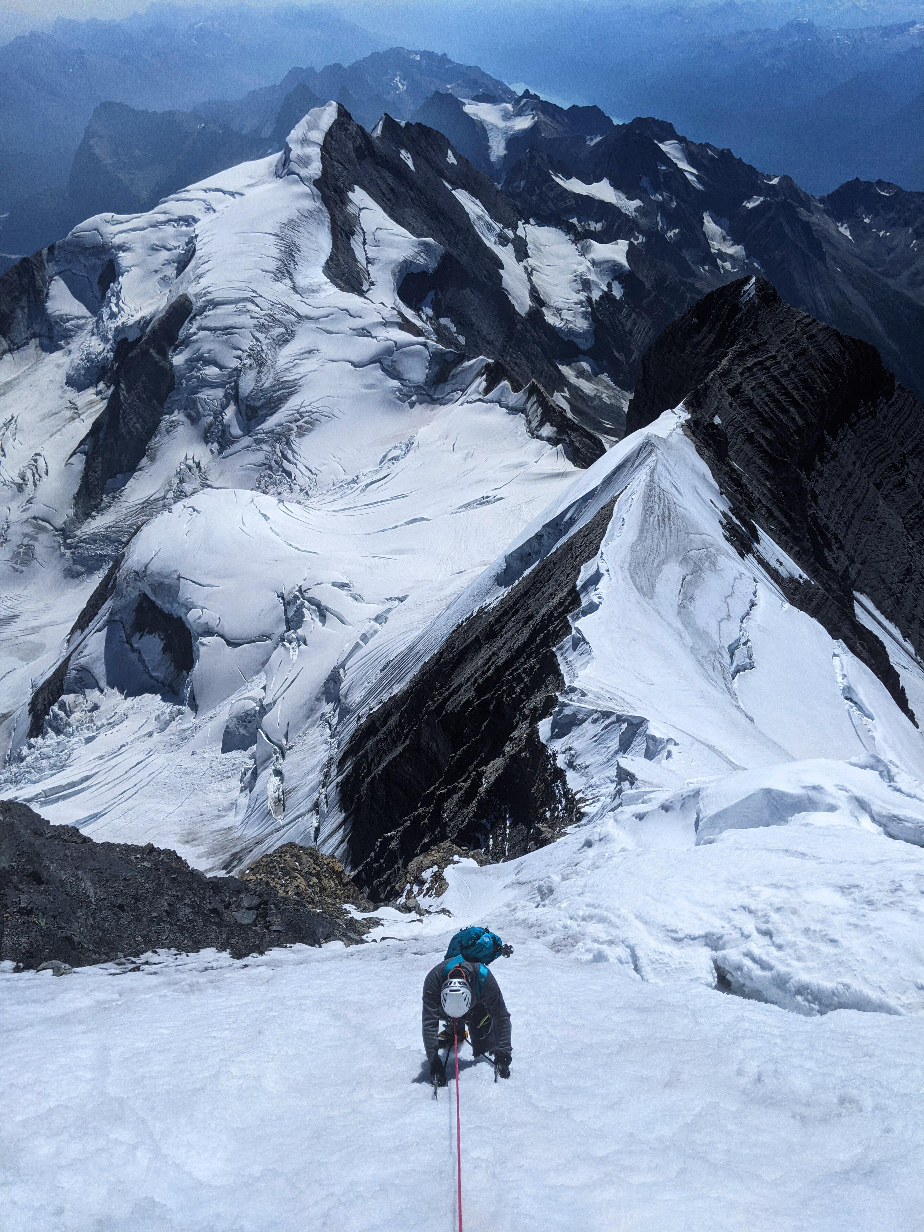We climbed the Kain face at night both on the way up and down. This seemed to be the logical thing to do considering the heath and intense solar radiations. The Kain face was 90% ice with a complex burgshrund passable on the far climbers right. Good ice screw placements and v-thread anchors could be found (with some digging) except for the last 60m where snow anchors were possible. From there we pretty much climbed the entire Southeast ridge to the summit and back. Conditions were quite variable along this stretch with nearly 60% dry ice with adequate protection. There were a few problematic crevasses (read wide open!) requiring minor detours on the South face along the way. Snow sections along this stretch were a mixture of isothermal snow and firm neve. The final summit ridge was easily negotiable with firmer snow travel.