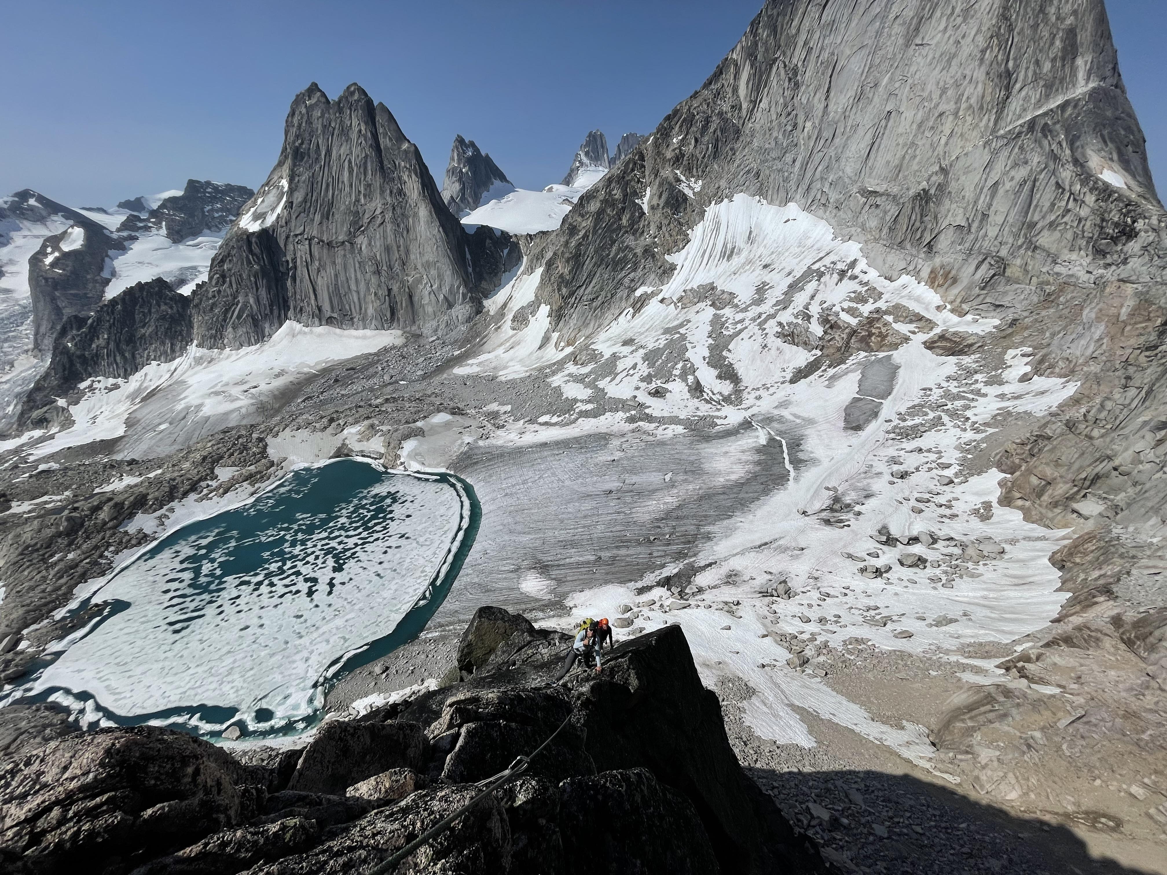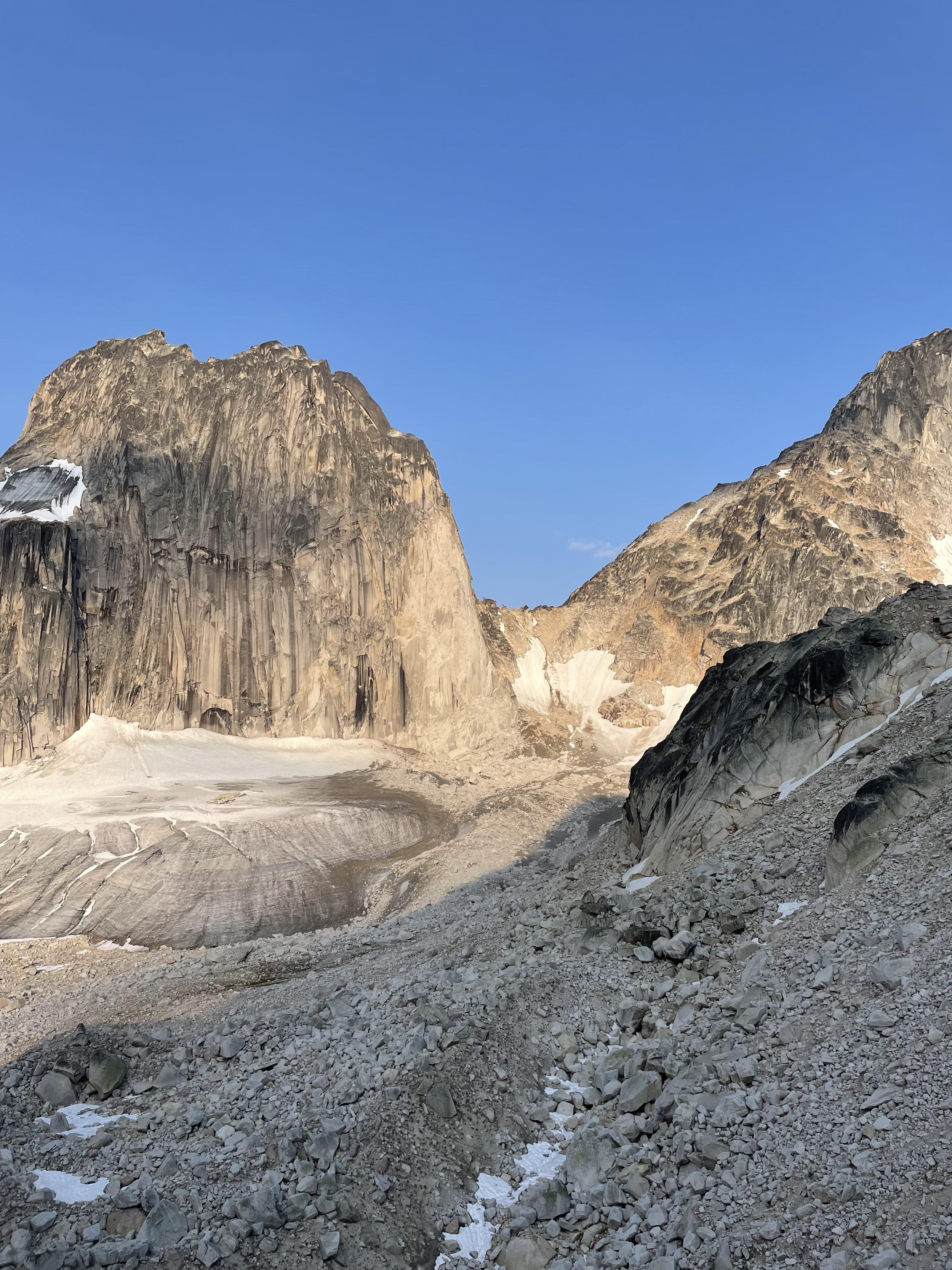 Some notes: The central Spires area in the Bugaboos is in very dry conditions for early July. The Bugaboo-Snowpatch col appears in very rough shape, equivalent or worse than at the end of last August, and we stayed well clear of the area and used the Bugaboo and Vowell Glaciers instead. Approaches to rock routes like Lion’s Way are drying out and becoming more at risk of moving rock in the boulders. Still, the Bugaboo Glacier approach to the west end of Pigeon is holding up well, with some early season loose rock on the benches below Son of Snowpatch.