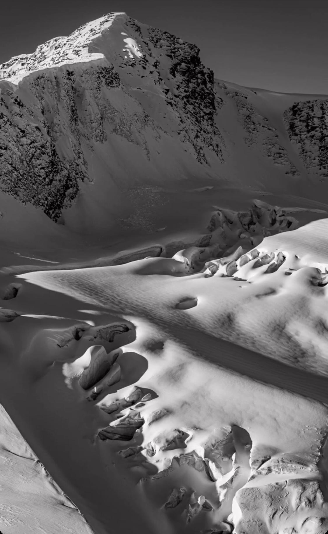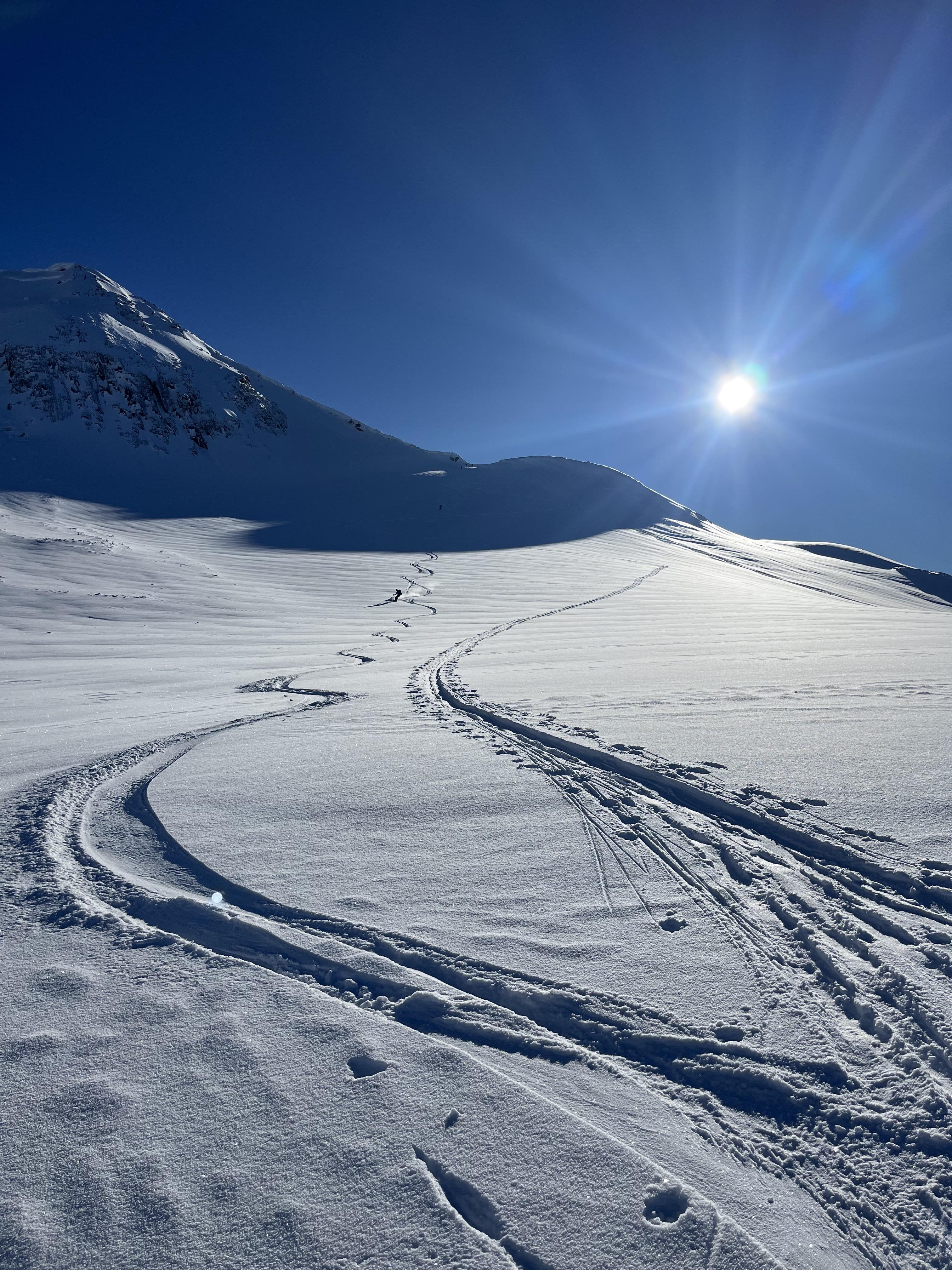 We took advantage of clear skies and very light wind, and spent most of our time on the smooth ice just east and above Asulkan Pass. Off the glaciers, skiing in the troughs and gullies provided great turns and avoided rocks. The tree triangle also skied surprisingly well on the exit, with boot-top powder and good coverage.