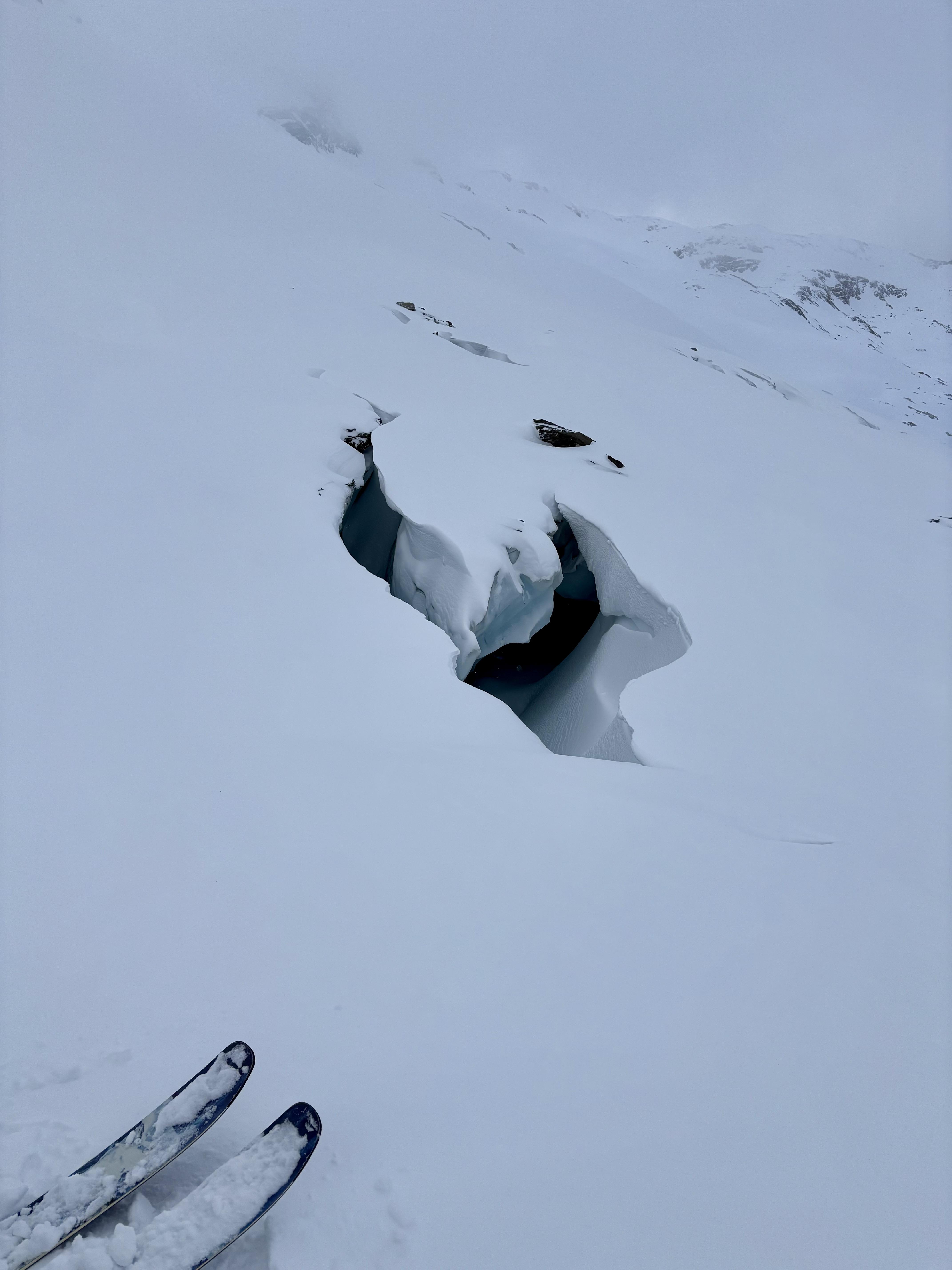 120-180cm snow probed, but there was still some exposed ice in places and open crevasses.