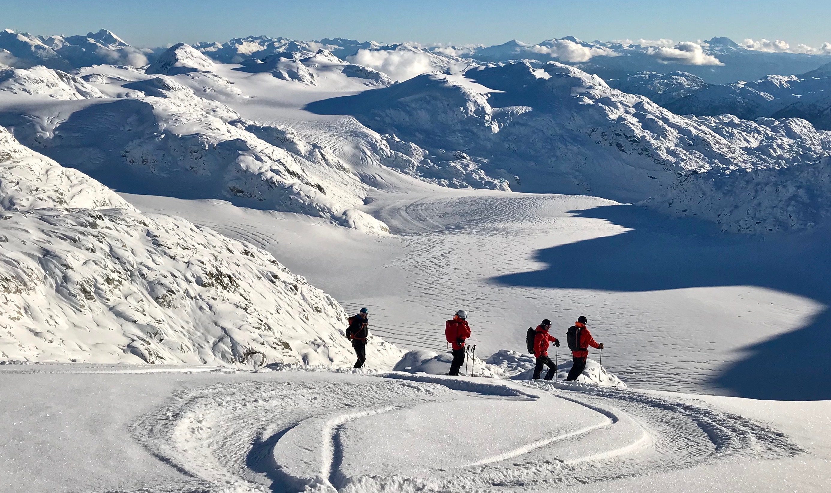 -Glaciers are poorly covered with lots of open cracks. This is especially shocking in the Spearhead Range near Blackcomb where folks can be pretty lax about glacier travel. The Spearhead Glacier is very boney with many large open crevasses directly in the classic lines. Getting to Husume or Corona involves threading the needle between open crevasses.. Decker N. Glacier is an open icefall. Blackcomb glacier looked pretty tracked up from the above and the creek below was still open.