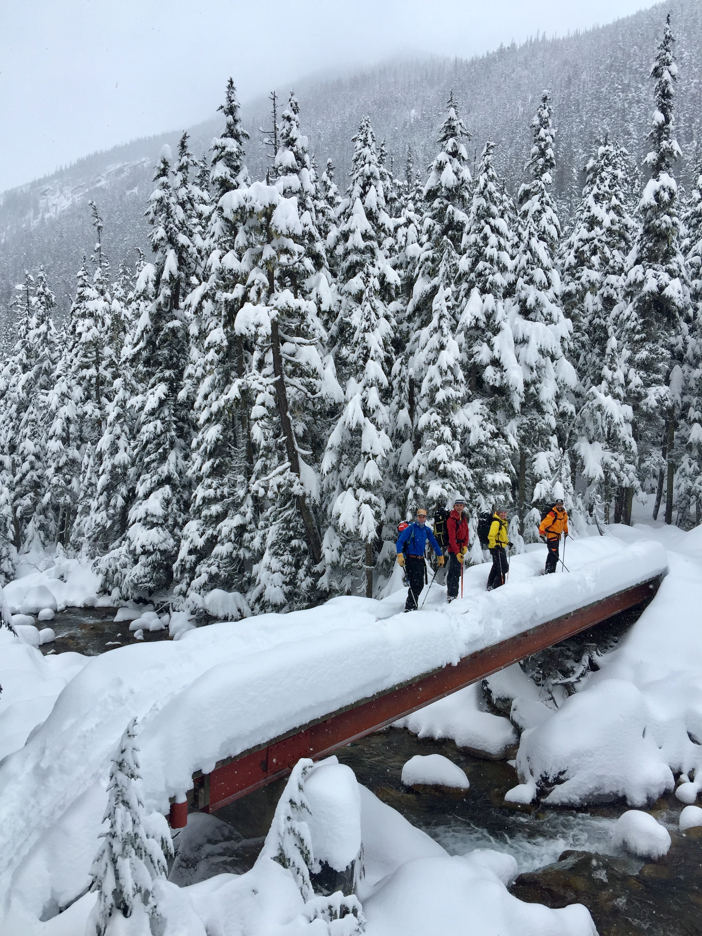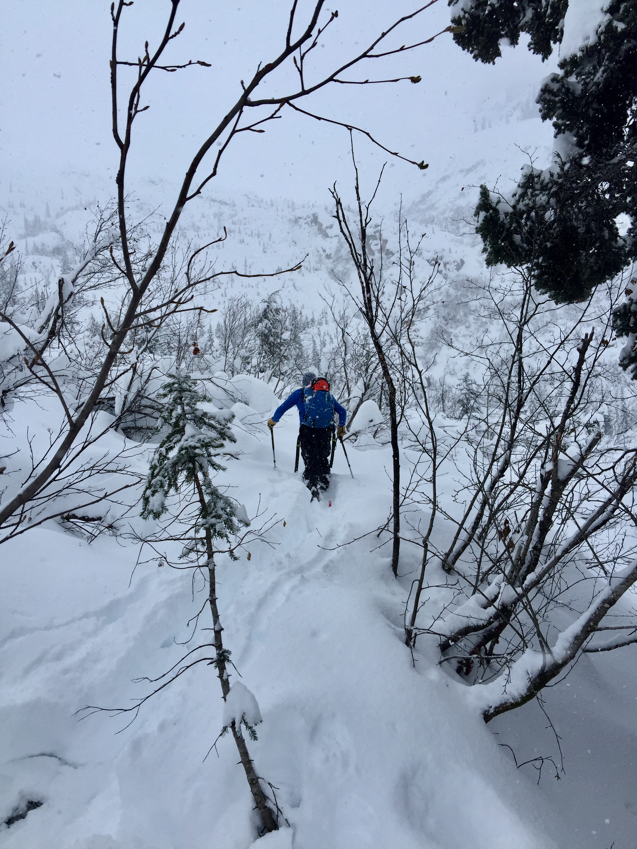 It is still early season with lots of alder and terrain features visible, but the new snow is really helping cover that up. We approached the valley on the Sir Donald summer trail, which worked quite well.