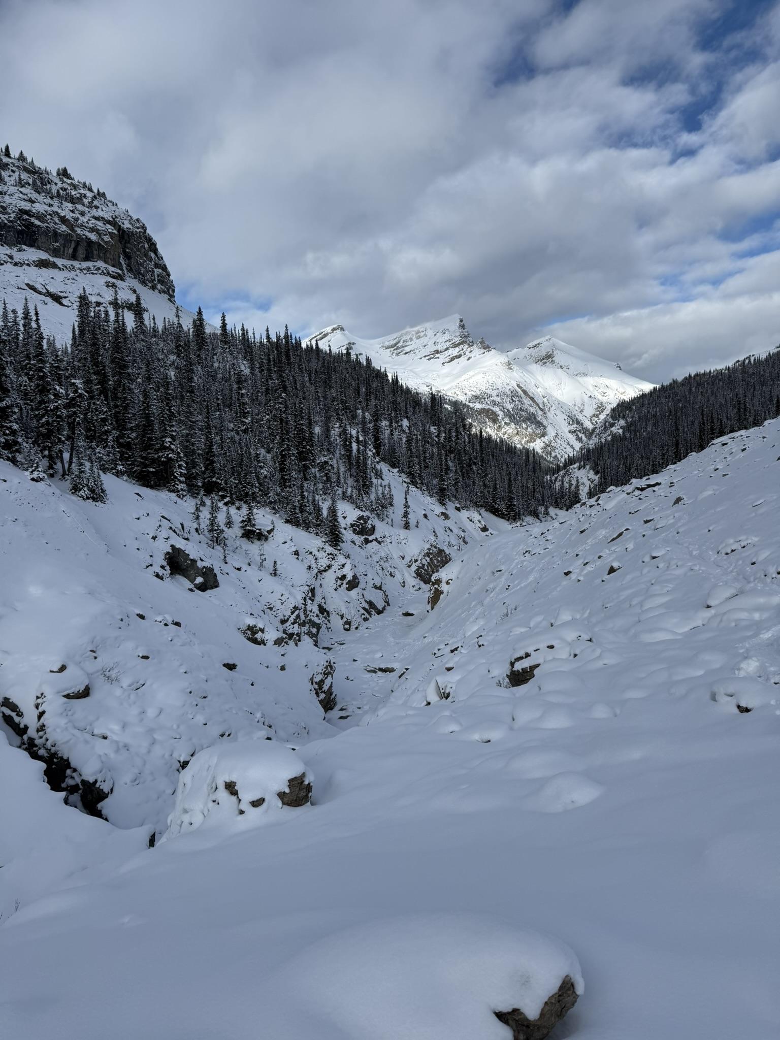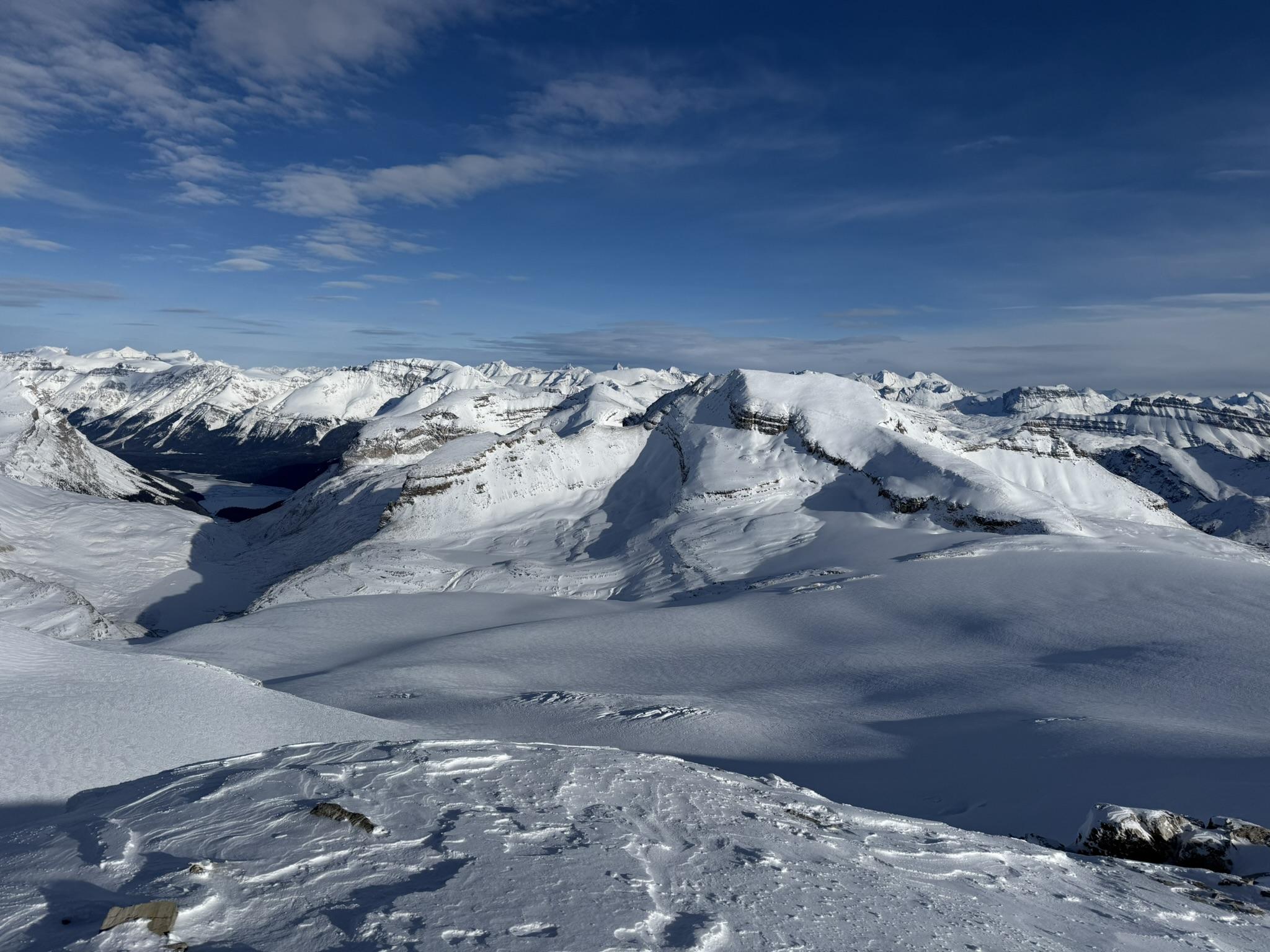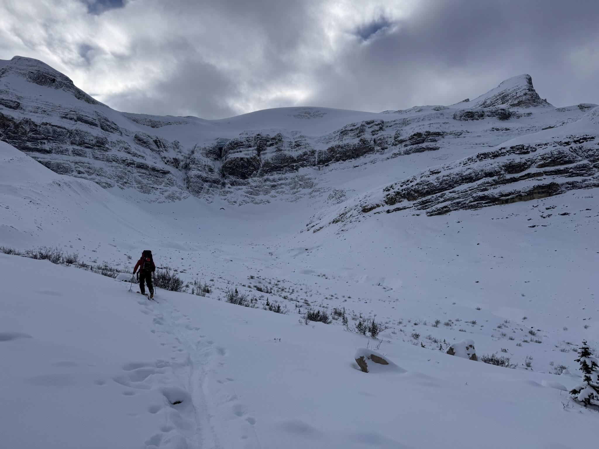 Jasper Visitor Safety took an early season trip to the Bow Hut to investigate alpine conditions. Up to 2000m was low tide with a HS of 20cm. ~2100-2200m HS of 40-50cm. The ice around the edge of the lake and in the canyon is still very thin and challenging. There are sections of exposed rocks and boulders so to avoid shredding skins or skis too much we opted for some boot packing. Roughly a HS of 50-60cm at Bow Hut. In short, the approach is rugged; we wouldn’t recommend the Bow Hut as a ski destination just yet.