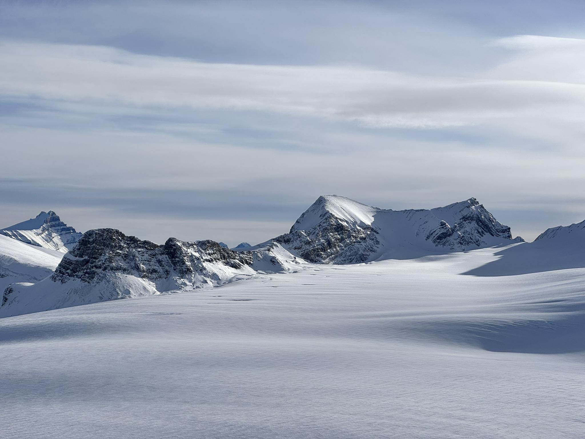 We skied a variety of snow from soft powder to wind hardened slopes to heavily rimed surfaces. When we arrived on the 25th it was still peacefully calm with no wind effect. We summited Mt Rhondda on the 26th with scattered cloud, light to moderate winds and a high of -12. Lots of wind effect in the alpine but no natural avalanche activity was observed during the three days.