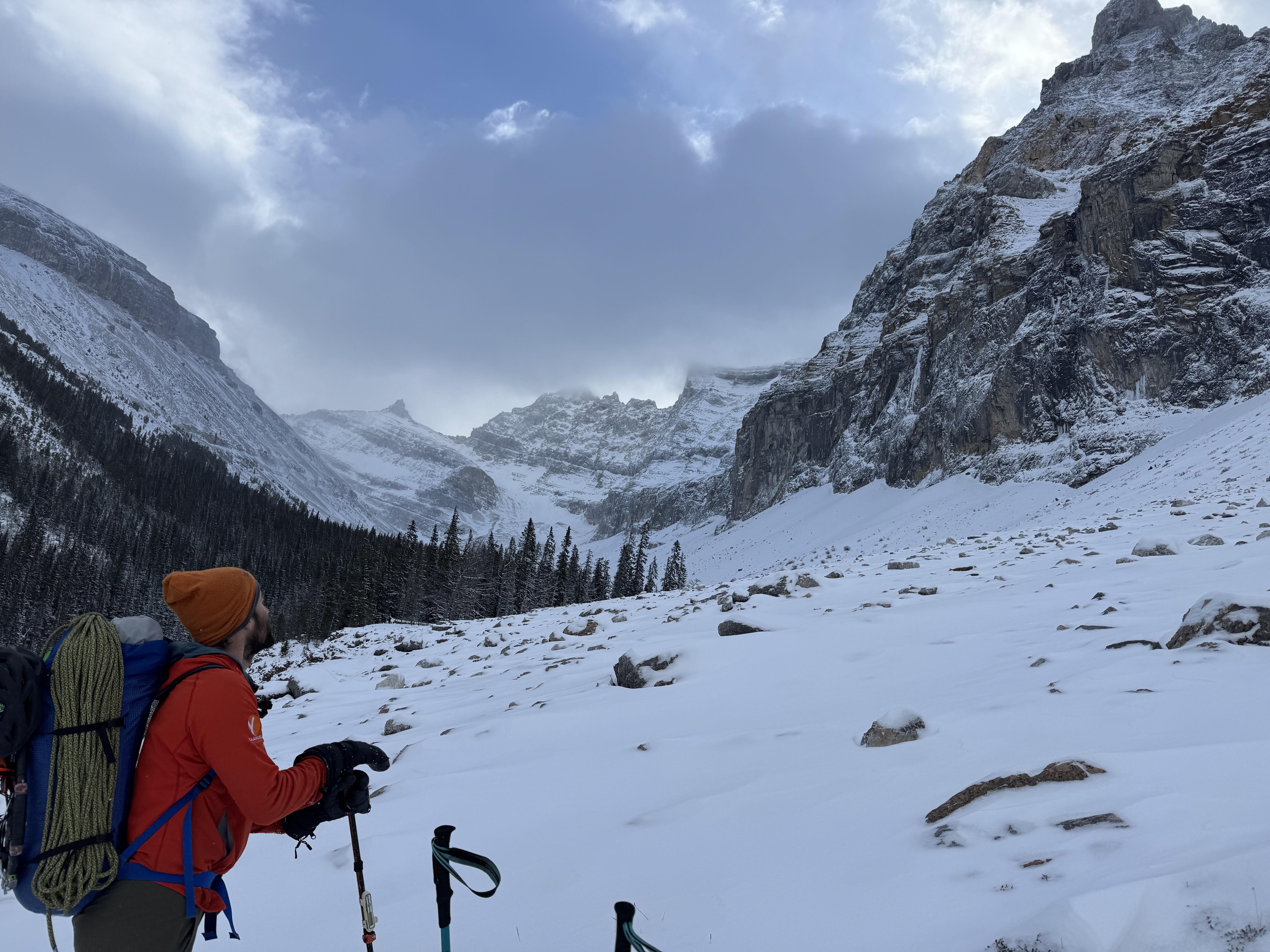 Approached the Storm Creek Headwall to attempt one of the mixed lines, but turned back due to concern about the fresh snow and wind, increased avalanche danger and an unwillingness to push things early in the season. There was 6cm of new snow in the parking, increasing to 10-20cm by treeline.
