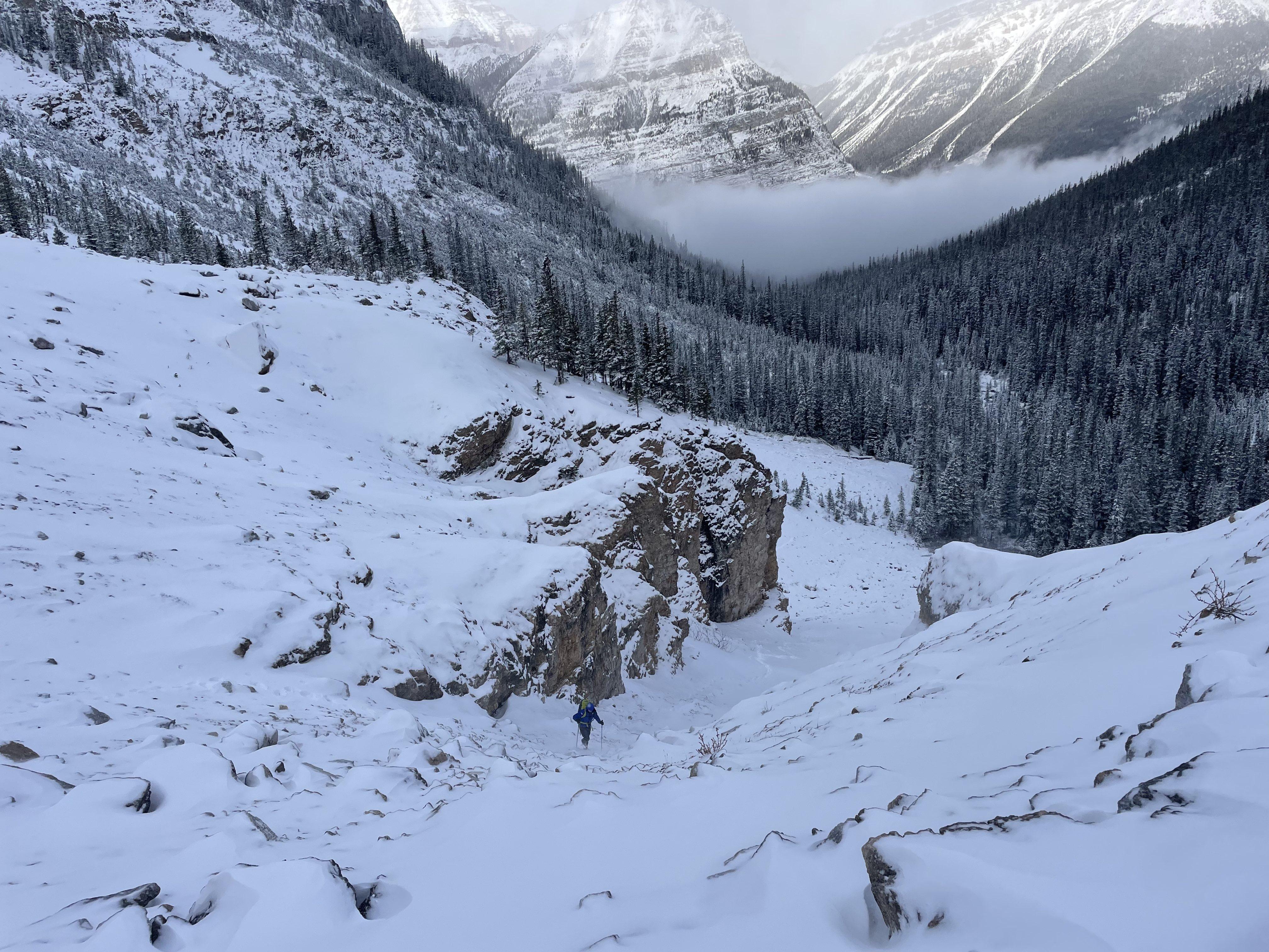 While hiking back down the valley, we noted several size 1 loose dry avalanches above the climbs. As previously reported, there doesn't seem to be a ton of ice on the Storm Headwall this year compared to last year; most of the climbs are either thin or in fully mixed shape.