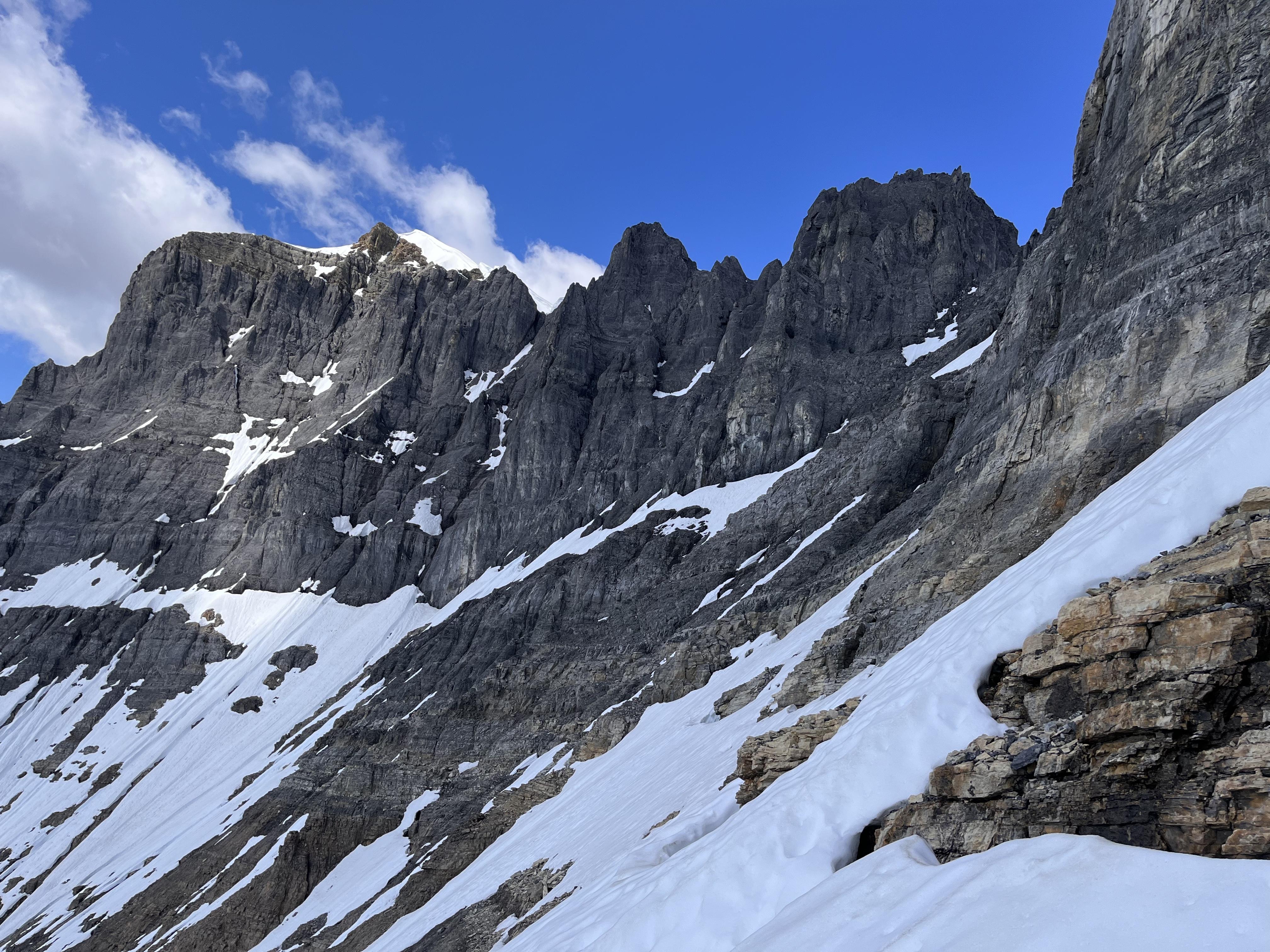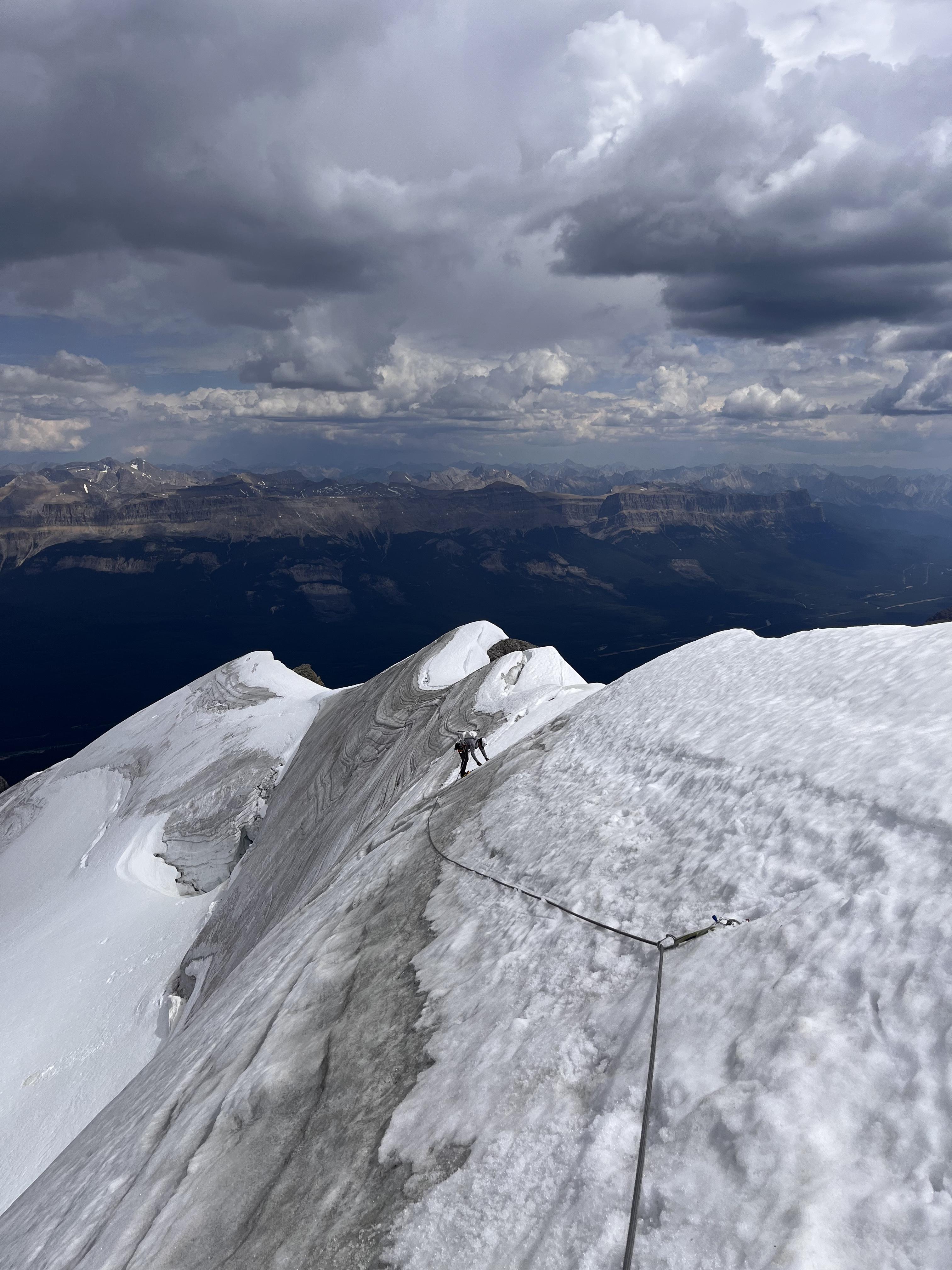 My guest and I enjoyed good conditions on Mt Temple’s East Ridge today. Good steps in soft snow on the traverse to black towers that did not require crampons with todays warm temperatures but axes and boots were necessary. The black tower pitches were dry. The summit ridge was icy and thanks to visitor safety’s recent picture of the summit ridge we made sure we had steel crampons, sturdy boots, and a few extra screws to safely navigate the ridge. Our main concerns today were the potential for afternoon thunderstorms, and rockfall hazard due to melting snow patches in the black towers area.