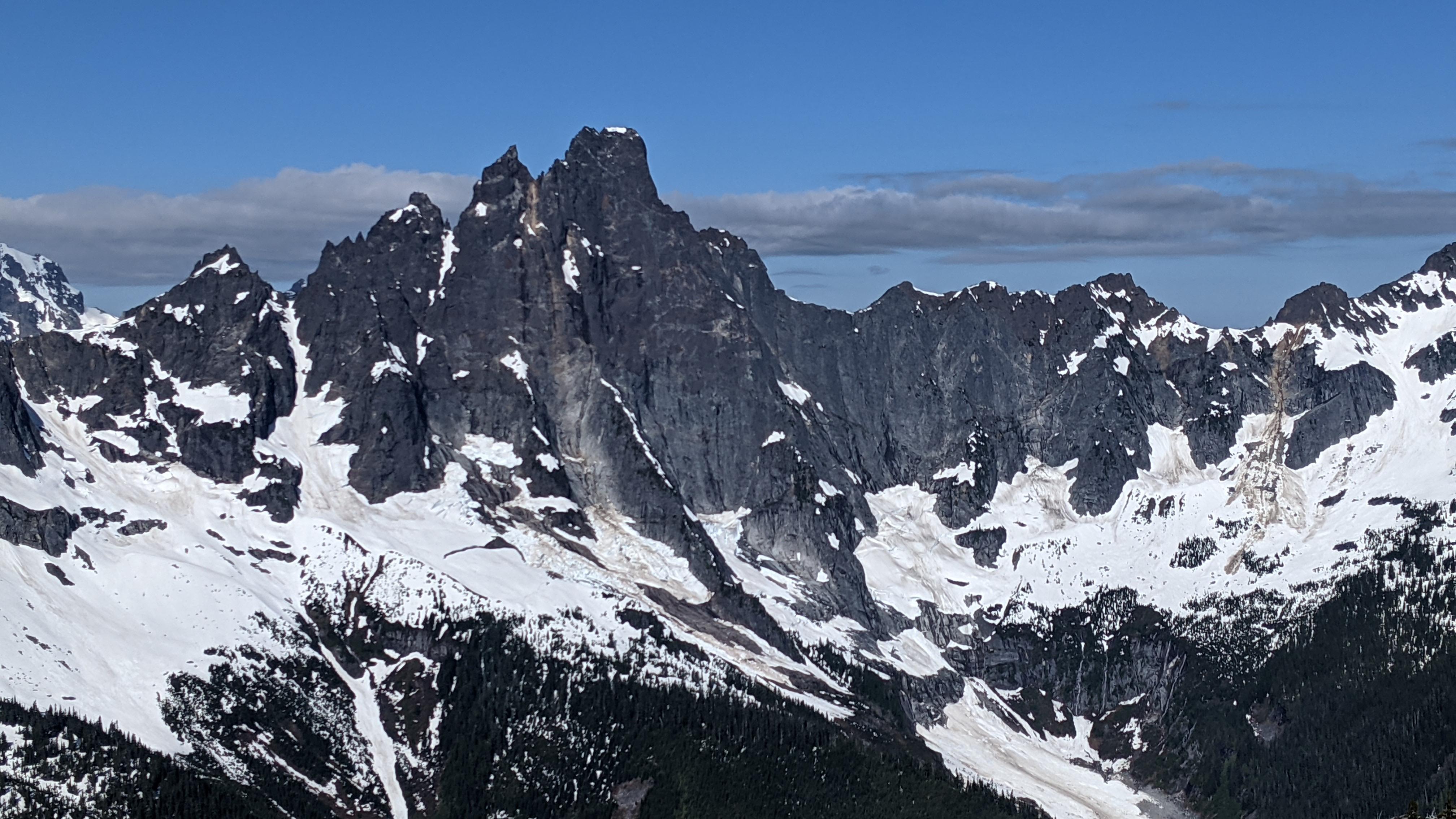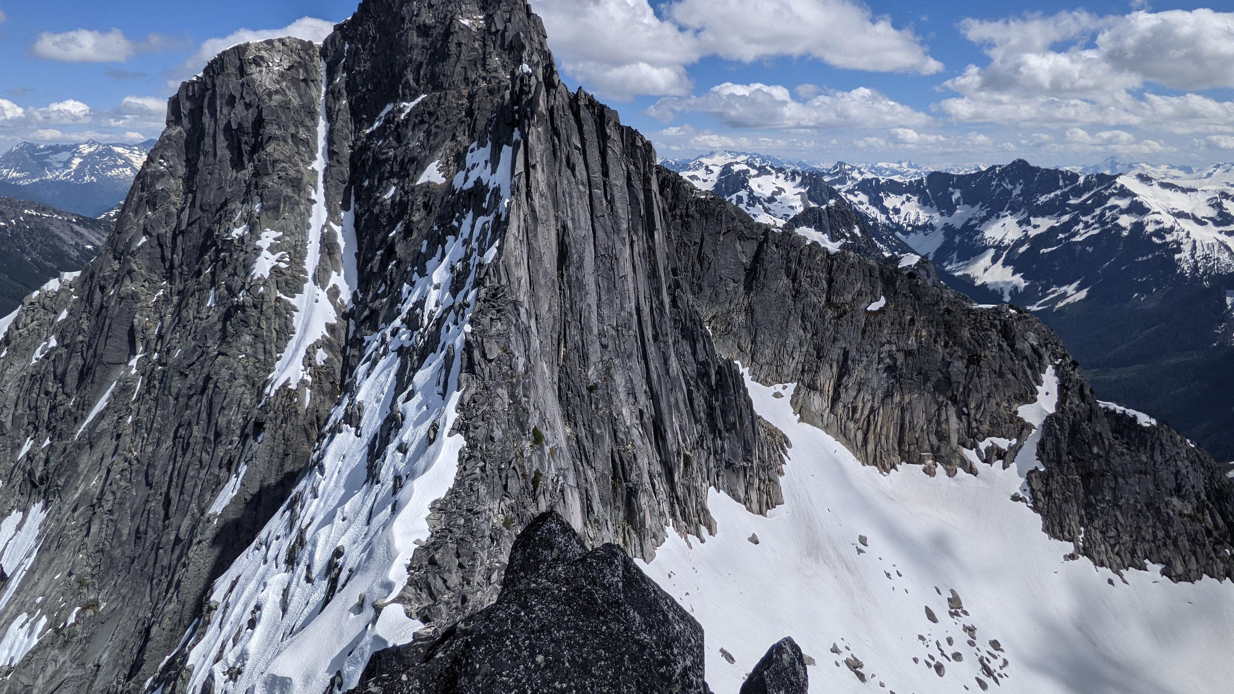 Steep snow on the standard descent from N Spire steered us to a rappel route on the S face. Snow on the N ridge of S Spire would likely make it a more of an alpine adventure than the 5.7 grade implies. No view of the N ridge of N Spire, but likely holding snow on the climber's left as well. Another party reported that the couloir down from S Spire provided a quick and easy descent.