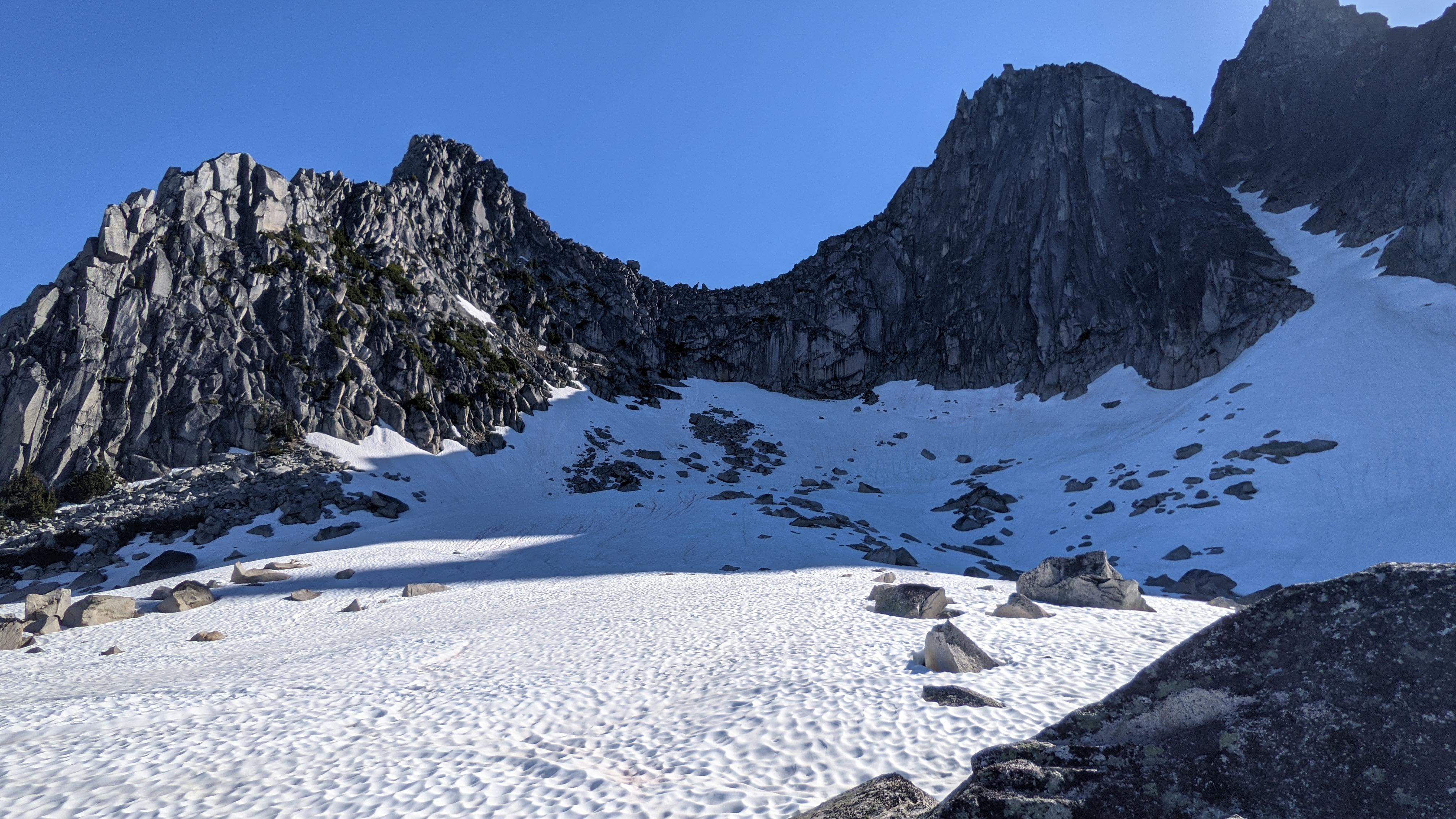 The area seems to be at a transition point, where the routes with a southern tilt (SW ridge of N Spire, Dairyland) have melted out nicely and are climbing dry, but the ridges still harbor snow on their polar sides. Snow in the basin is sun cupped and provided fast travel in boots, with no need for spikes. There were at least a few flat bivy-boulders that have melted out, and I'm sure the rest are melting out pretty quickly in this heat. There was nothing for refreeze overnight during our stay. No obvious water source in the basin, but it was warm enough overnight to melt snow left in pots and bottles.