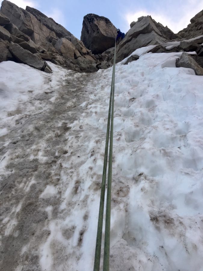 It was nice to have a 70m rope to clear the last hole associated with the bergschrund when rappelling off the South Howser Tower yesterday. A 60m rope would leave you in between the crevasses and would make it trickier to get down safely, although still possible as you can step down and across it.