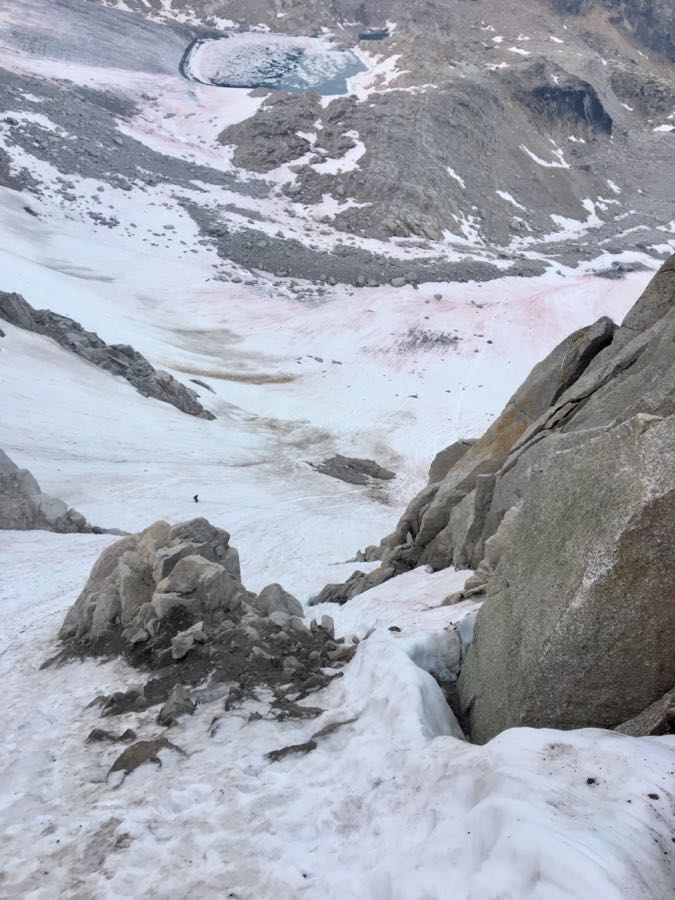 The Bugaboo-Snowpatch Col was in fantastic shape most of the week, with huge bucket steps until the last few meters of gravel. People were going up and down all hours of the day and night (often without crampons) with very little rockfall hazard. However, yesterday I noticed a rapid deterioration with much more rock exposed, very thin snow at the top, and also the middle of the second rappel. This are will require more caution from now on.