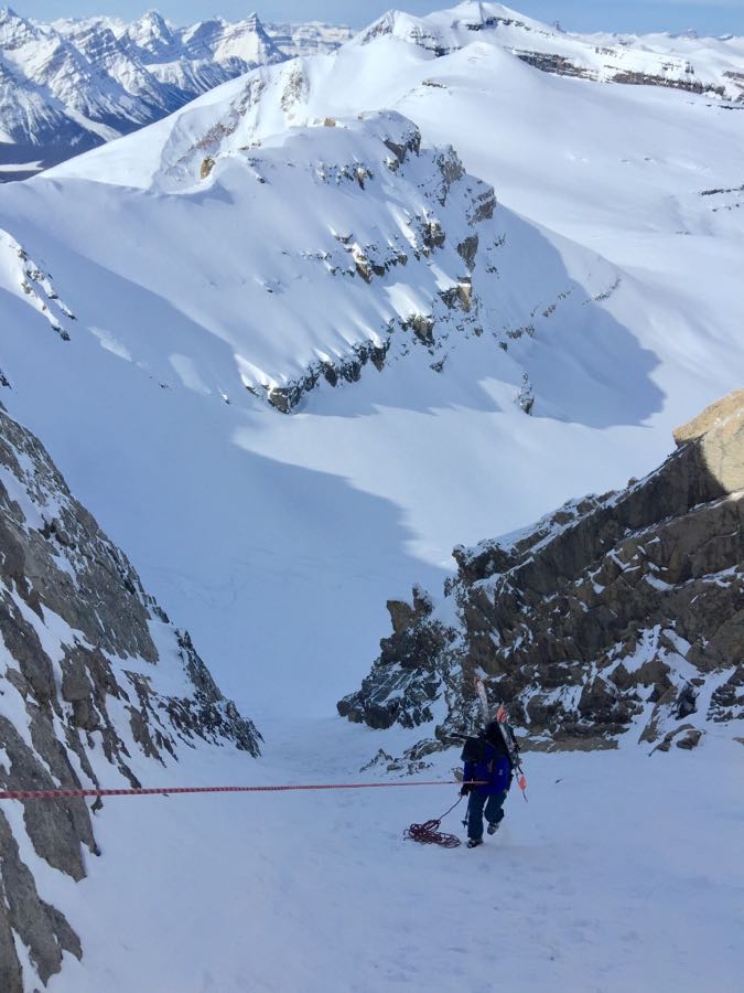 I recommend a 40m rappel down the north couloir if you want to get past the scrappy rock and steep snow to a good place to dig a platform to put your skis on. We made a 30m rappel work for the last person down, but I think it is worth carrying two 40m ropes to allow for a clean lower/rappel. There is actually enough snow to ski the upper 20m or so of the couloir, but there is a 10m section of mixed rock and snow below that.