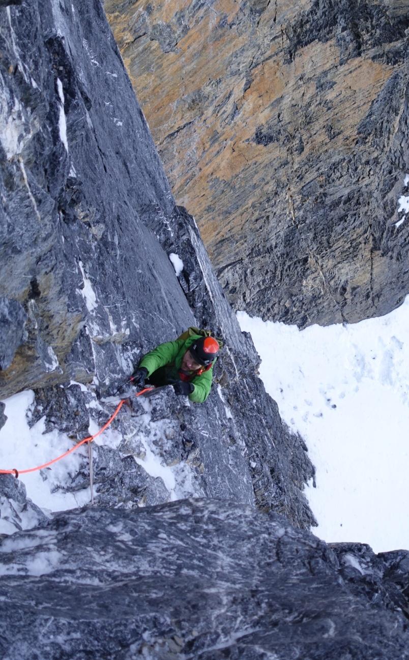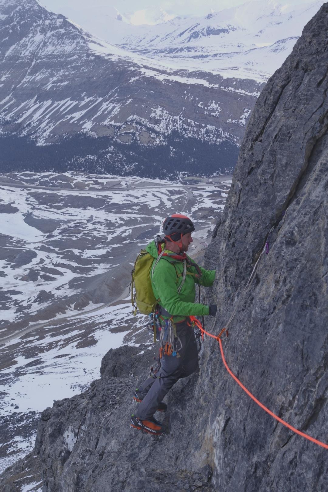The first two ice pitches were not in (likely there in fall) but a moderate traverse in from the left on the first, followed by a moderate step on the second led to the snow bowl and a traverse to a gully up to the main classic 3rd pitch. This pitch features a continuous under-vertical crack which takes good pro and goes at an easy M5. We added an upper pitch out of the junction with the Slawinski Takeda, to a snow walk to a nice flat lunch spot overlooking the AA approach.