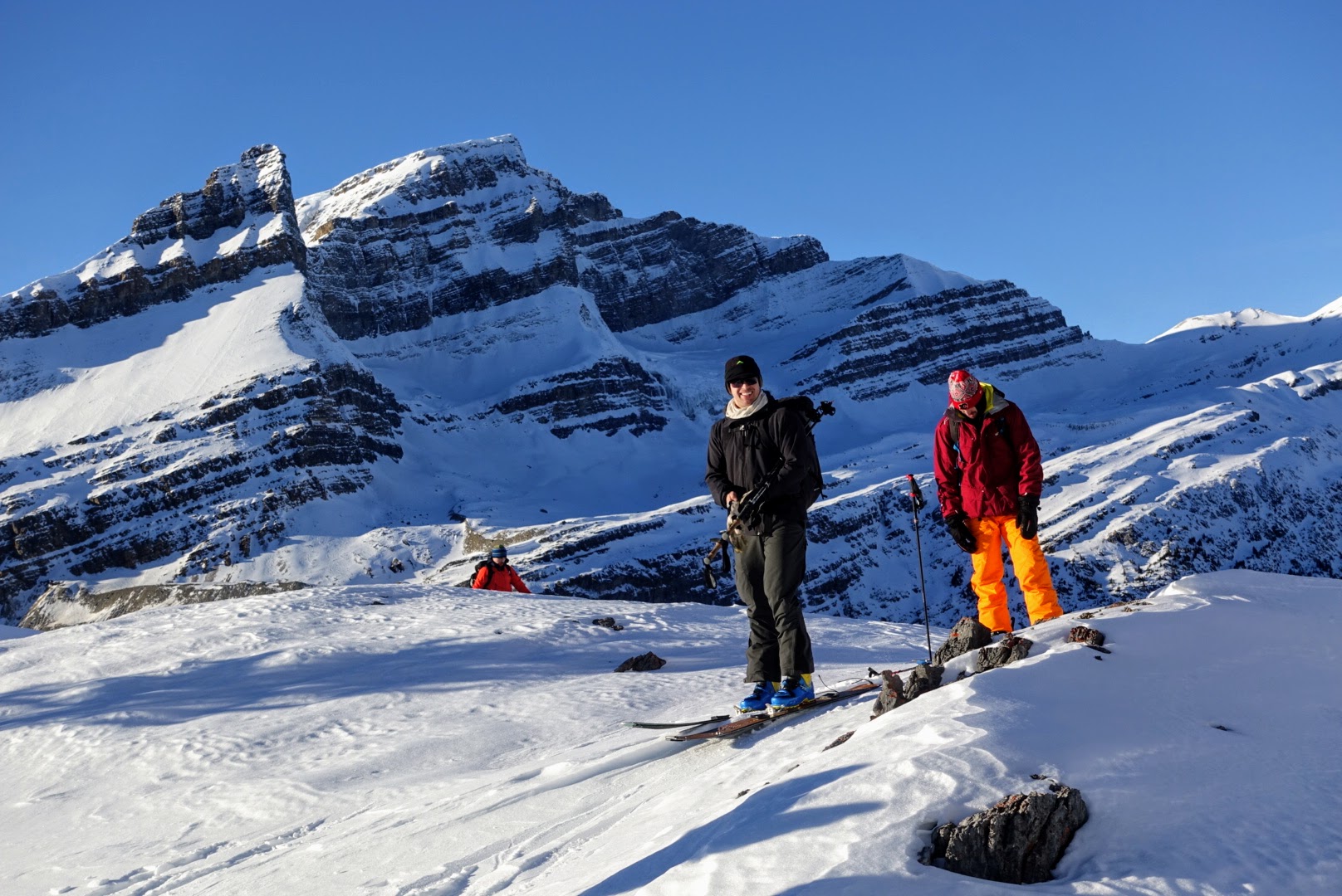 I spent the day ski touring in behind Crowfoot Peak today. A very cold start to the day (-26°) but after busting through the inversion (where temps climbed to -8°C) it proved to be a fine day with clear skies and sunshine. Mind you, we mainly saw the sun from a safe distance in the shaded valleys.