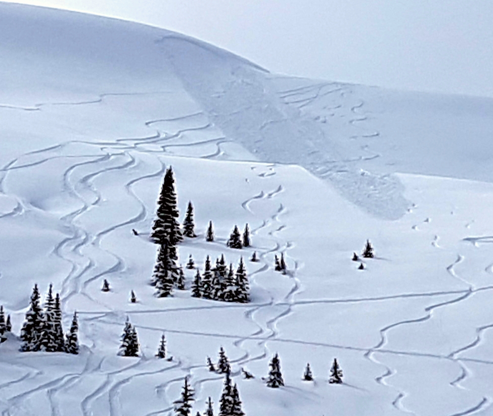 Witnessed a skier triggered size 1.5 avalanche on the obvious roll at the top of flute cruiser which ran quite far. see photo..