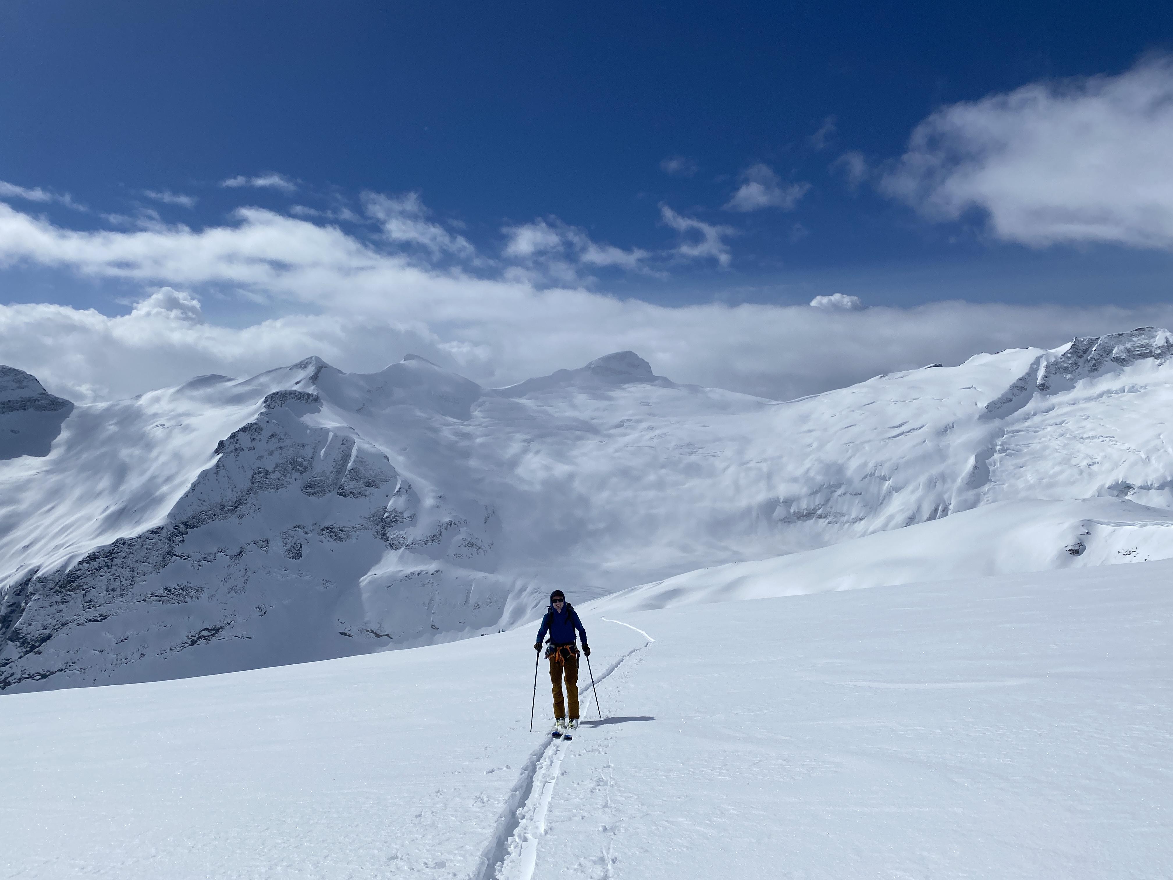 Coverage on all glaciers was 300cm plus. Sags exist in some areas traveled but mostly well bridged. Below 2100m, melt freeze conditions on all aspects and up to ridge top on solars. Glide cracks exist in many areas. Large cornices still exist overhead in the alpine.