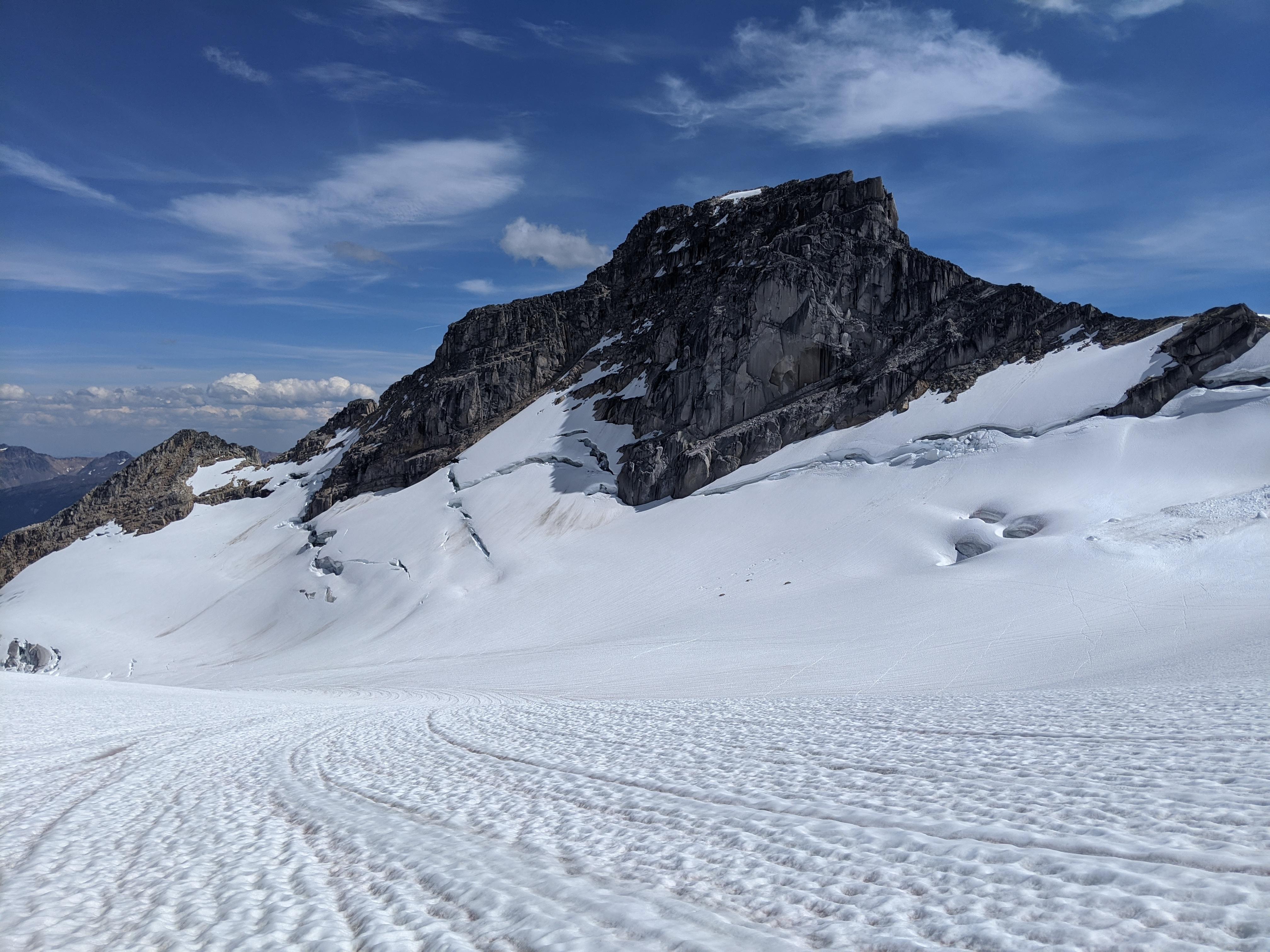 There was still a good amount of snow on the glaciers above 2500m. Despite the lack of overnight freeze, travelling conditions on the glacier were generally easy and supportive. That said, crevasse bridges were weak and opening up. Careful route selection with probing was important. The burgshrund near the West ridge of Pigeon (Vowell glacier side) was changing fast. It was opening up and the bridge was very weak, we did a little detour around the right side (below and West of main crossing) to safely gain the West ridge.