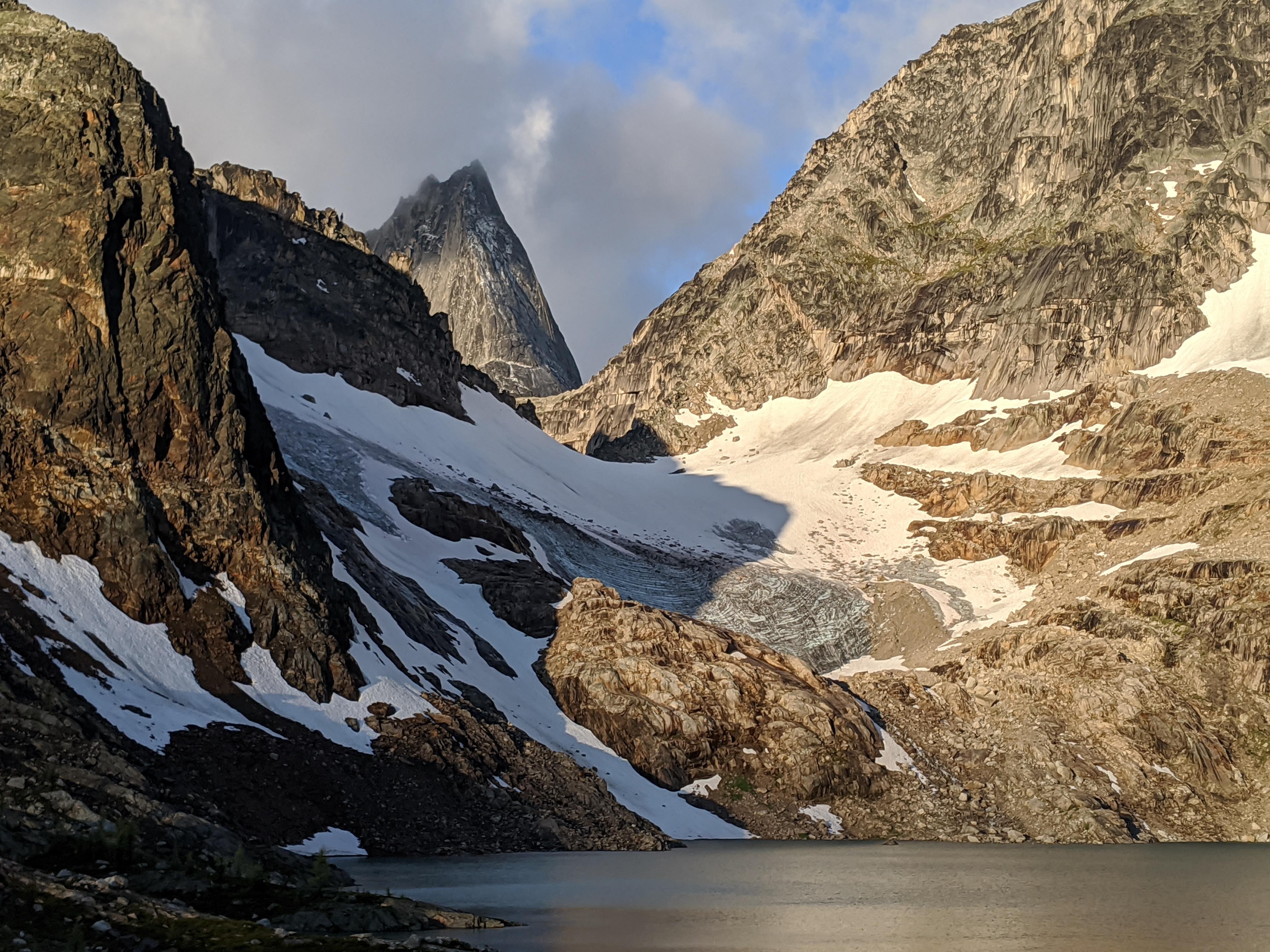 The upper Pigeon fork of the Bugaboo glacier was still mostly snow covered. We descended on the skiers right side of the central nunatak with good coverage. There was a small bare ice section near the exit ramp below the Son of Snowpatch. Although we did not travel through the Bugaboo Snowpatch Col, colleague Alex Geary reported good conditions for this time of year, see photo. The high route from Applebee to Colbalt Lake was mostly snow free and bouldery. The Cobalt glacier was easily descended on snow via the skiers left side. The Cobalt lake trail exit was in great shape.