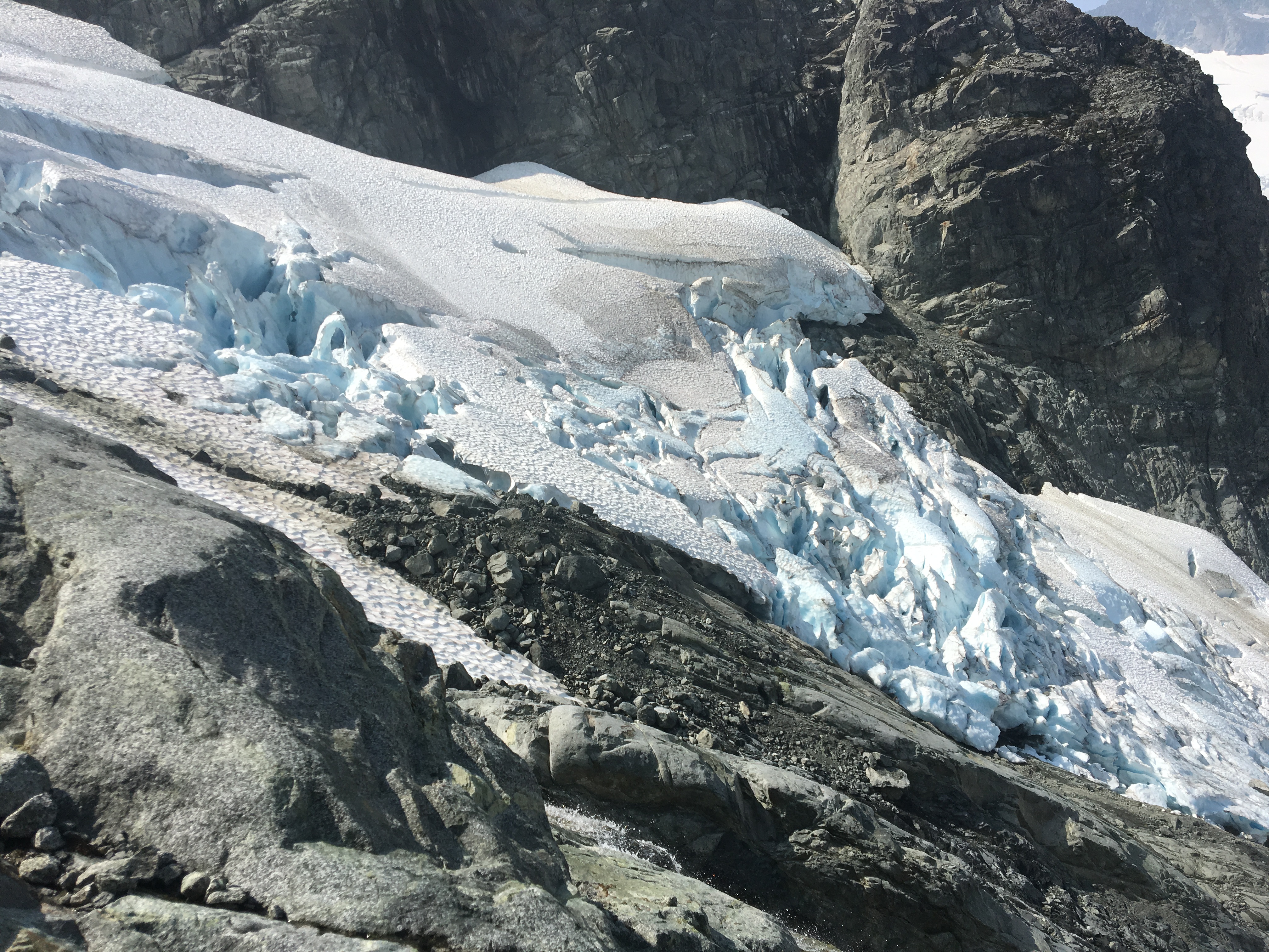I just climbed Alpha Mountain from the Serratus Glacier via the Alpha-Serratus col, and found the glacier below the col very broken with lots of exposed ice (see pin on map and photo attached). There was even more exposed ice and and less snow bridging than last year at the beginning of September. It looked really tricky to navigate in and out of the crevasses and over snow plugs, so we opted to climb the 3rd class slabs on the left that are covered with gravel and boulders. On the plus side, there’s no smoke up here, it’s all below us.