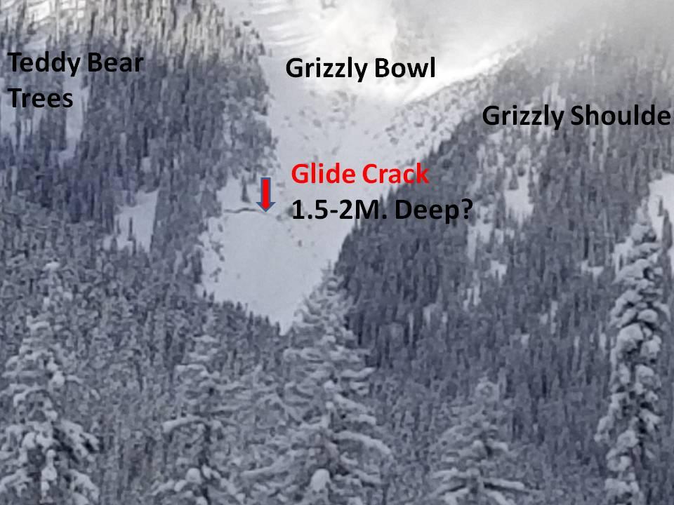 Today I noticed a fresh Glide Crack (this is when the entire snowpack glides on the snow/ground interface) on what is a typical exit from Grizzly bowl via the Teddy bears trees (see photo).