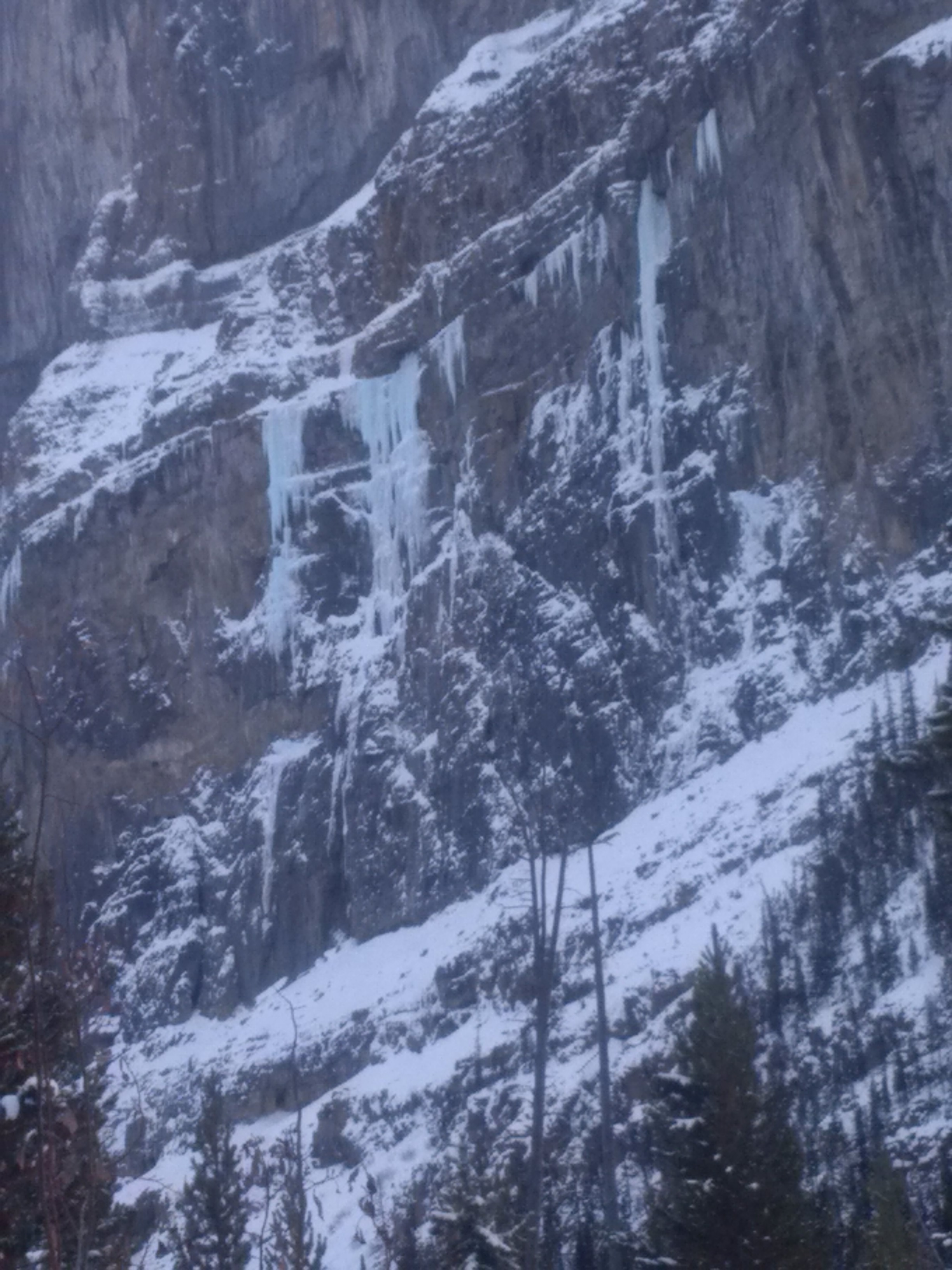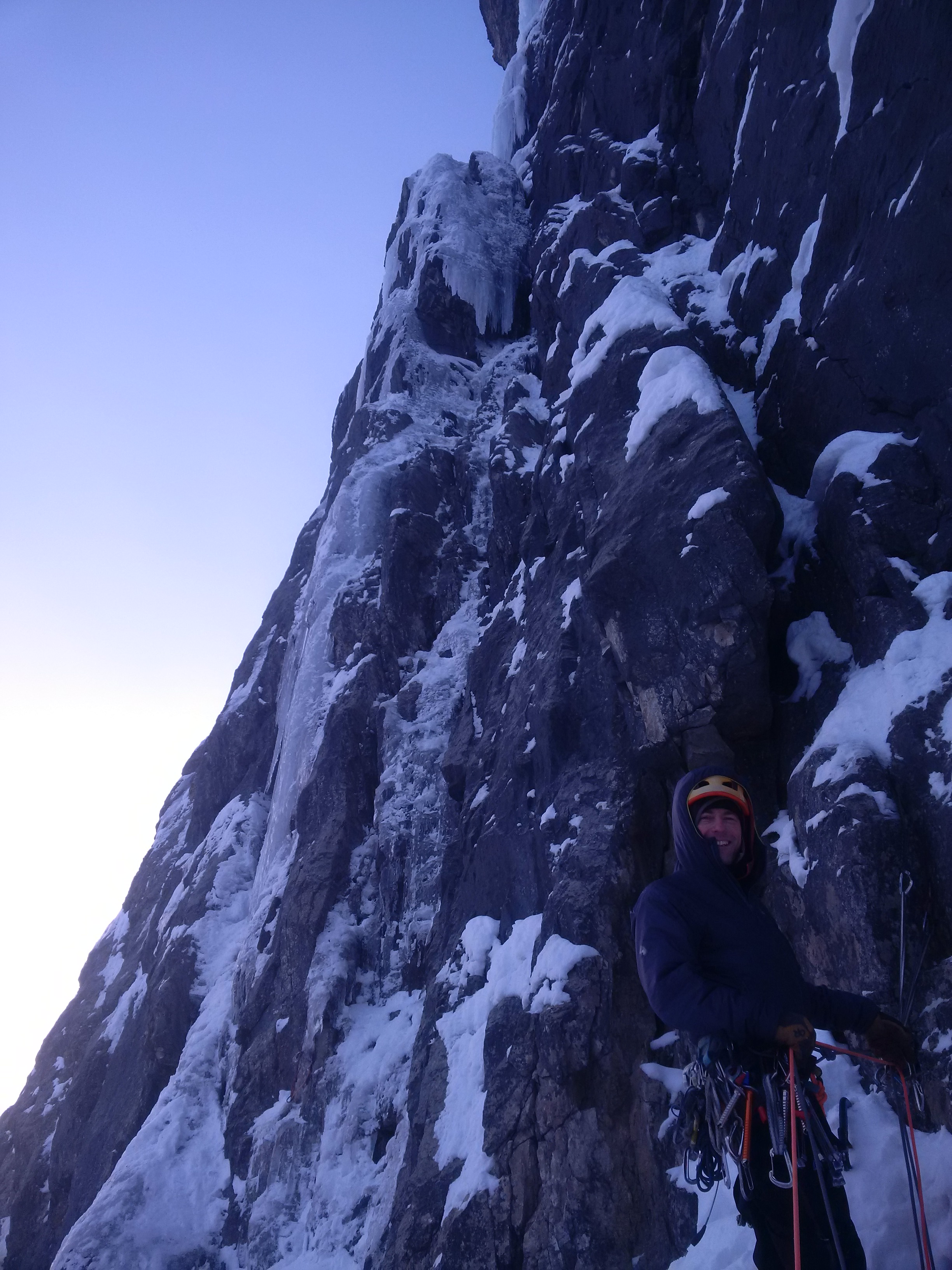 The lower pitches were a mix of rock and thin ice which is delaminating in places‎. Stubbies and rock gear protected it well. The upper ice pitches were harder than they looked with a section of hollow sounding ice, but probably only WI 5+ in current conditions.