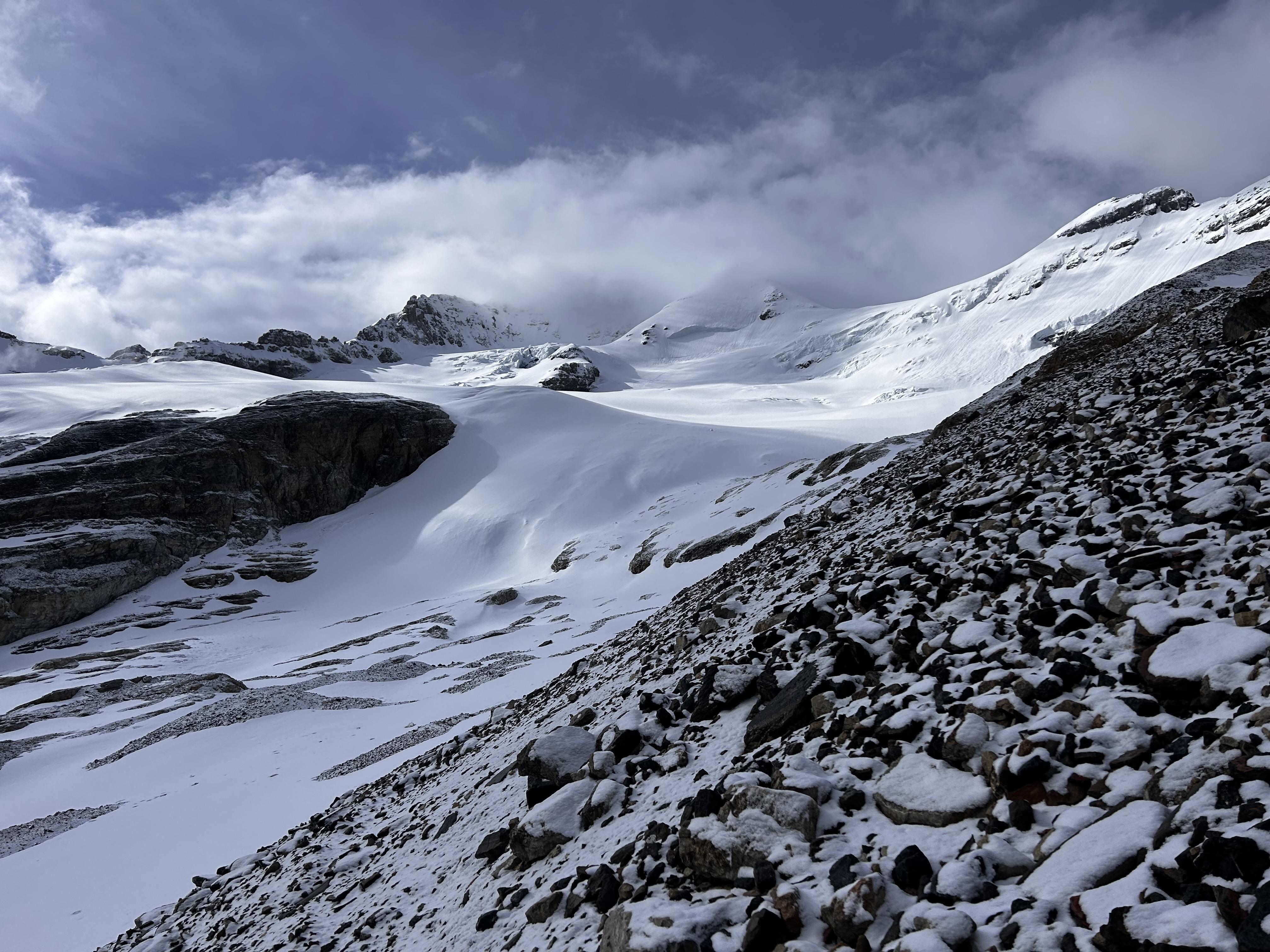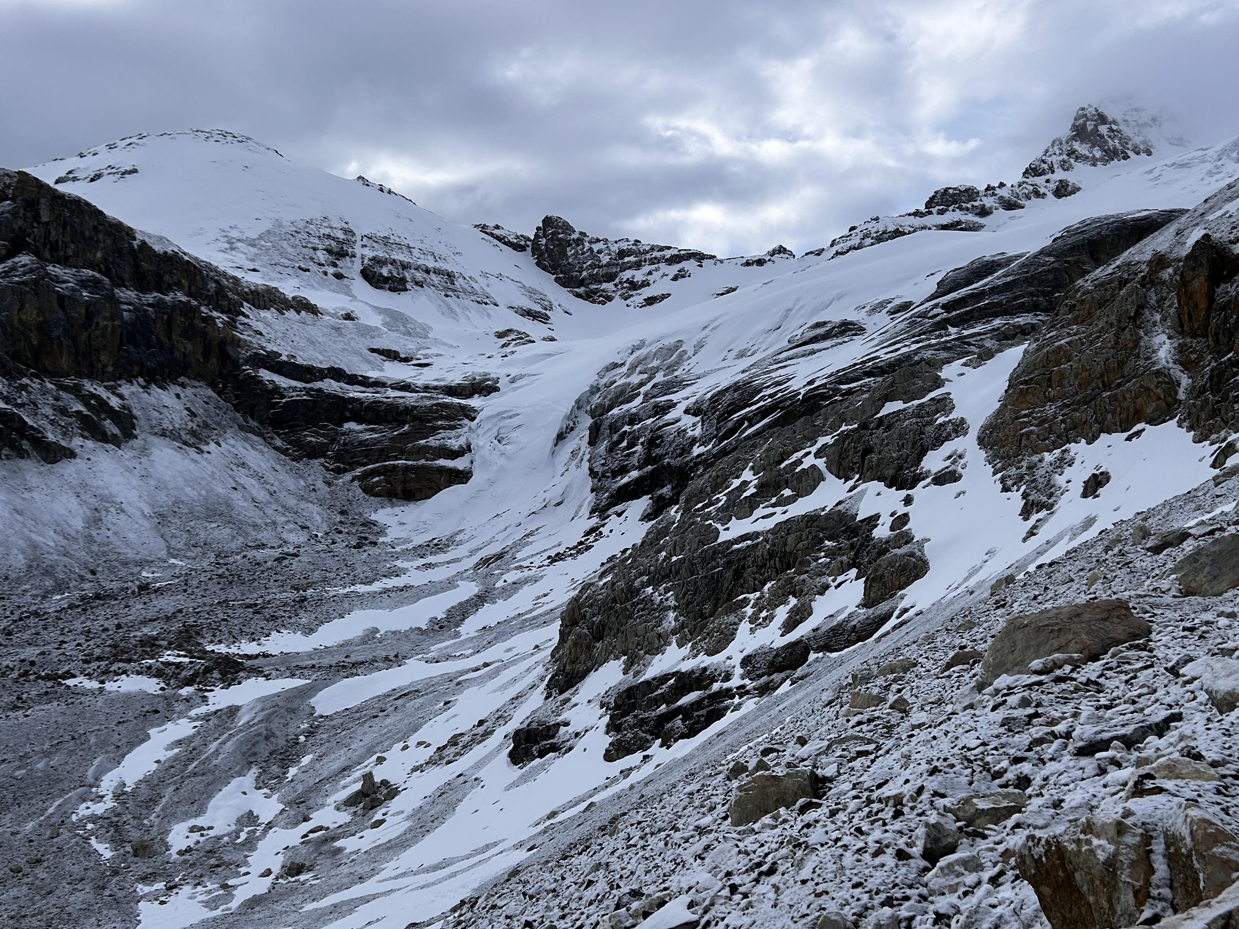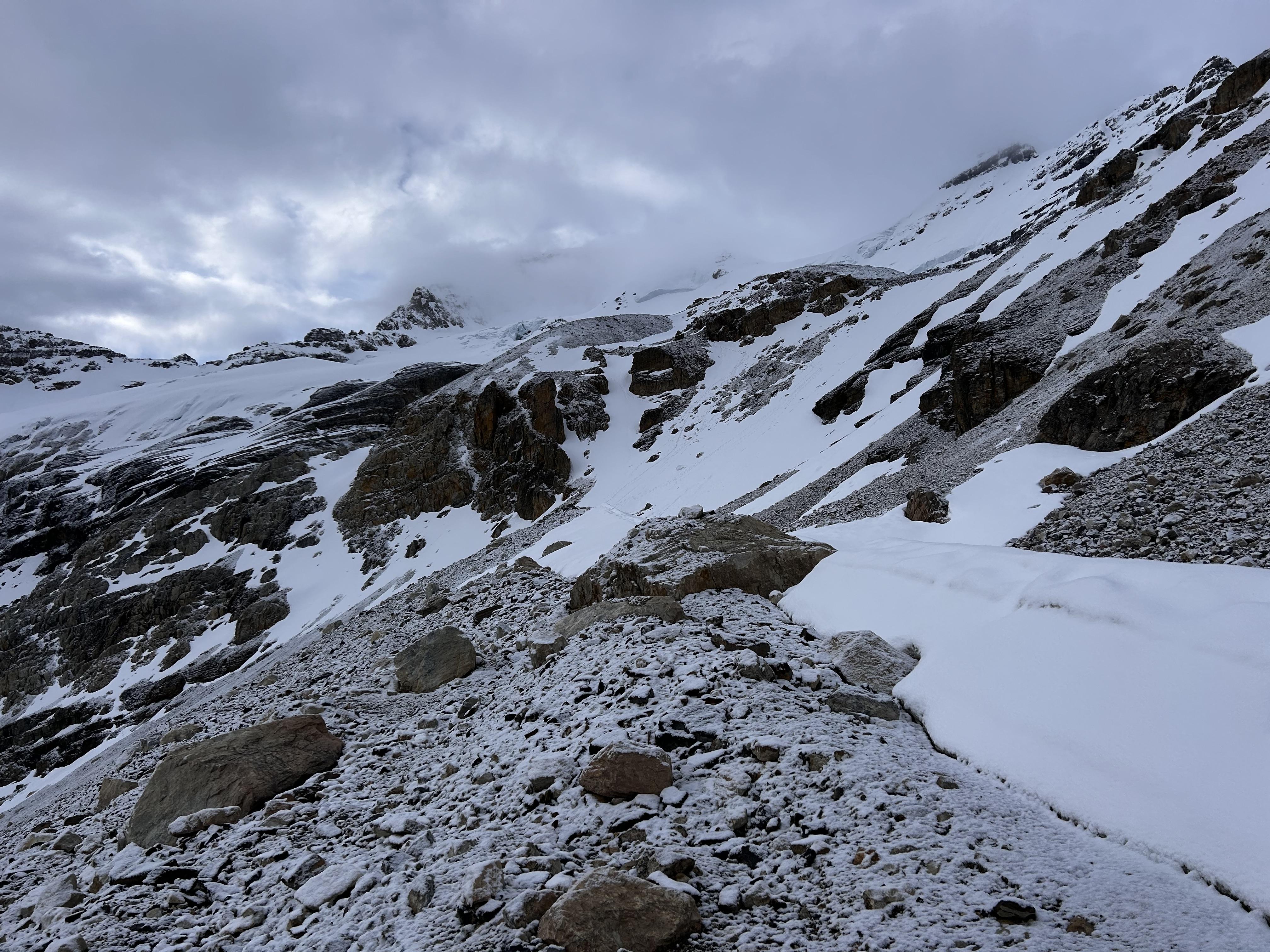 15 cm of recent storm snow atop a firm surface. Good snow travel on the moraines and glaciers until we stepped off snow at about 1 PM. I probed 175cm of snow at 2700 m.