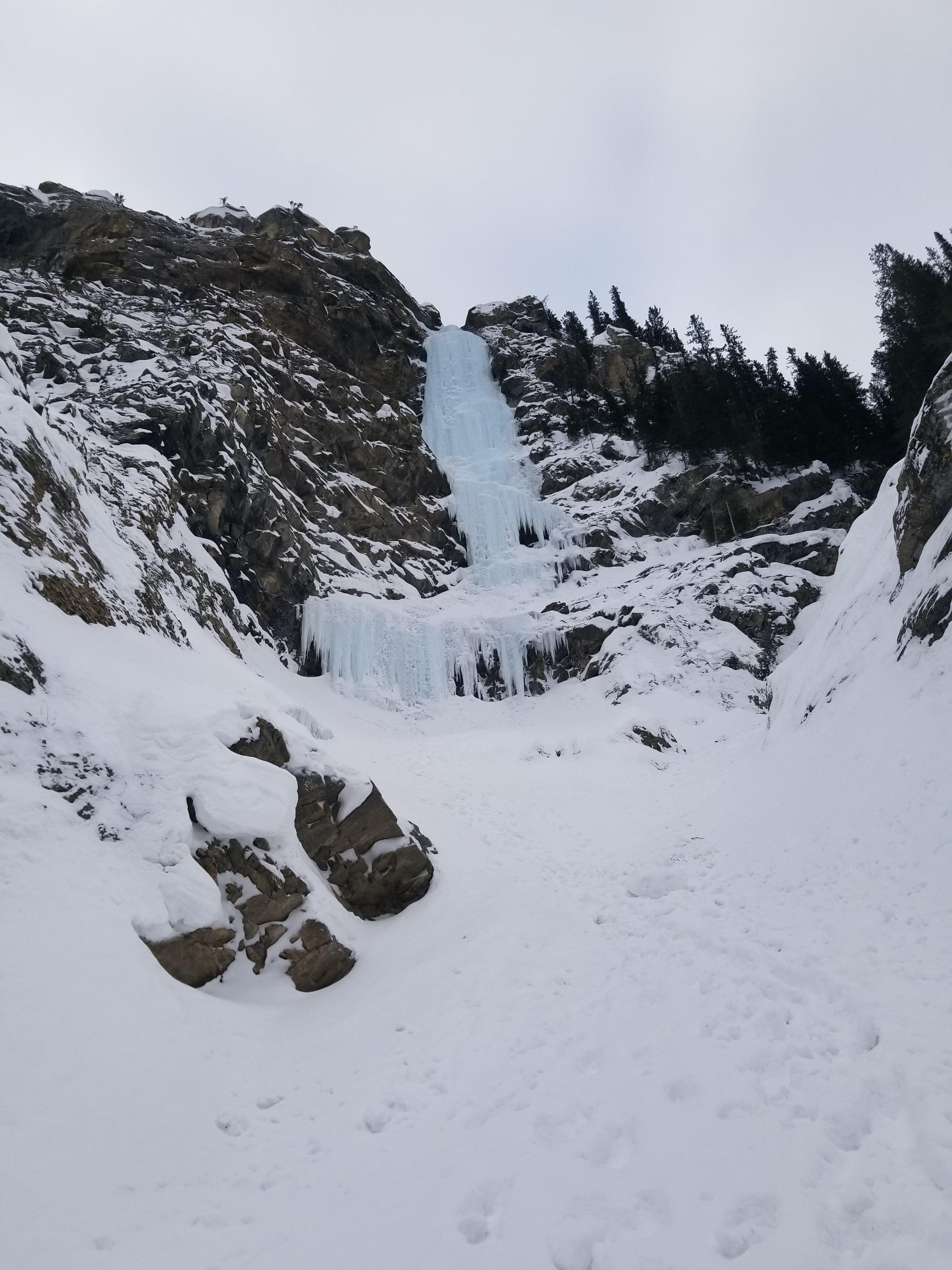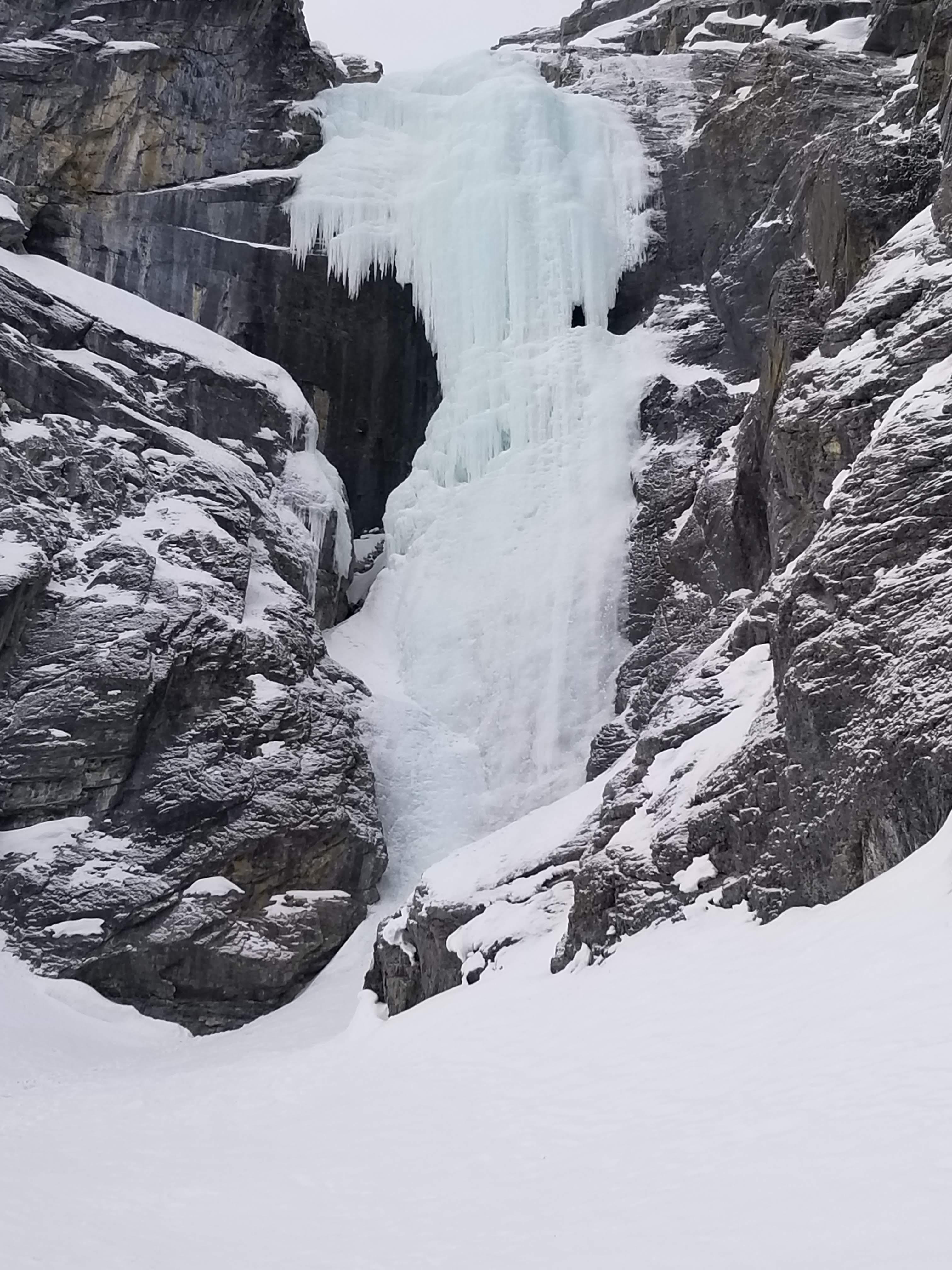 - Kicking Horse river is well frozen allowing for a shorter approach from the chain-up parking on the TCH.