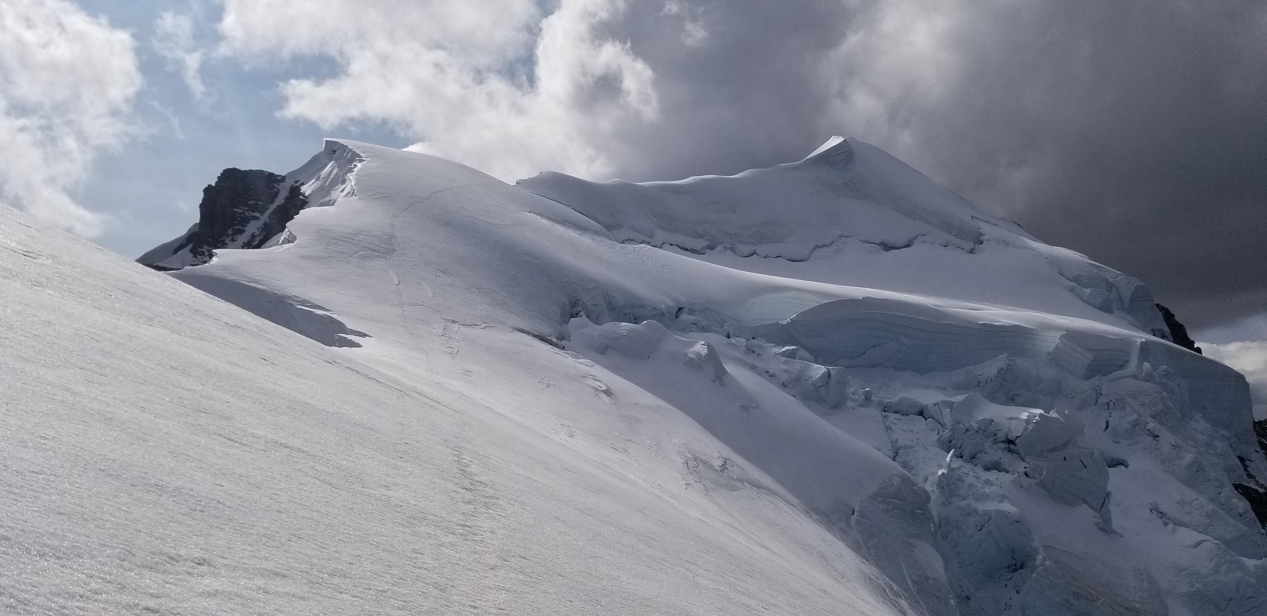 Climbed the East Ridge today with Conrad Janzen in great conditions. Had to cross a couple of snow patches on the traverse to the black towers. There were only a couple of places to fill water (and not very quickly!). The pitches in the black towers are mainly dry. The summit ridge was good footing today, but is best done with steel crampons. There is some uncertainty as to where the cornice line is currently, which will force climbers to go onto steeper, icy terrain. Only 2 noticeable crevasses were encountered, and both were easily crossed on frozen snow.