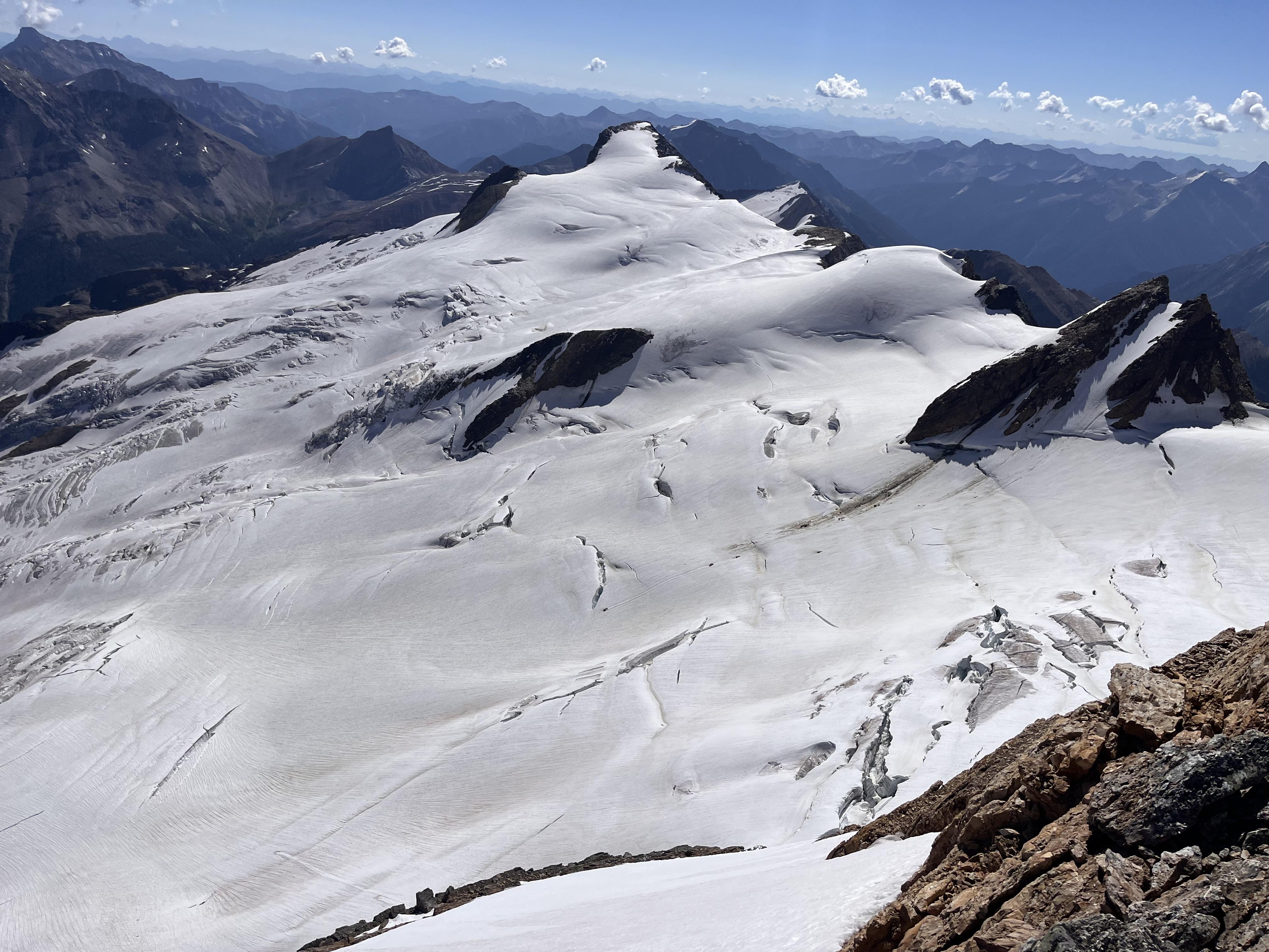 Just returned from a 3 day trip to Commander Glacier. We approached via Farnham Creek FSR, and bivied at 2050m below the Commander Glacier. We summited Commander Mountain and The Cleaver on July 29th. Despite a lack of an overnight freeze we found excellent travel on firm snow and good coverage above 2950m. The snow was a bit slushy near the firm line but only for a short distance. We stayed high and traversed just below the upper glaciel plateau. No issues with crevasses or bergschrunds.