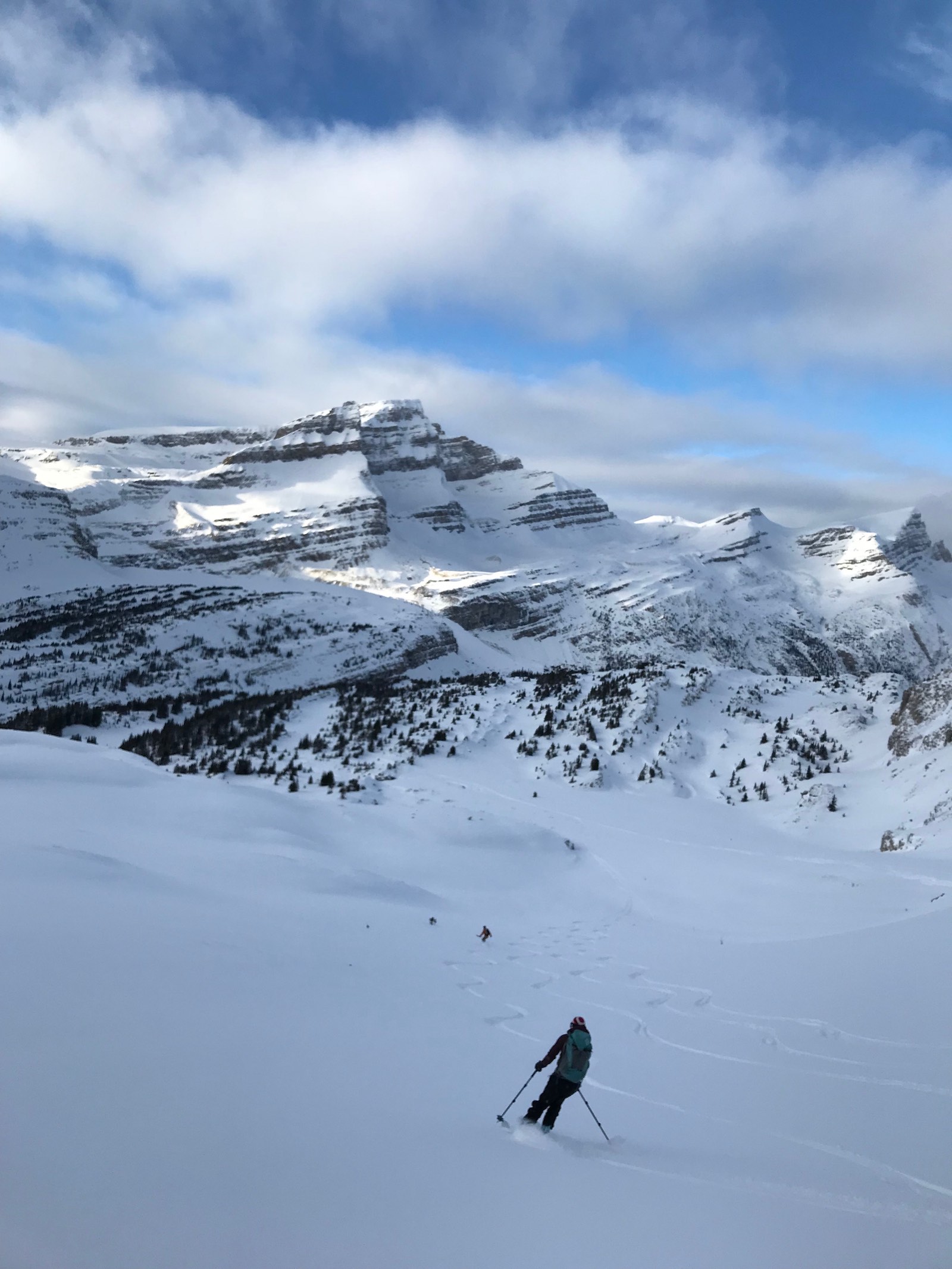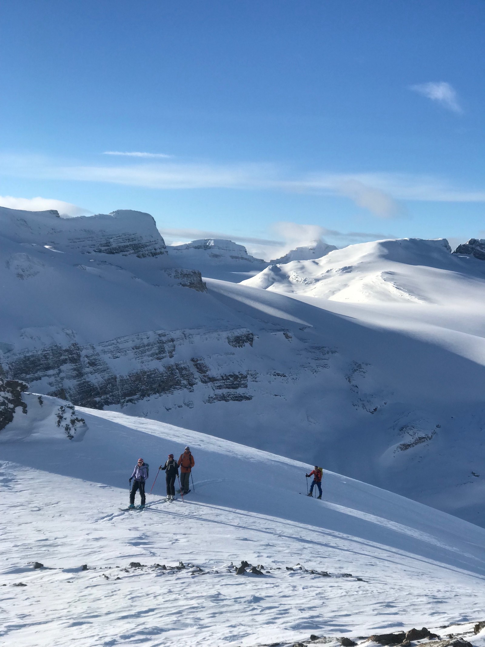 Skied Little Crowfoot today with a group of 5. -8 deg. C. at Bow Lake parking and -15 deg. C. on the summit. HS 195cm @2750m on approach below the summit.