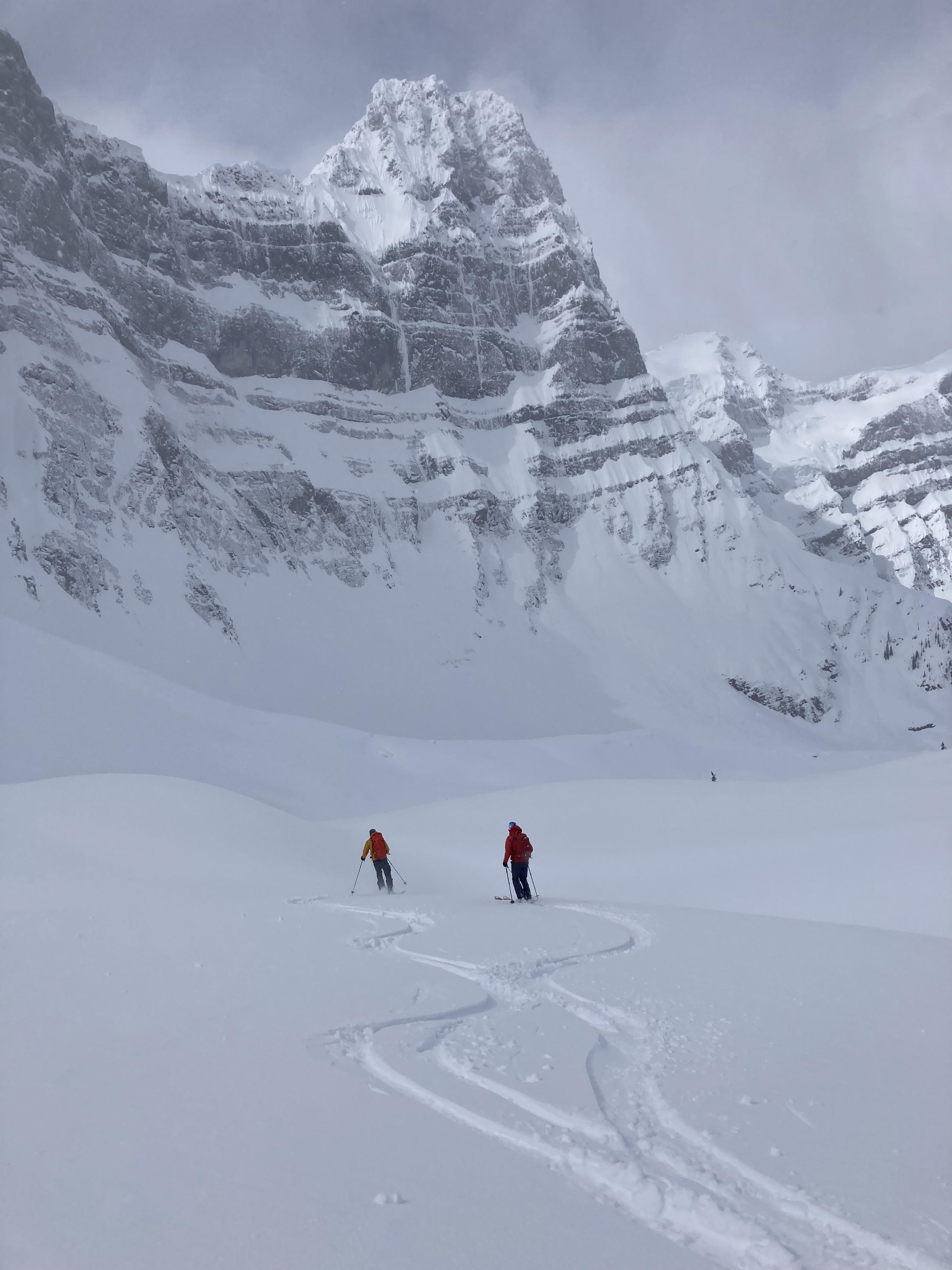 We had fast travel and good skiing on the Mistaya traverse. Our loop went south to north from Waterfowl Campground to Cirque Lake, then over the pass to Chephren Lake and out. Above Cirque lake (1800m) there was 110cms snow. We found a supportive crust from top to bottom throughout the day and good ice coverage on all of the lakes. Watch for a few patches of melting ice along the shore of Waterfowl.