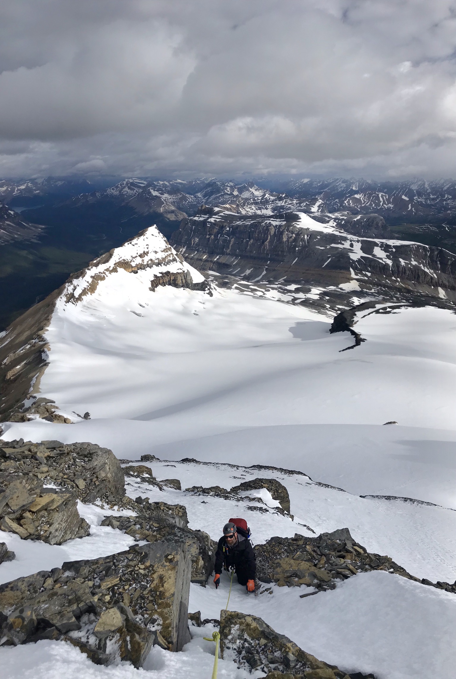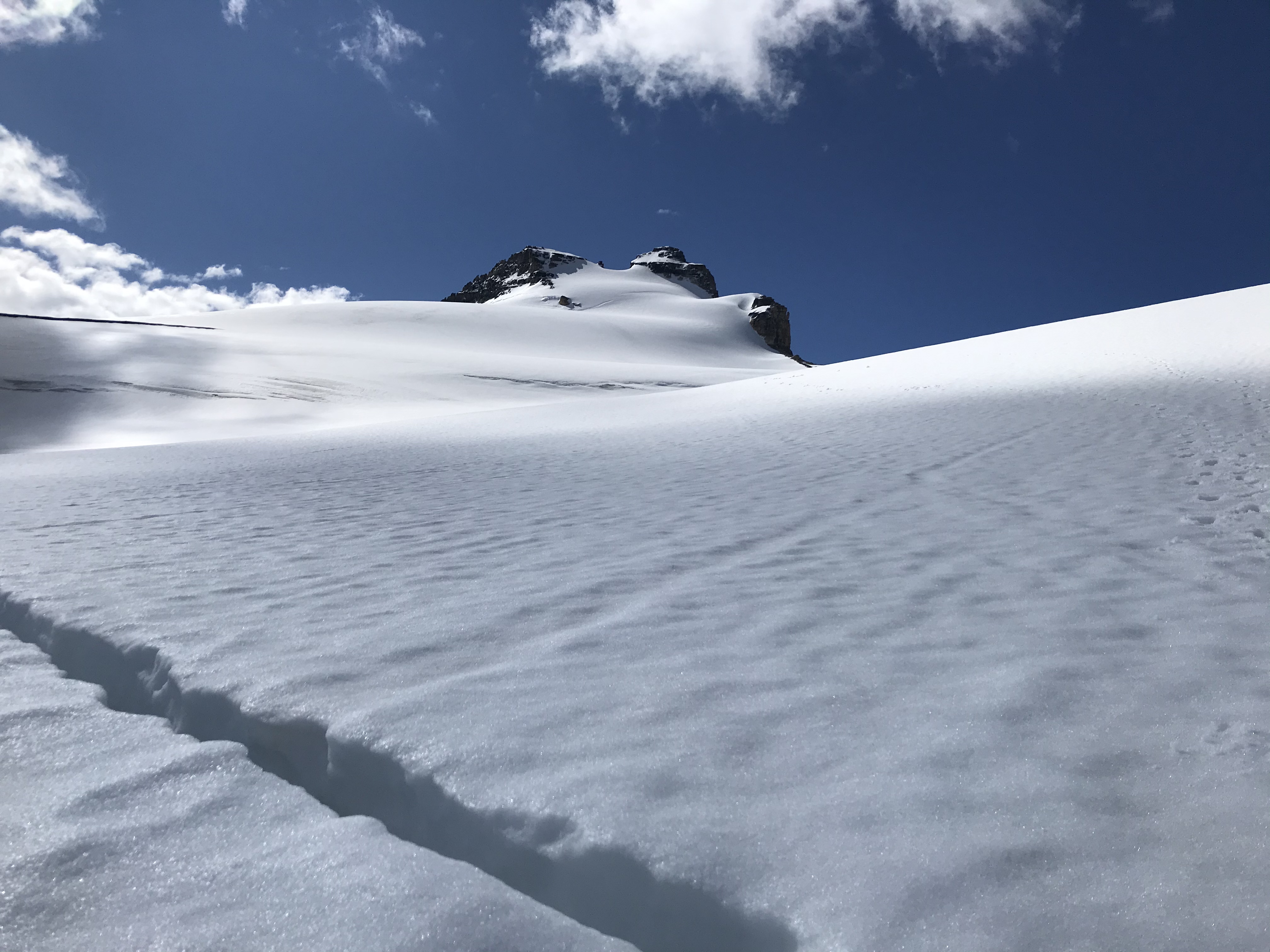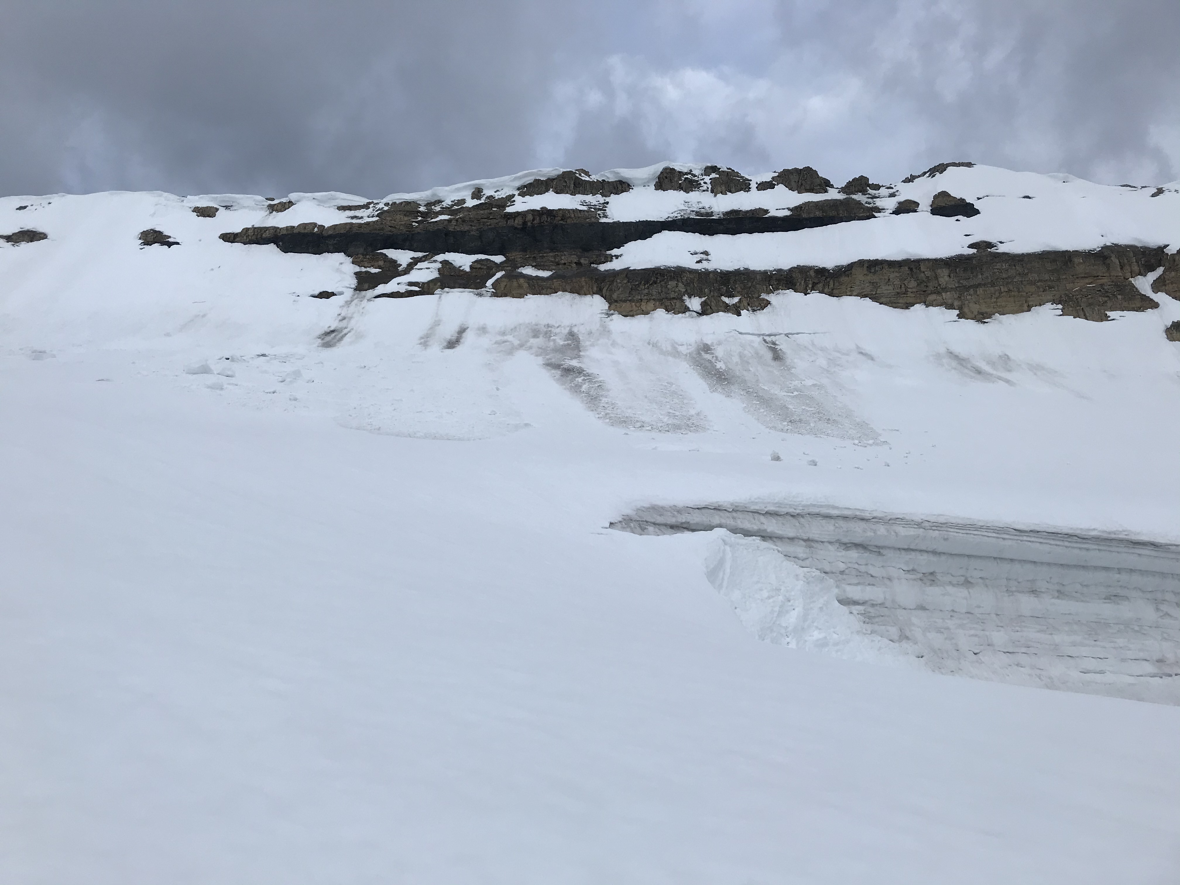 Guided an ascent on Mt. Hector today. We found great travel on the north glacier en route to the summit. Average snow depth was around 160cm with some sections higher up that were only holding 30cm. Some crevasses are starting to open up, while many others have visible sagging. Crampons were useful above 2900m where a melt freeze surface crust was encountered. We did bring avalanche gear and were very happy with the firm conditions we had today. No new avalanches were observed, though many old point releases were visible in the steep east (ENE) facing terrain between Hector and Little Hector (mostly solar triggered but some cornice trigger). Doing a bit of research before the trip, we heard of some loose wet avalanches in the area on polar aspects but did not see any signs of instability on the polar aspects we were on today. Still enough snow lingering around in many areas keep in tune with changing conditions and your avalanche danger. Timing is everything so do your research, be prepared, wake up early, finish early, and have some good plan B’s. We were back at the car just as the rain showed up.