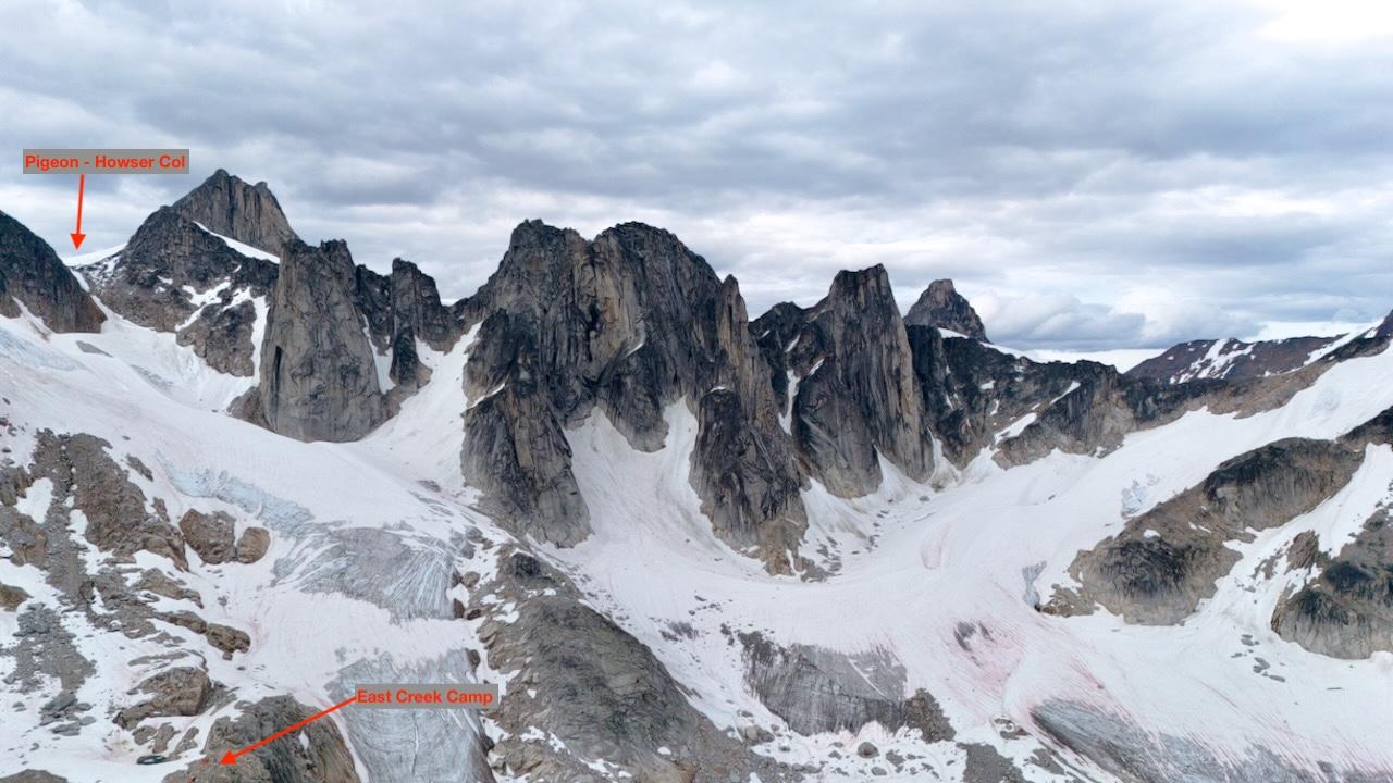 Just back from three days in the East Creek Basin. Travel through the Pigeon - Howser Col is still pretty good with only a couple of short sections on rock/gravel. It is melting out fast and will be challenging once the snow is gone.